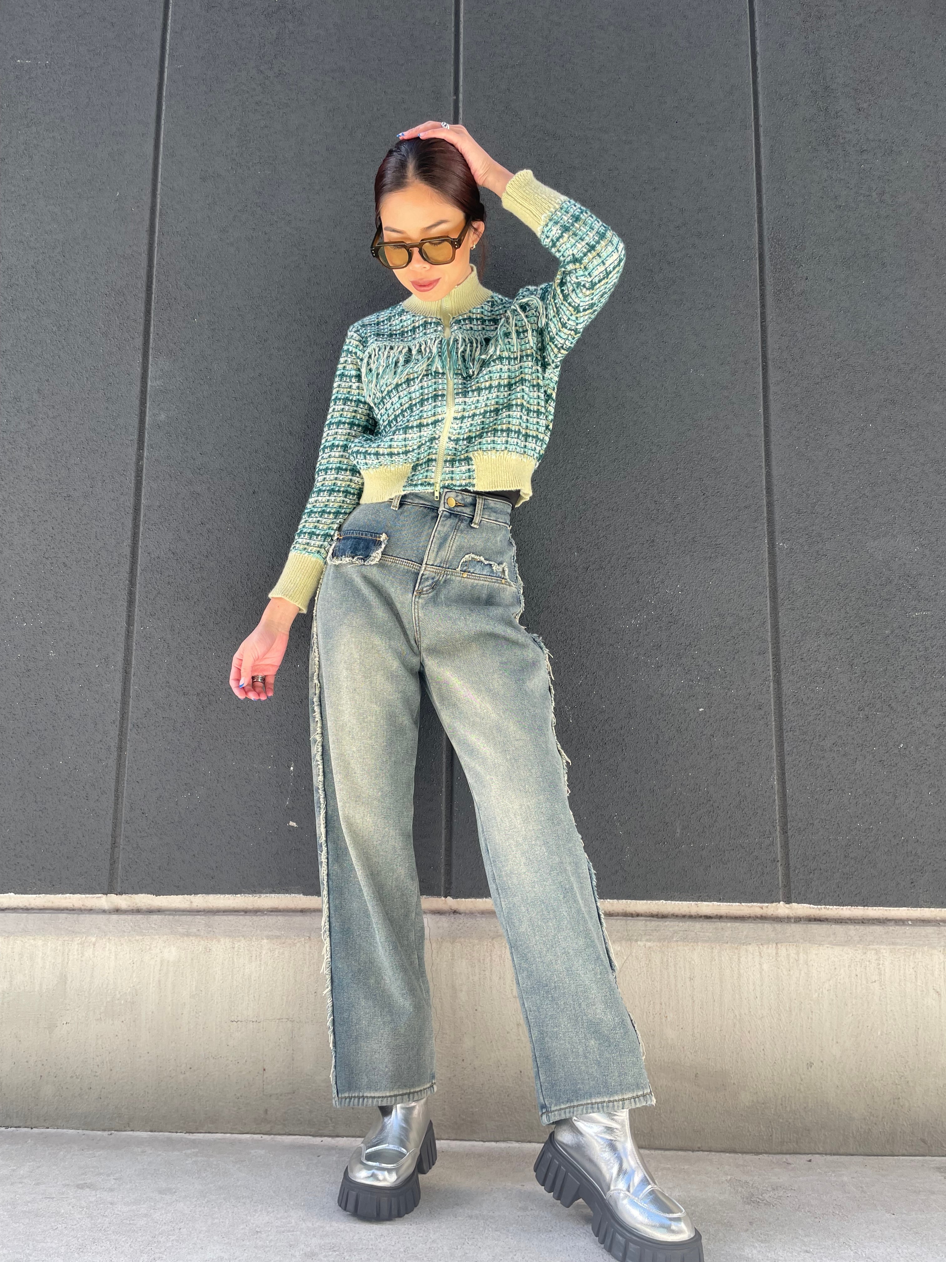 mix green zip knit jacket tops ニット ジャケット ハイネック ジップ チェック グリーン