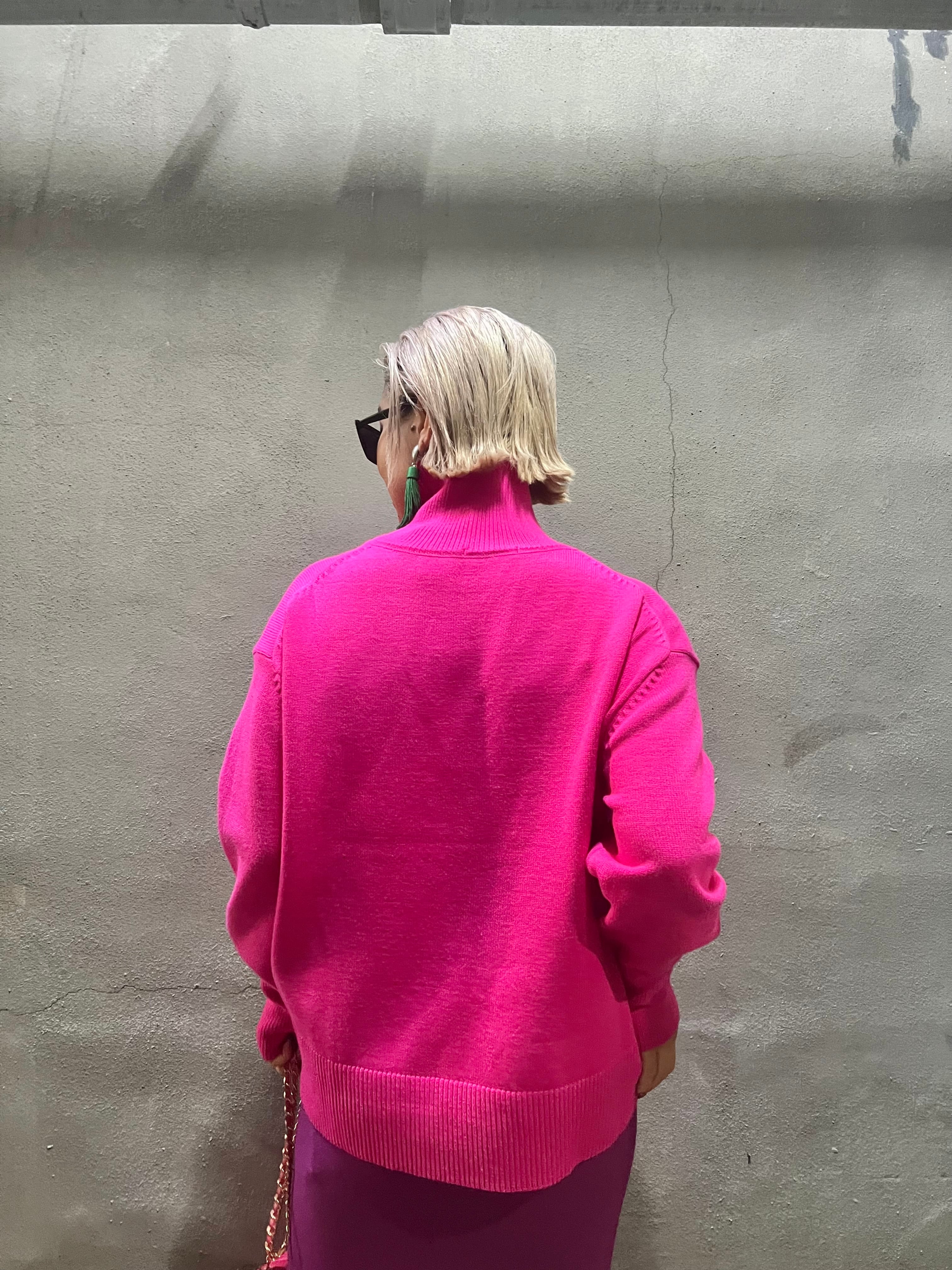 高いネックラインと、温かみのあるカラフルなニットトップスセーターです。