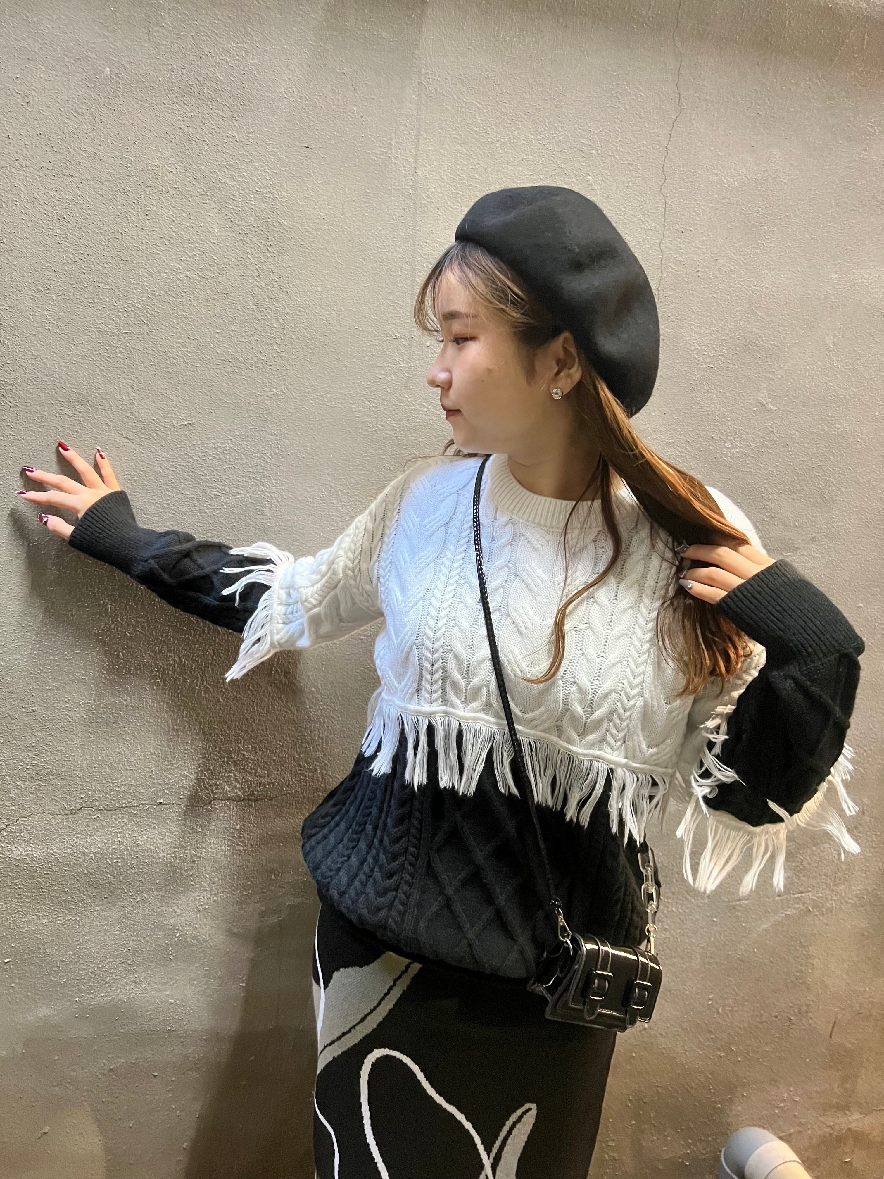 bi-color × fringe design cable knit tops ニット トップス セーター ケーブルニット バイカラー 白黒 フリンジ