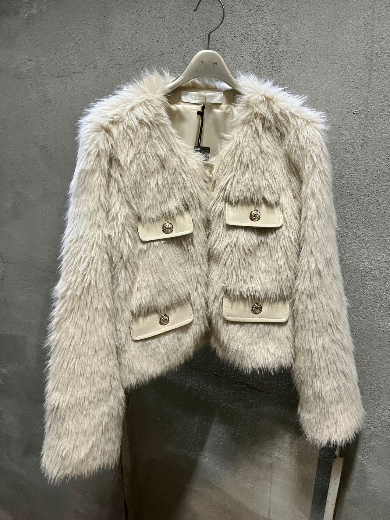 eco far × fake leather trimming C-neck design jacket ジャケット ファー エコファー フェイクファー 合皮 金ボタン ふわふわ