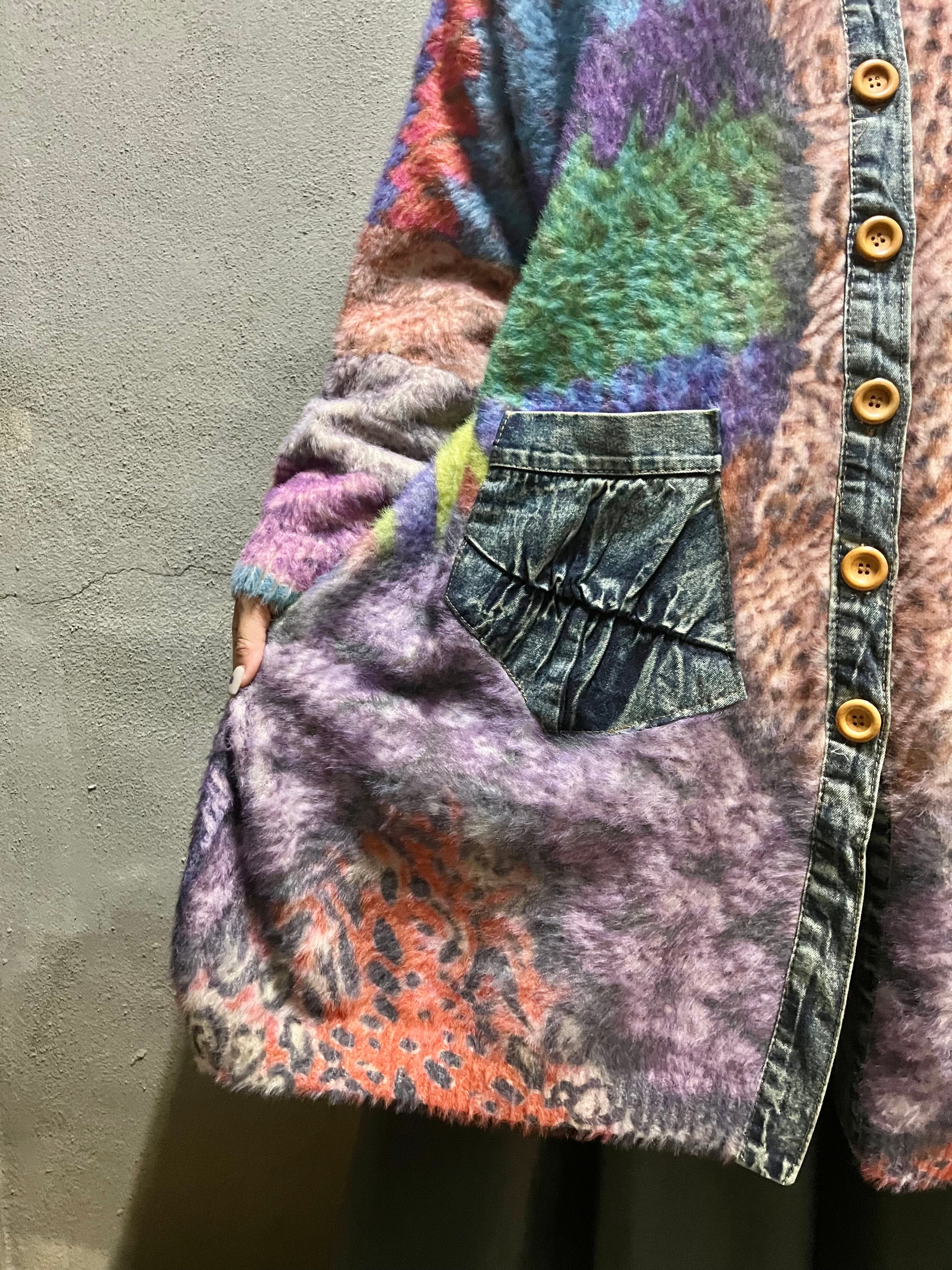 デニム素材とカラフルな絵柄が特徴のニットコートです。