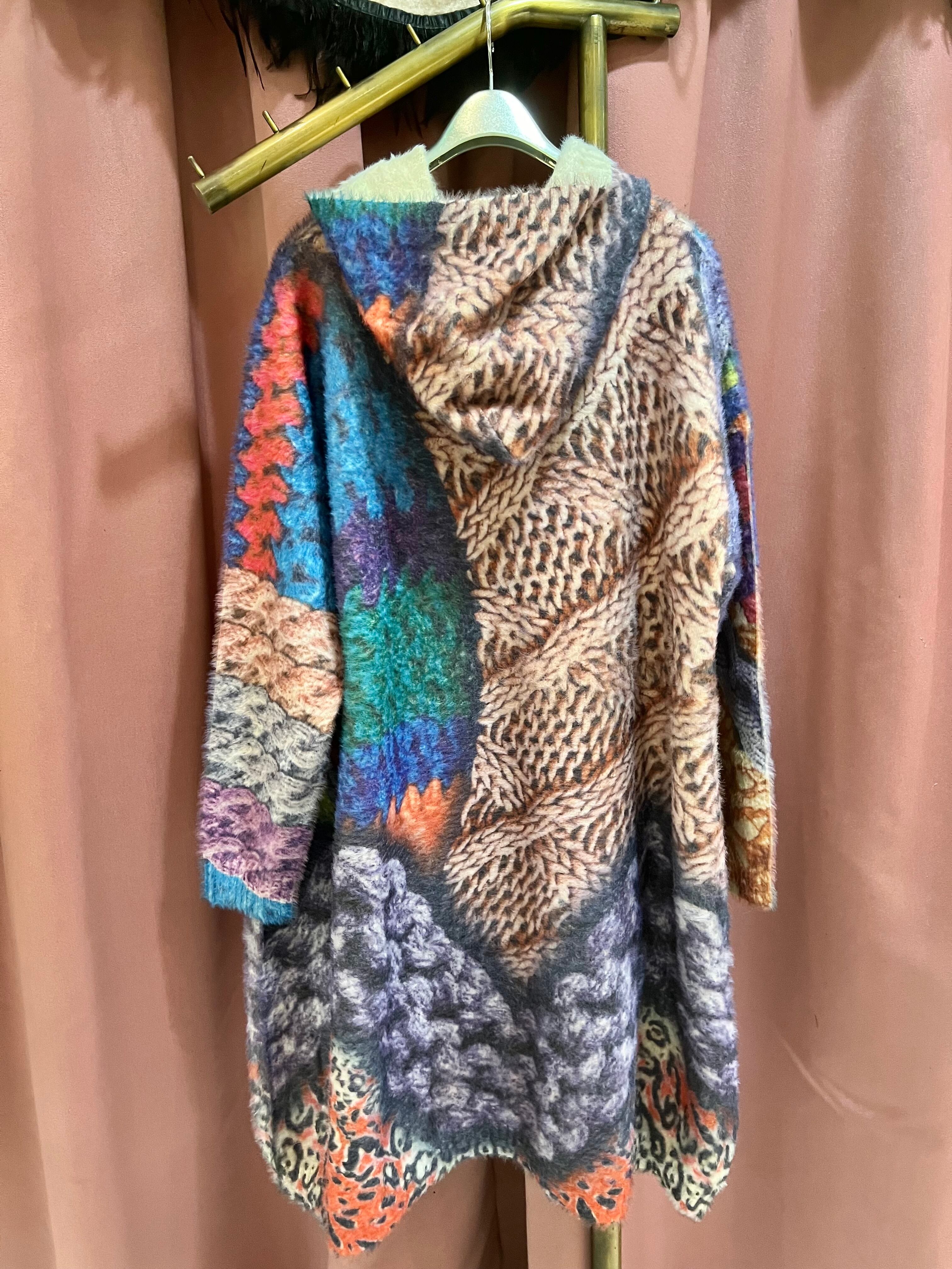 denim × colorful print knit hoodie coat コート ロングジャケット フーディー フード デニム ニット柄