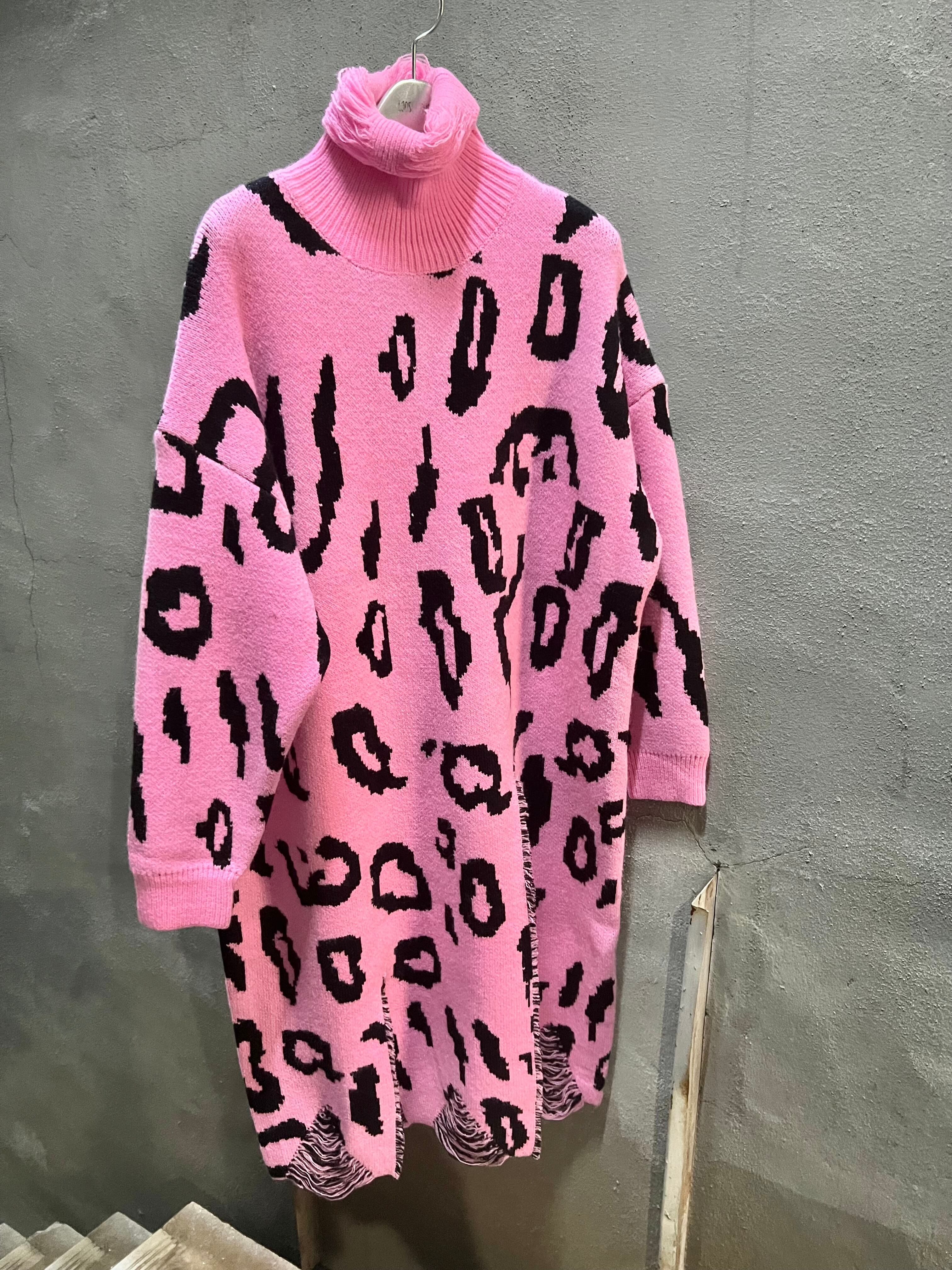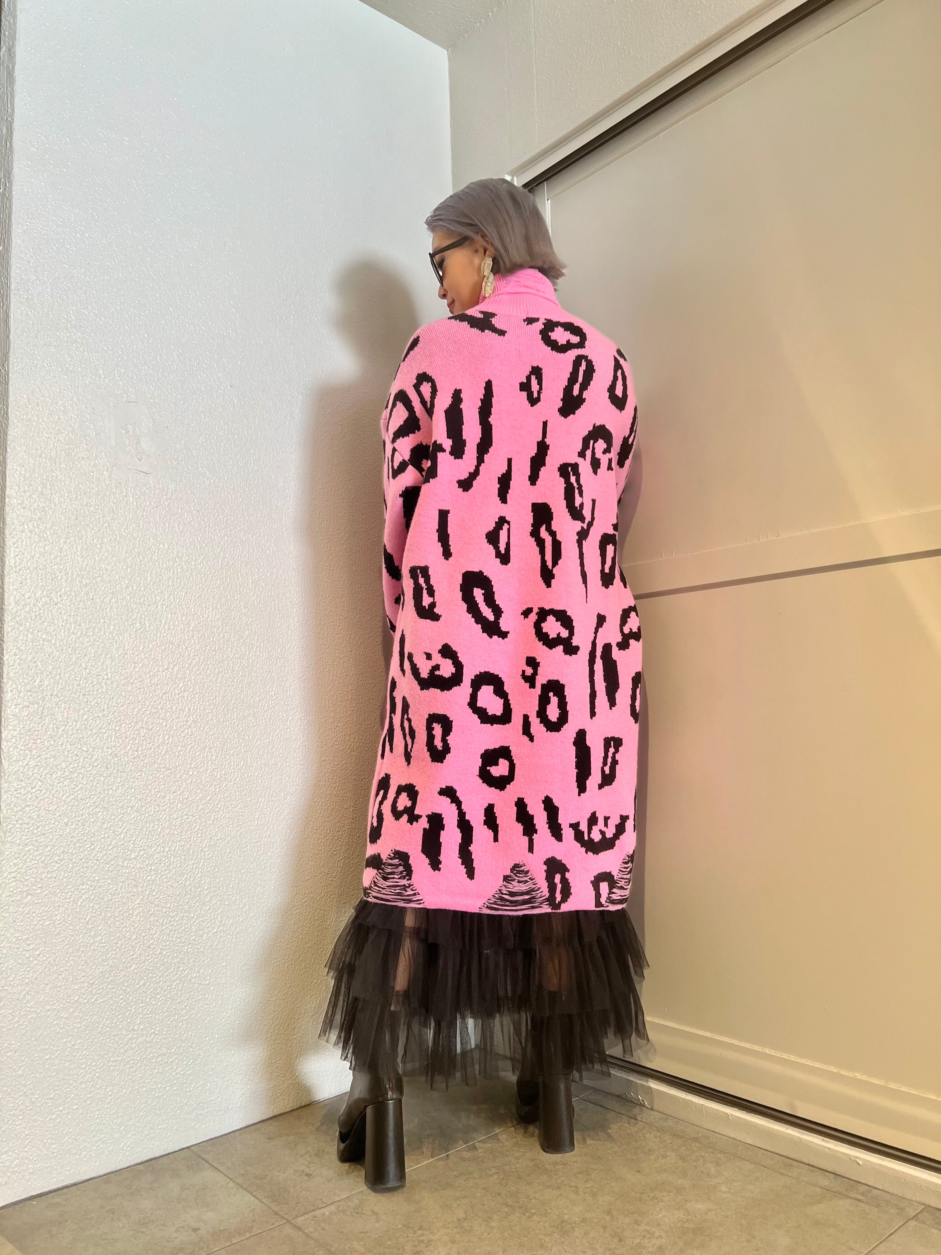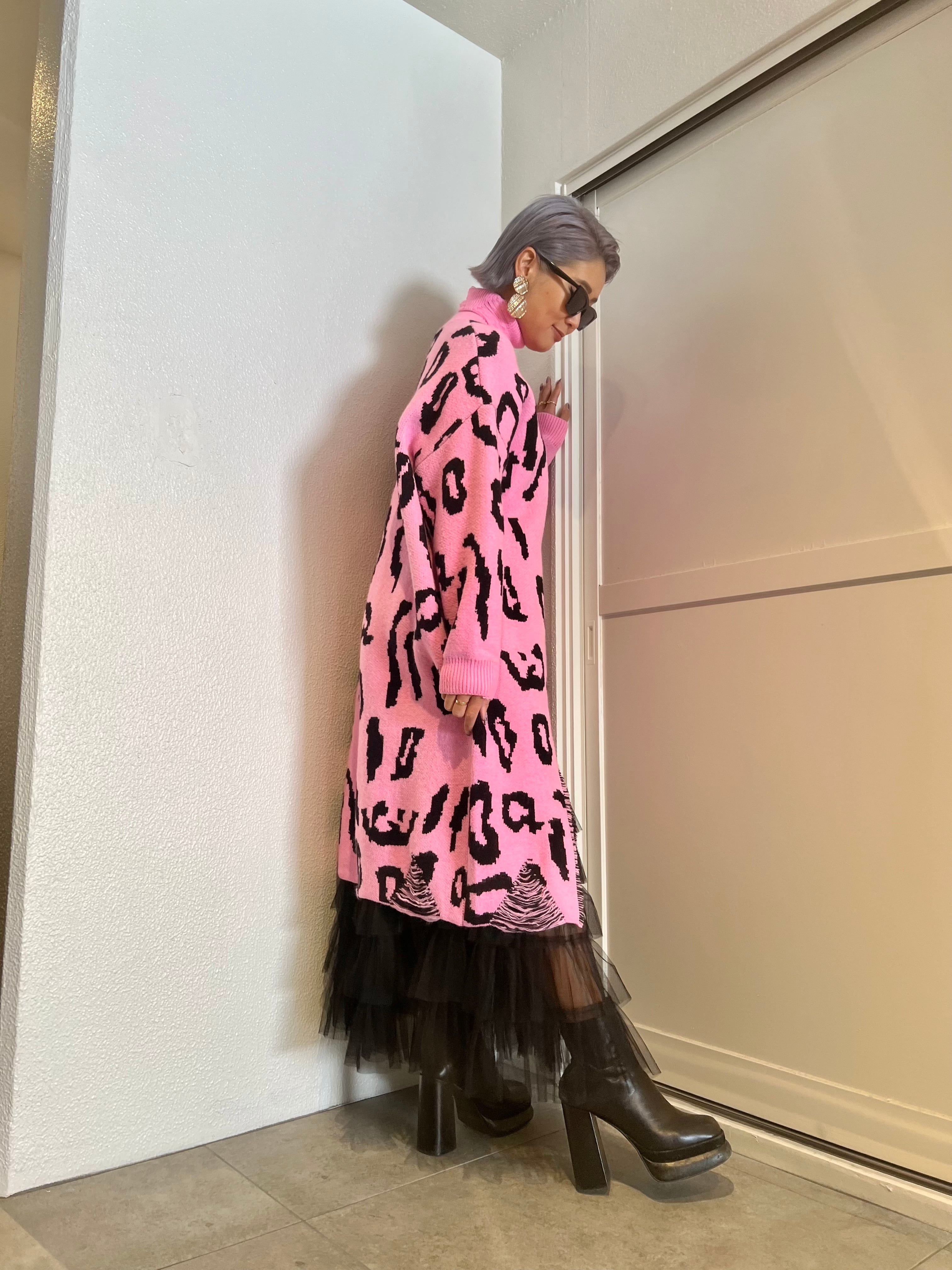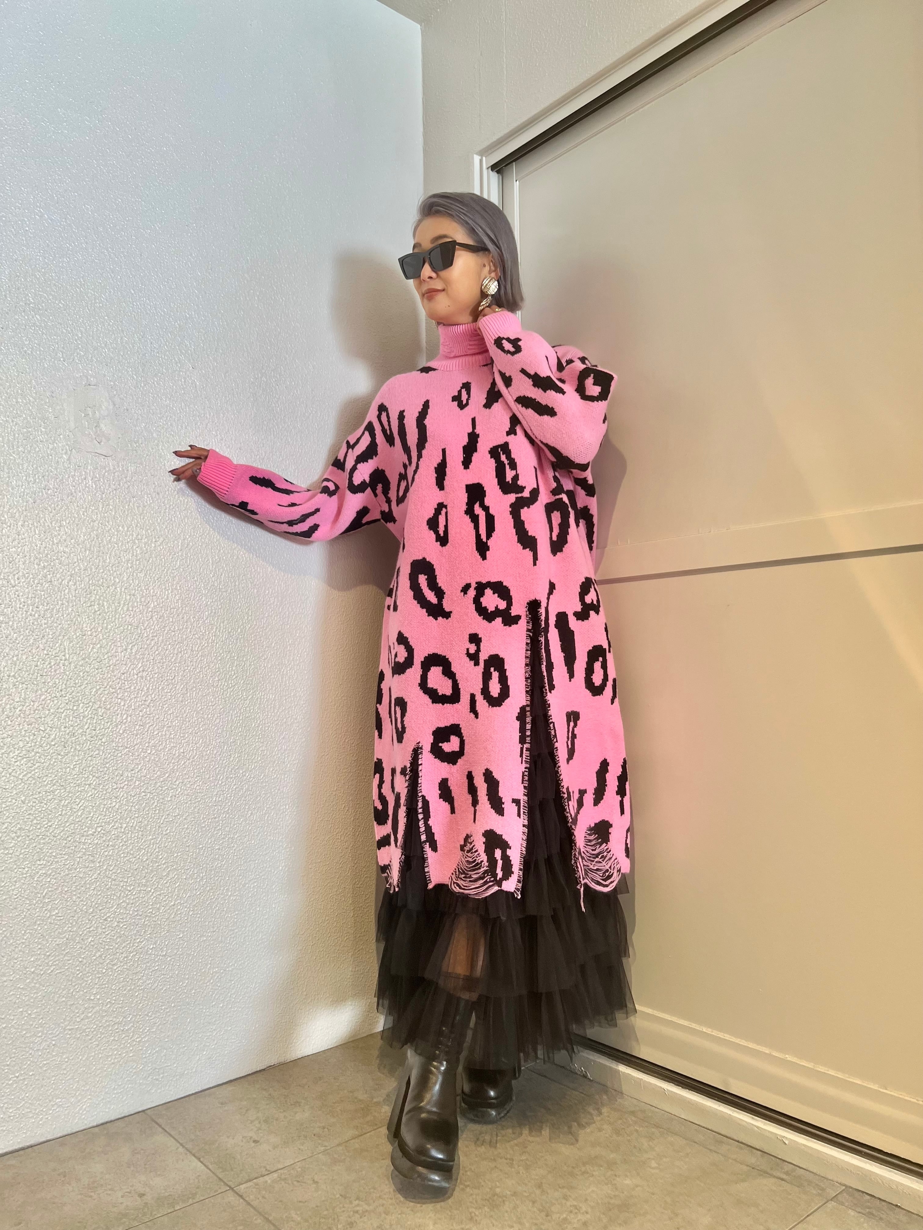 pink leopard high neck × slit design jacquard knit ニット ジャガード ハイネック ダメージ スリット ピンク レオパード 豹柄