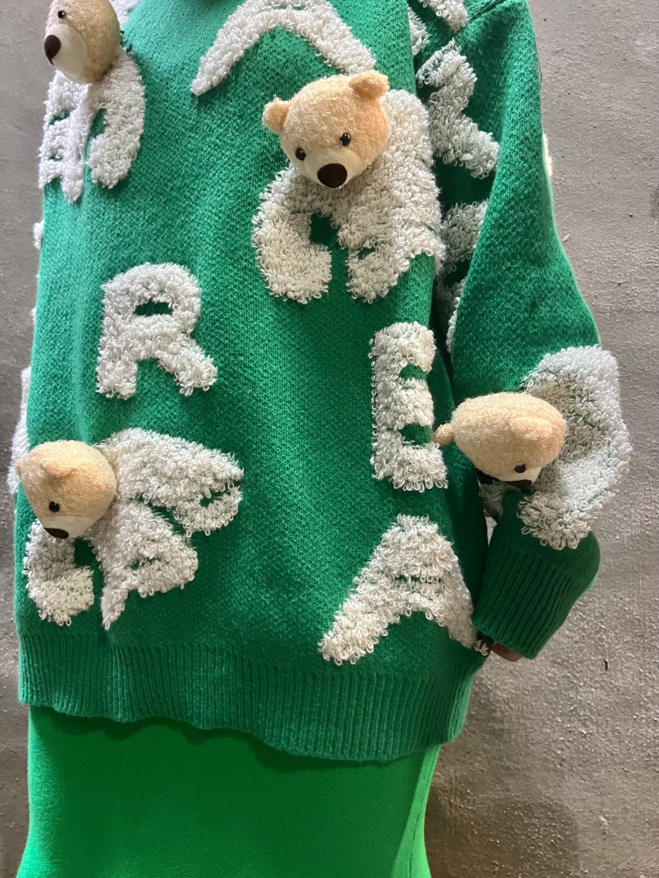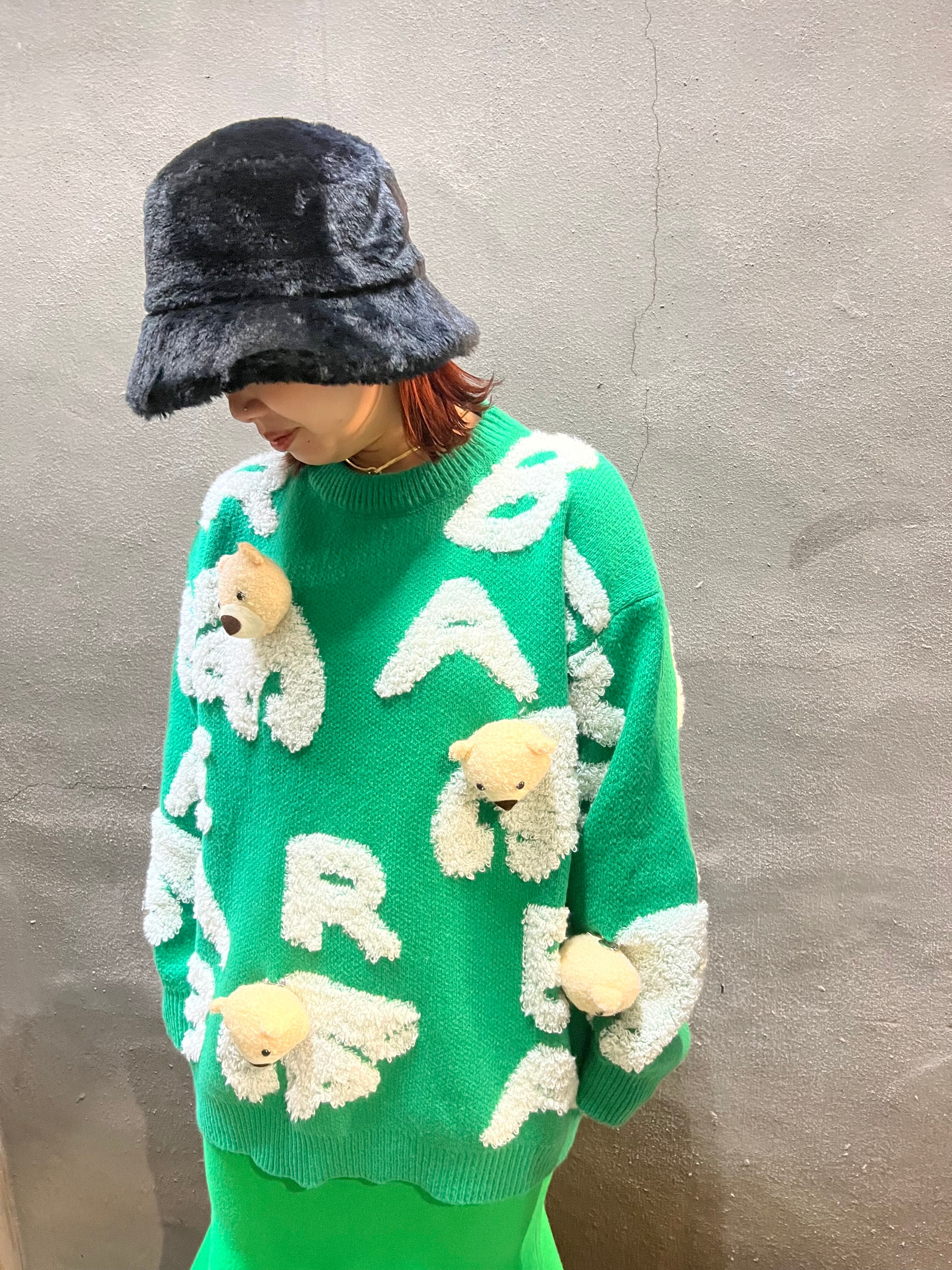 3D bear broach × jacquard knit tops ニット トップス ジャガード パイル ベア くま ブローチ