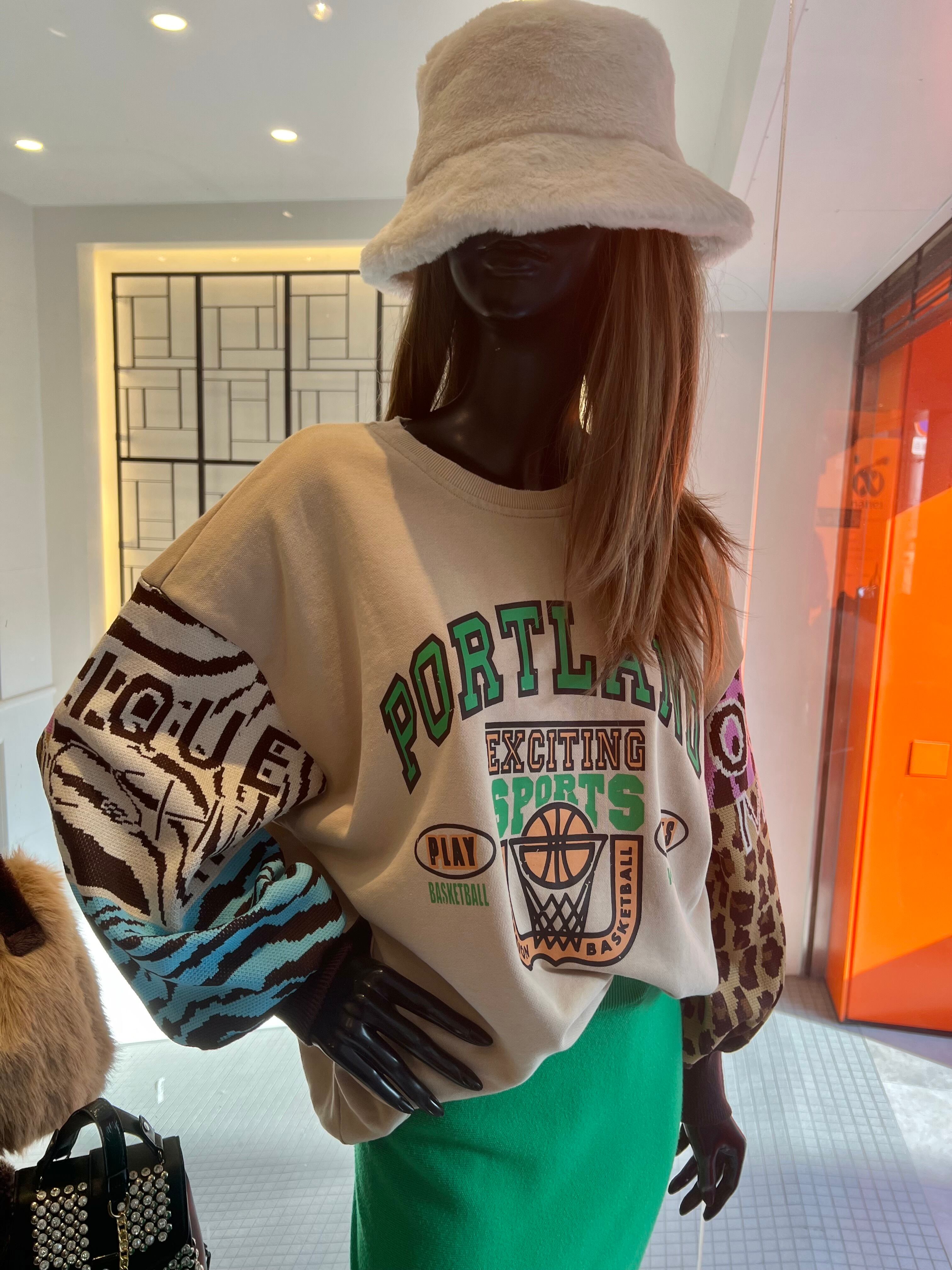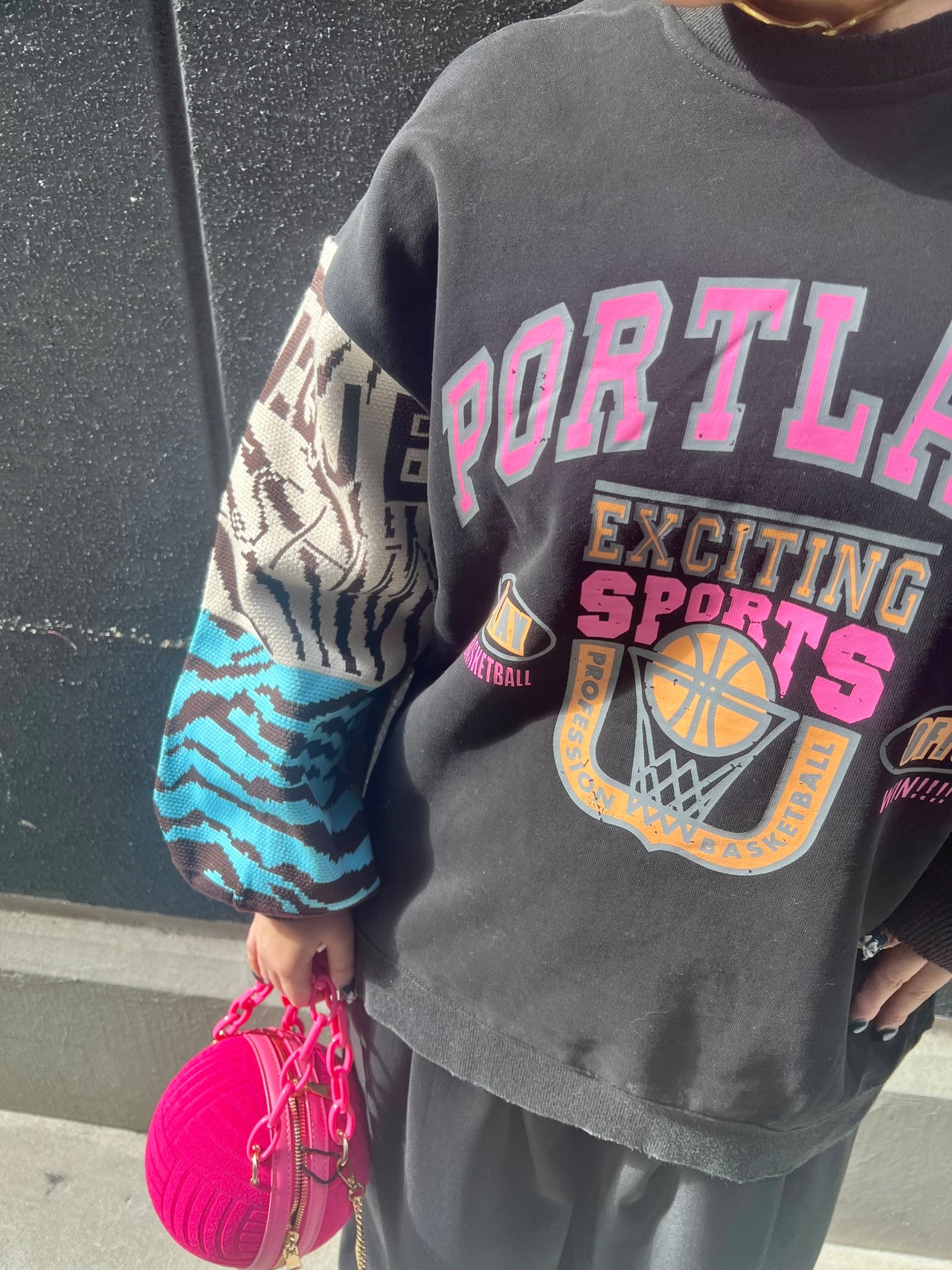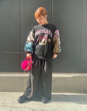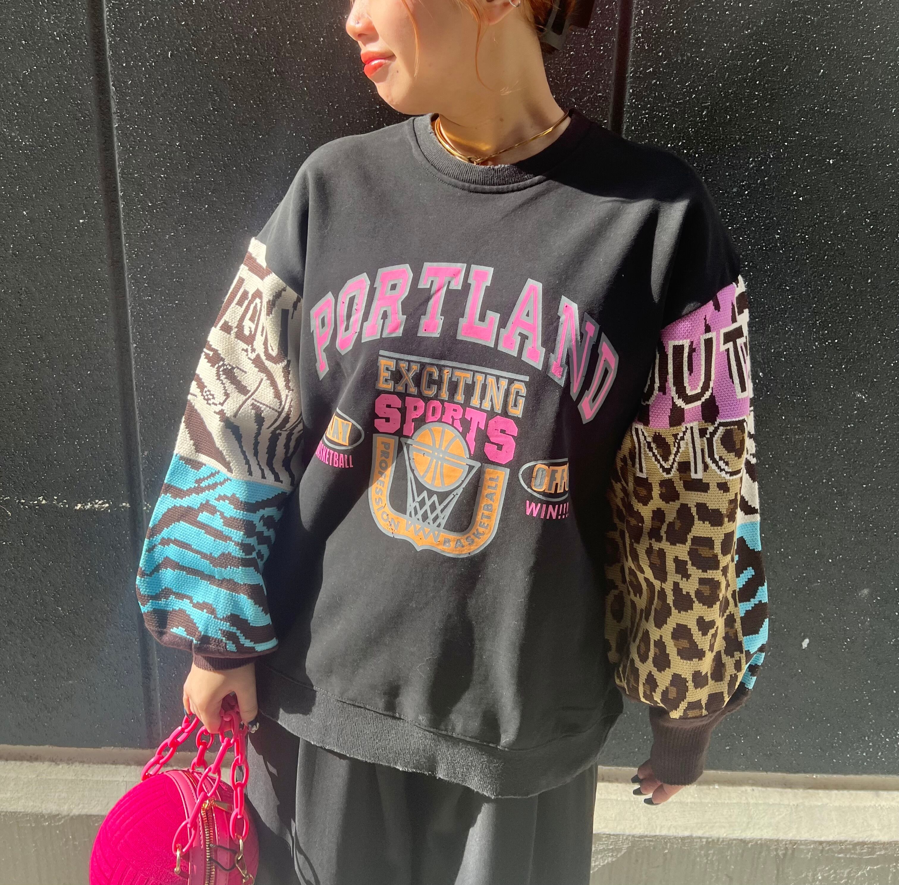 ジャガードニットの袖とカラフルなプリントのトレーナートップスが絶妙なバランスで調和してます♪