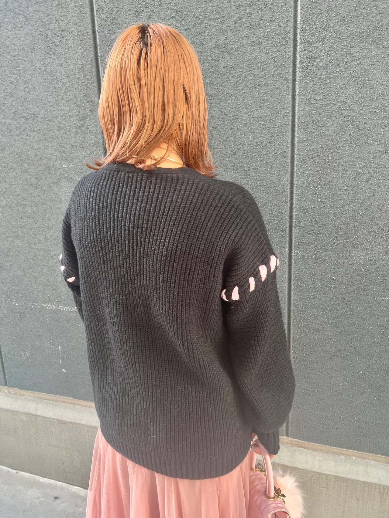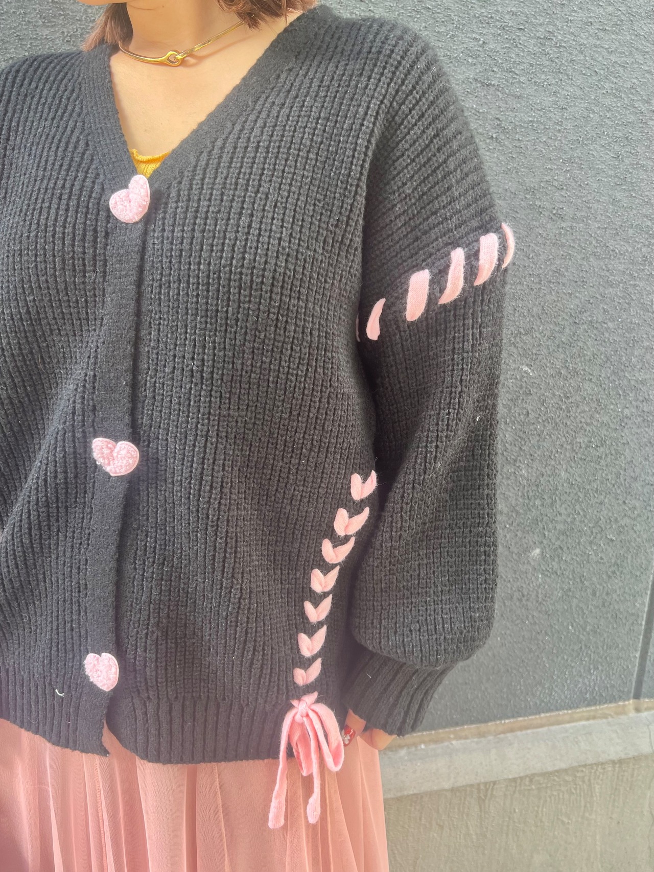 pink ribbon V-necj knit cardigan ニット カーディガン ニットカーデ ピンク ブラック リボン Vネック 羽織り