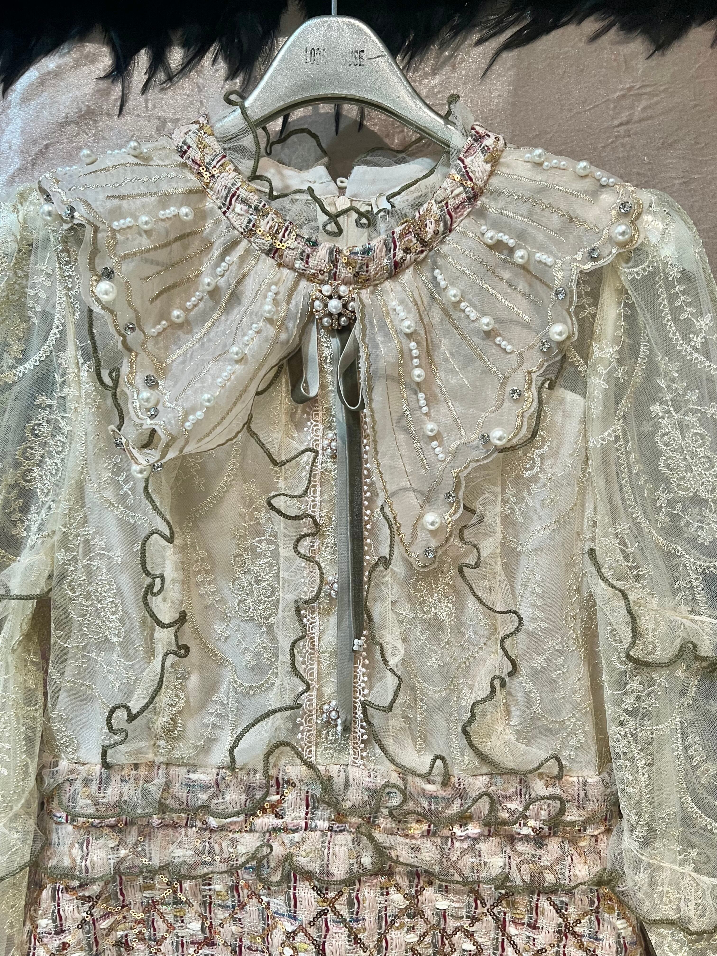 chiffon glitter tweed × lace design one-piece ワンピース ワンピ ツィード レース パール スパンコール 可愛い ドレス 結婚式 二次会 パーティー