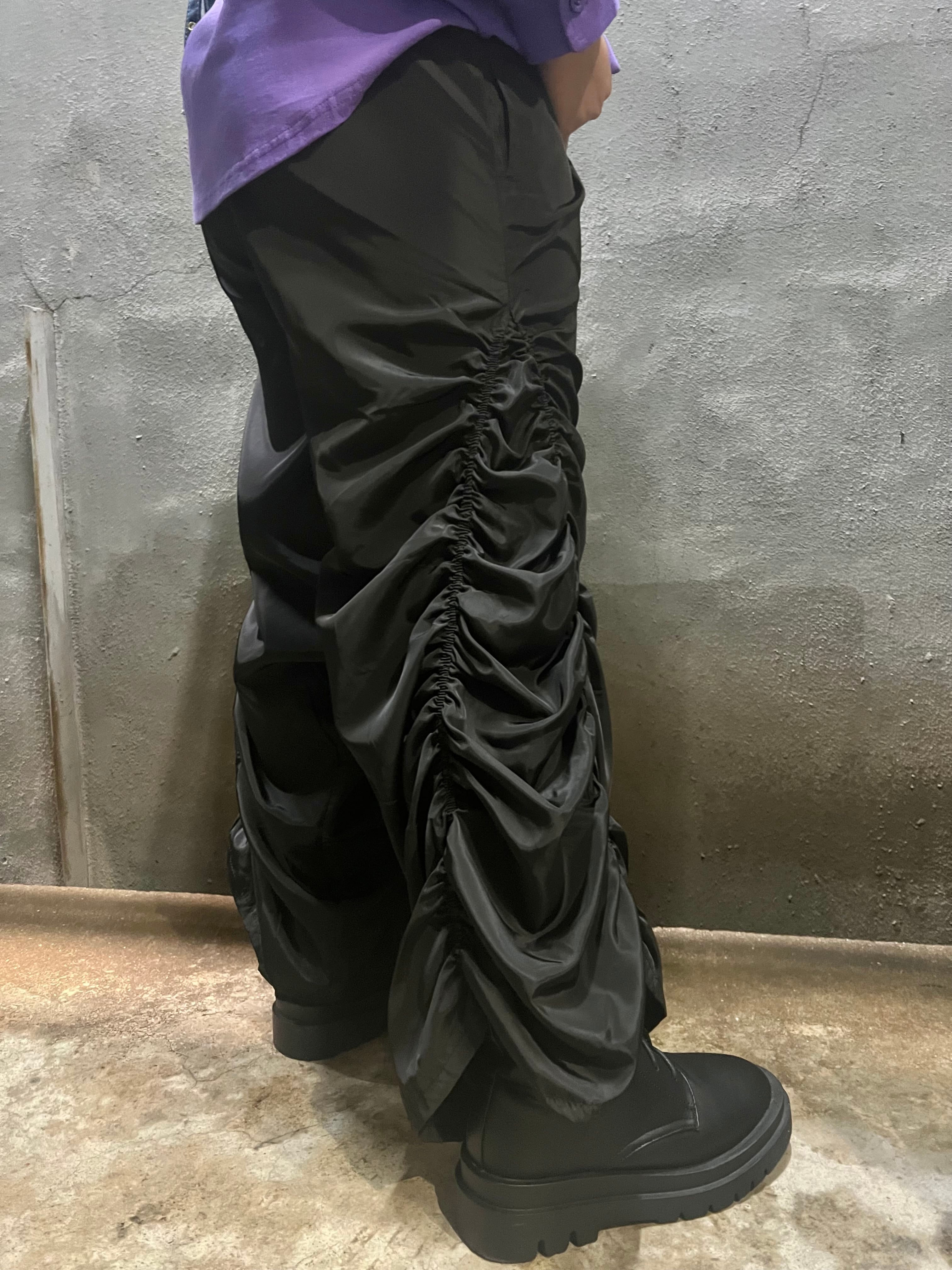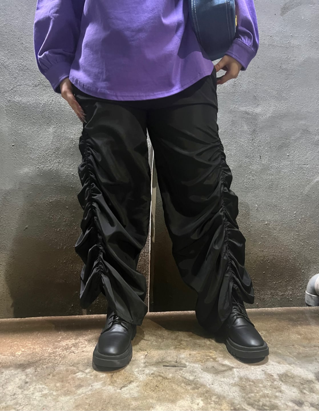 shirring design nylon wide pants パンツ シャーリング ゴムウエスト ブラック 黒 スポーティ
