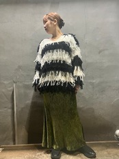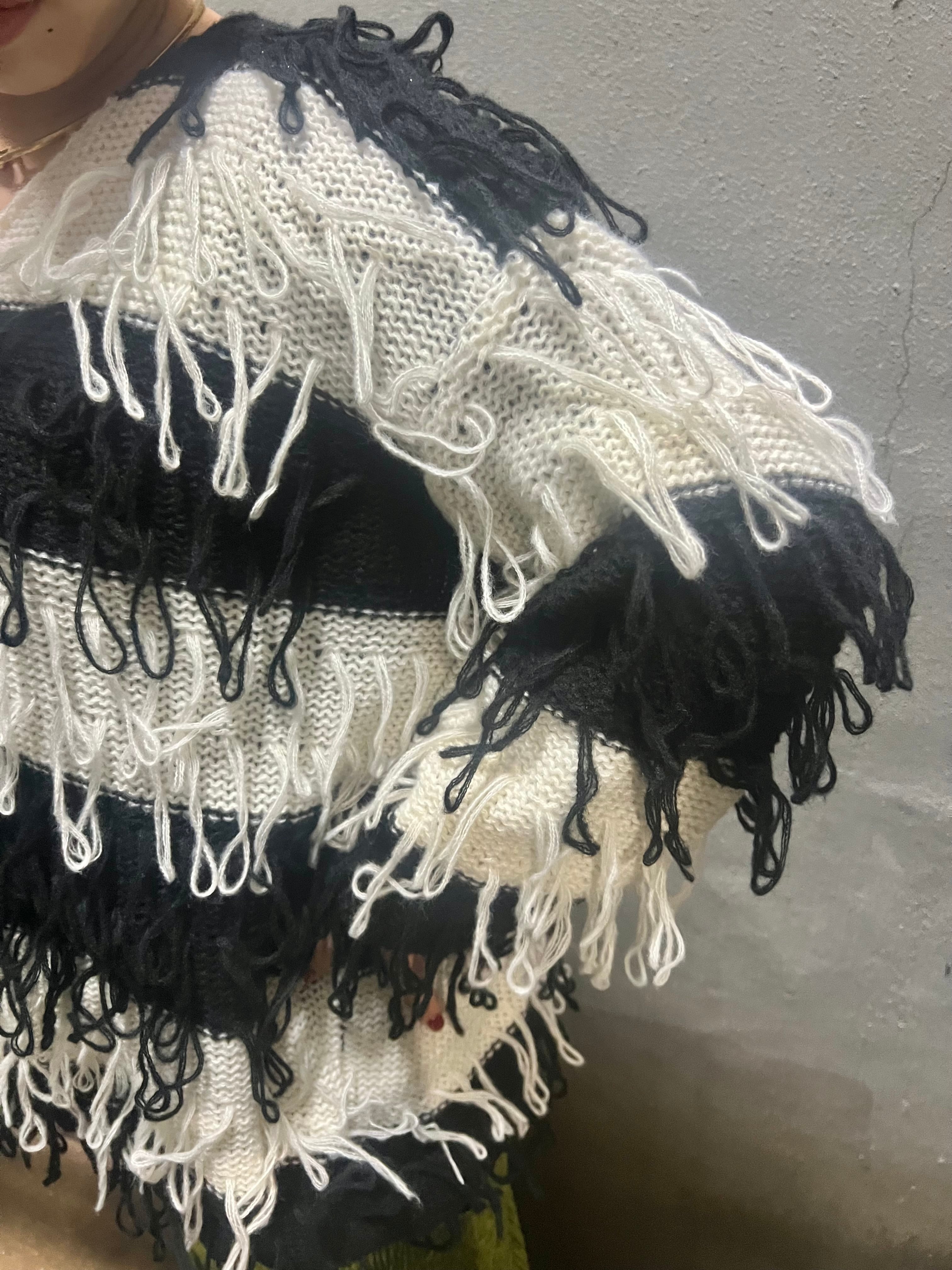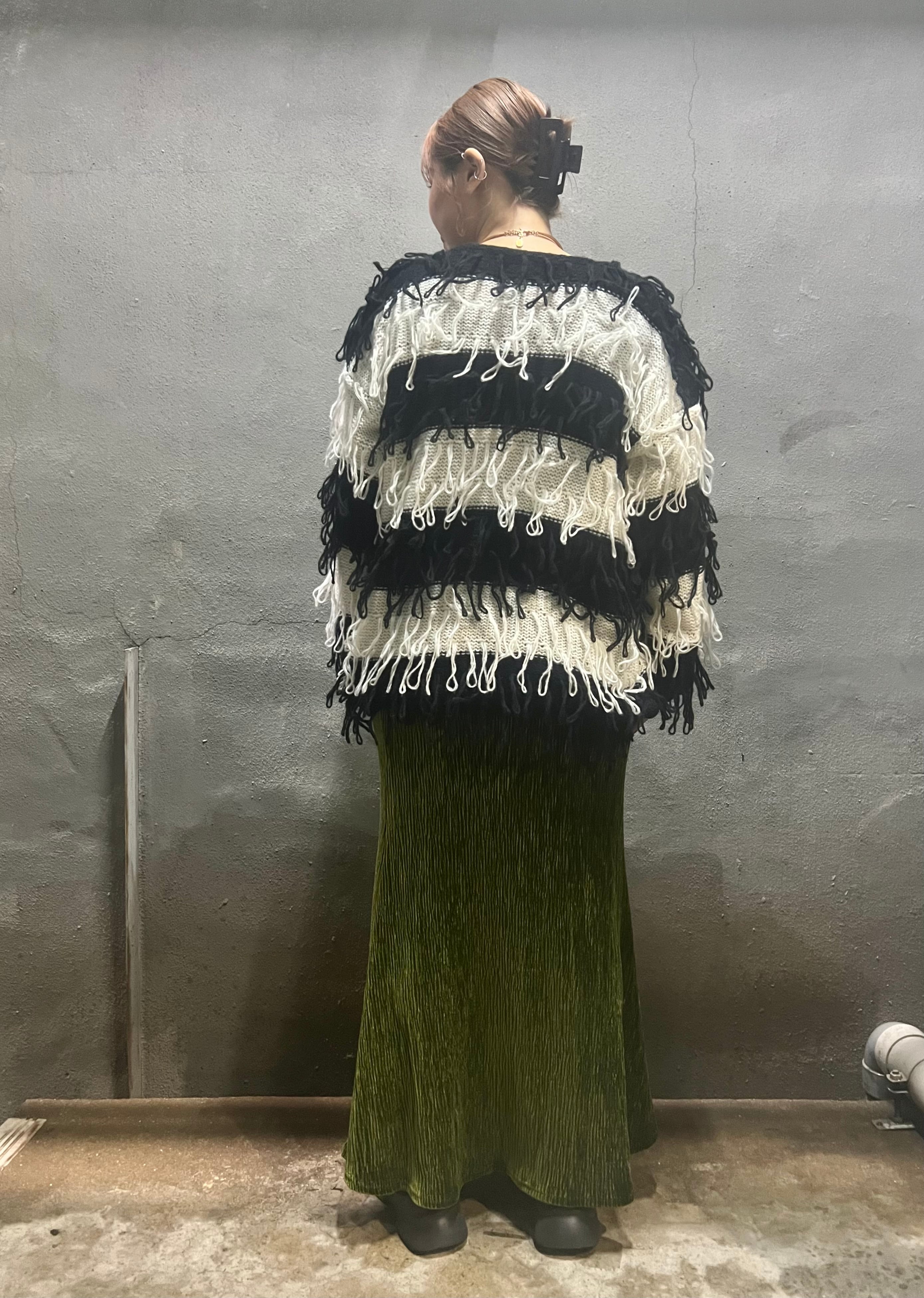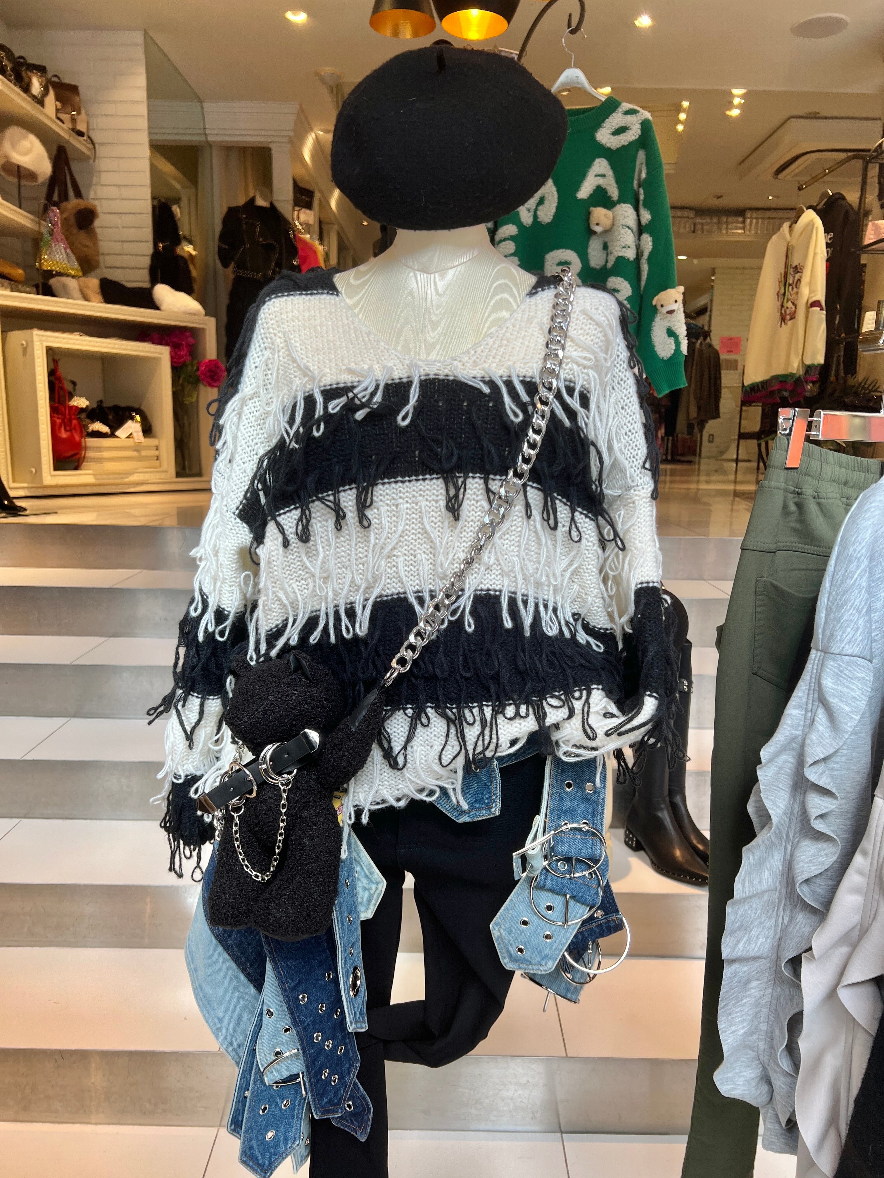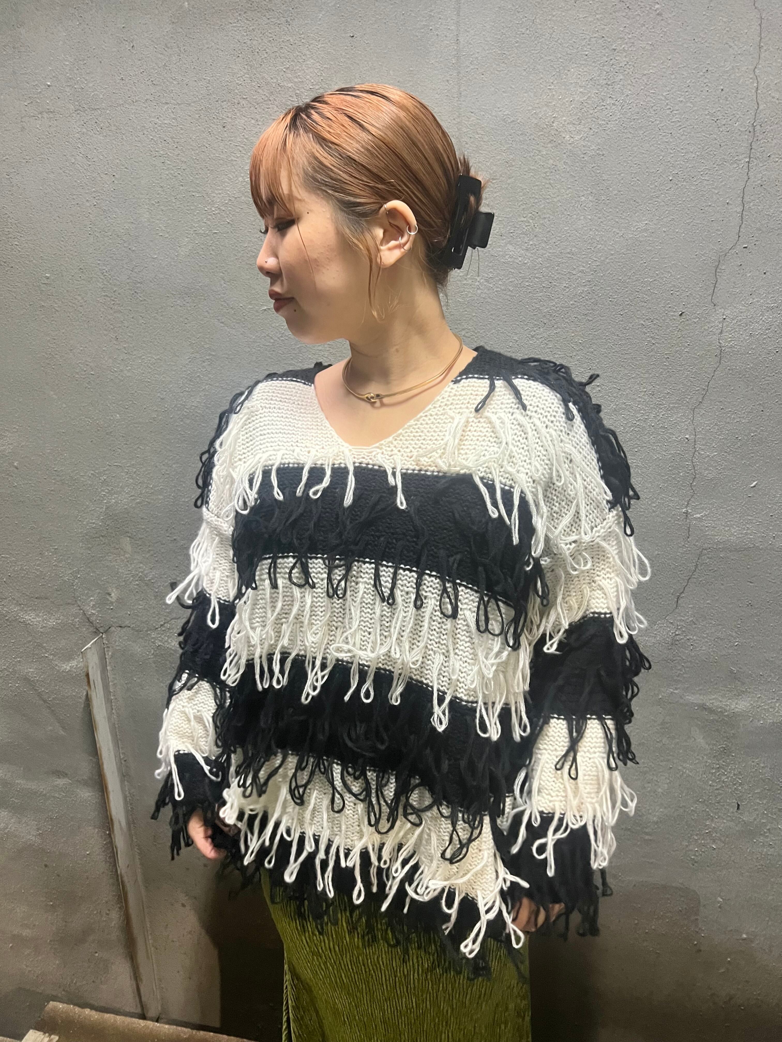 loop fringe V-neck knit sweater ニット トップス セーター フリンジ ループ ボーダー バイカラー ブラック