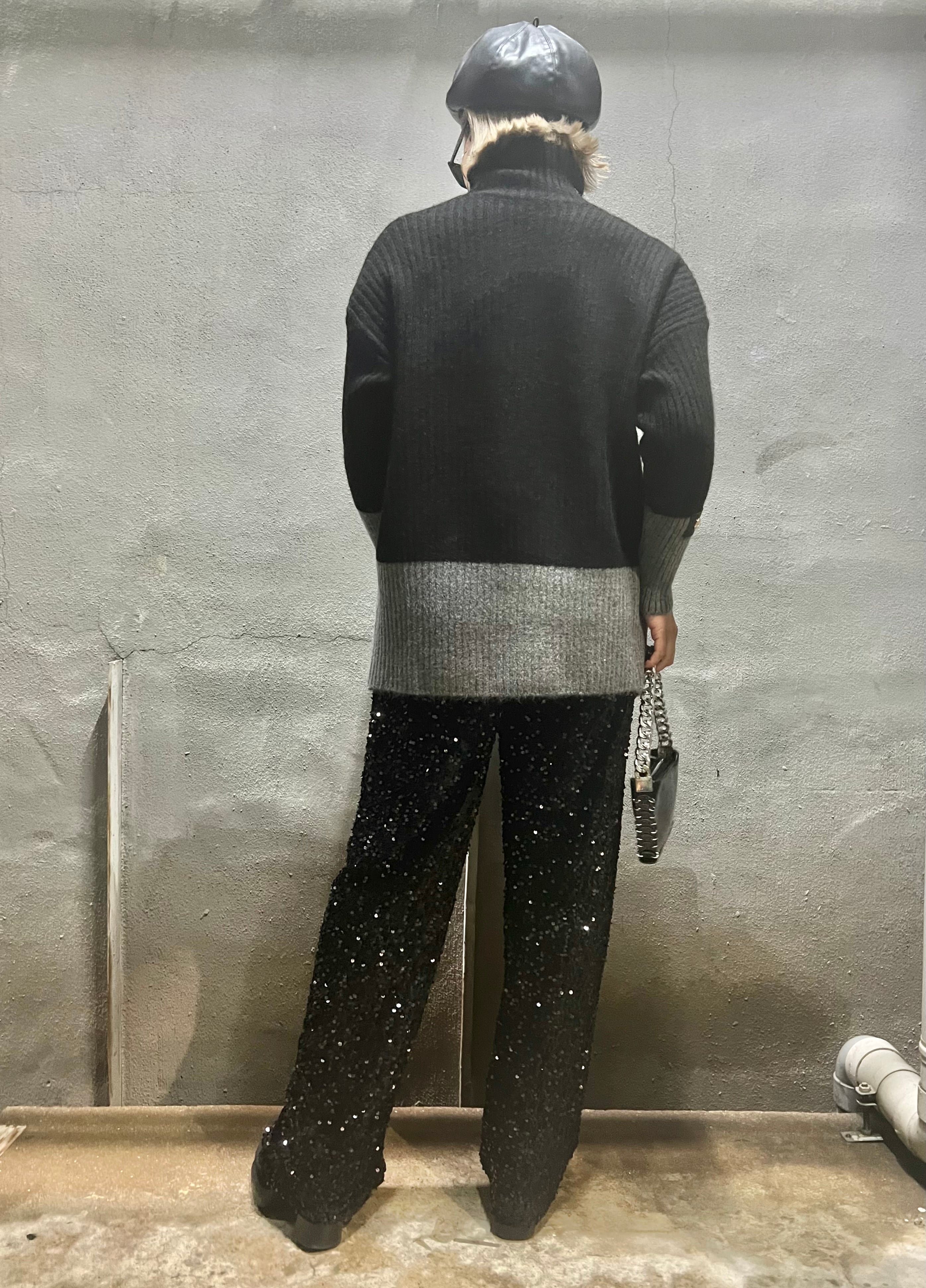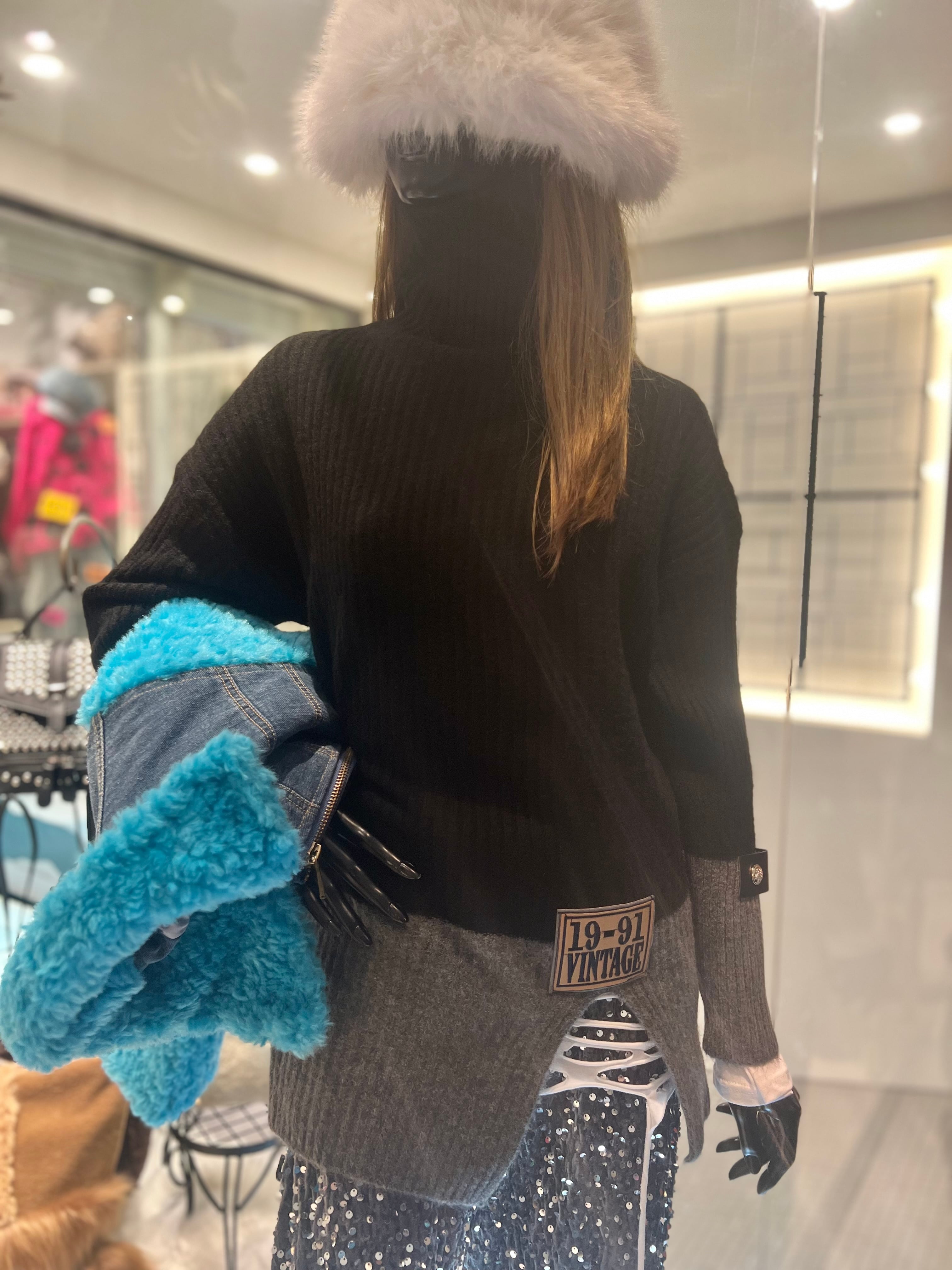 bi-color change slit design knit ニット トップス ハイネック バイカラー 切替デザイン スリット アップリケ ワッペン
