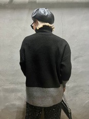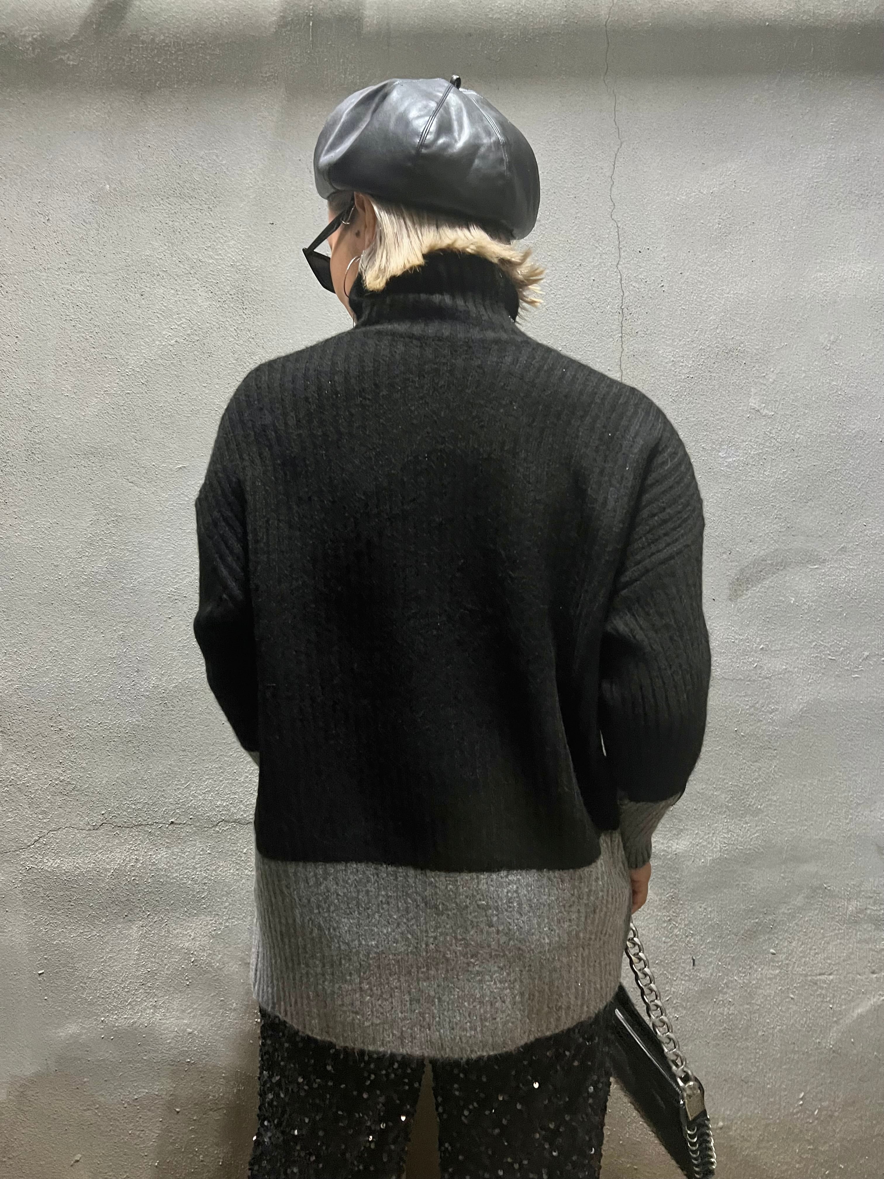 ハイネックのリブニットTOPS。裾がGRAYに切り替わっているデザインも