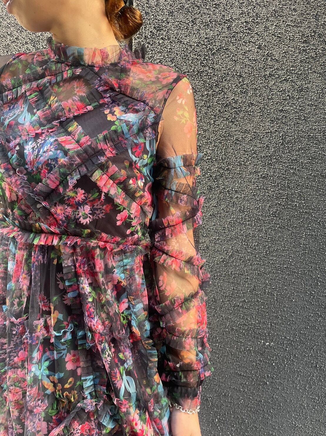flower print mini frill sheer design one-piece ワンピース ワンピ チュール 花柄 フラワープリント カラフル 結婚式 二次会 パーティー 夜 デート