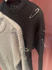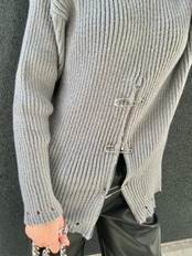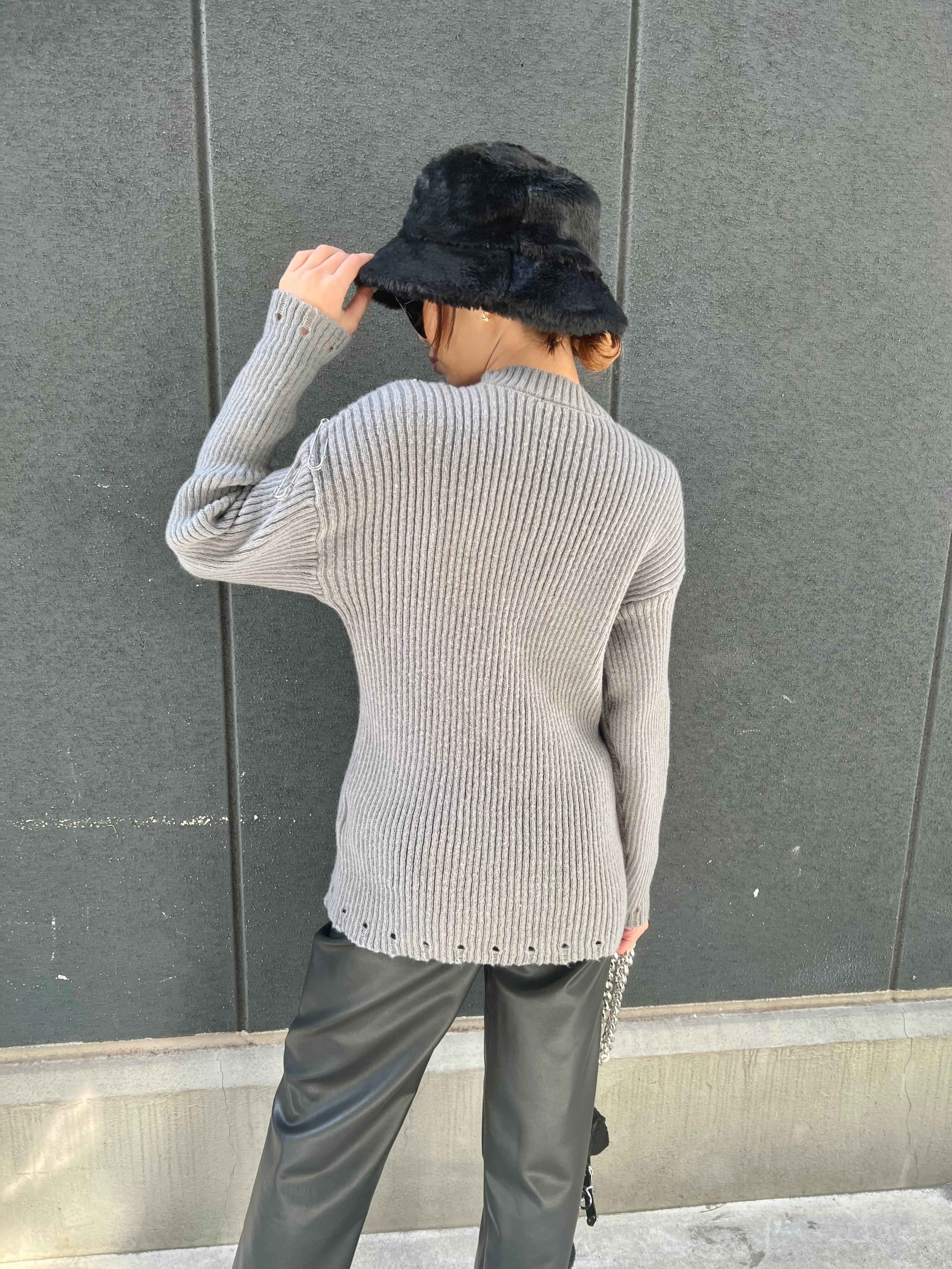 シルバーピンやジッパーがデザインされたエッジィな印象のリブニットトップス。