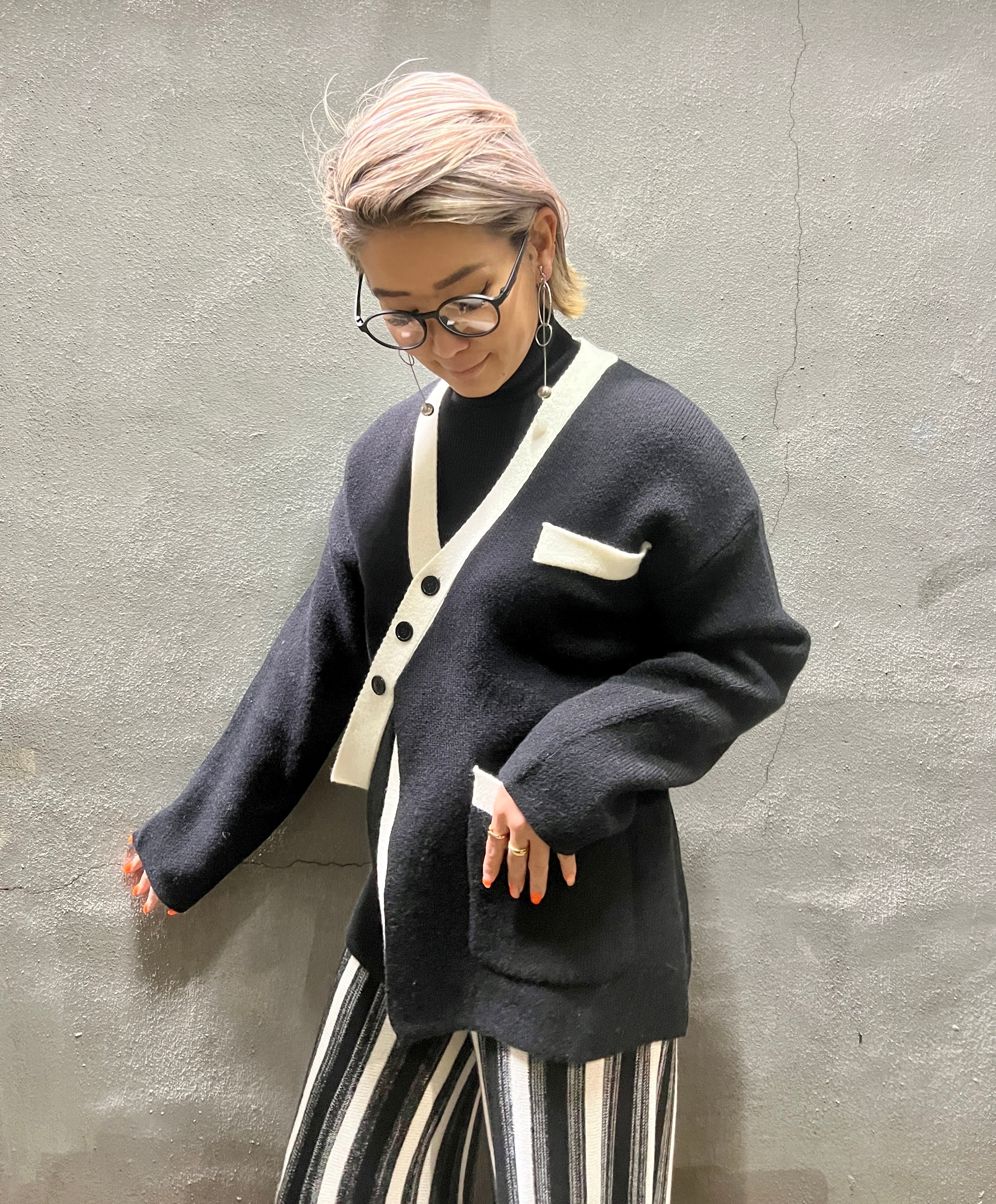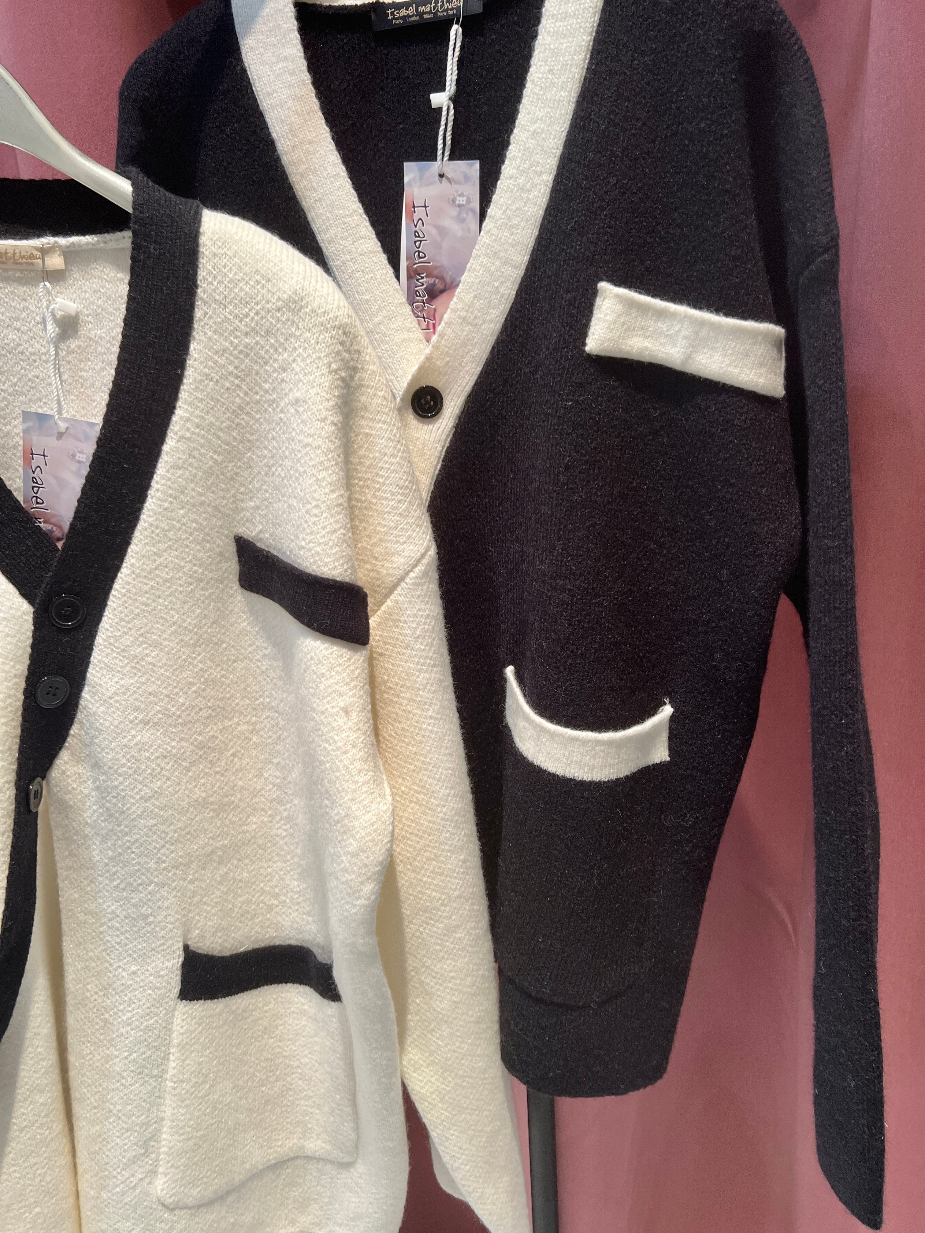 【knit cardigan】bi-color design jacquard knit cardigan ニット カーディガン バイカラー 白黒 ポケット