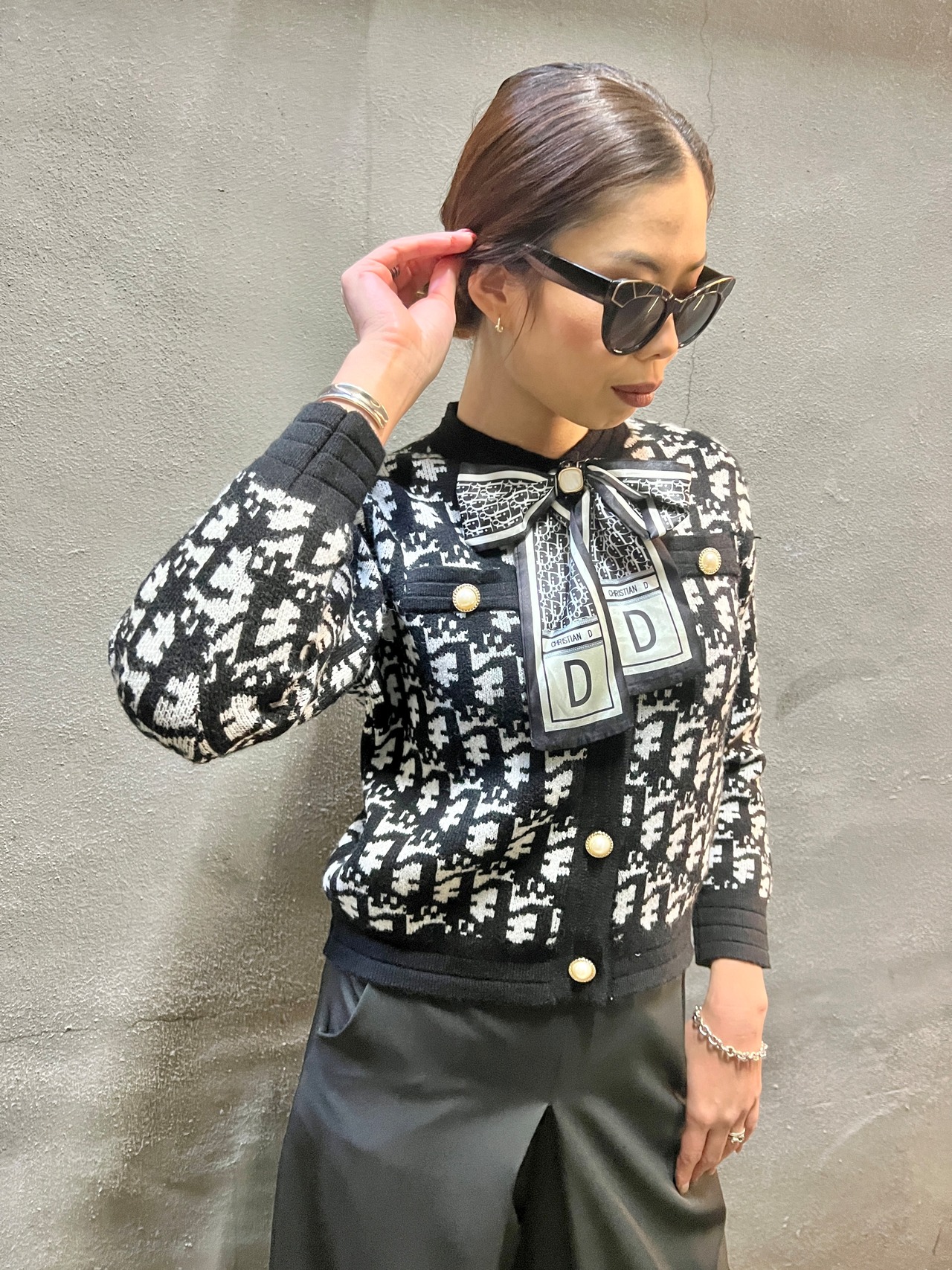 monogram jacquard knit cardigan ニット カーディガン ニットカーデ リボン ブローチ モノグラム