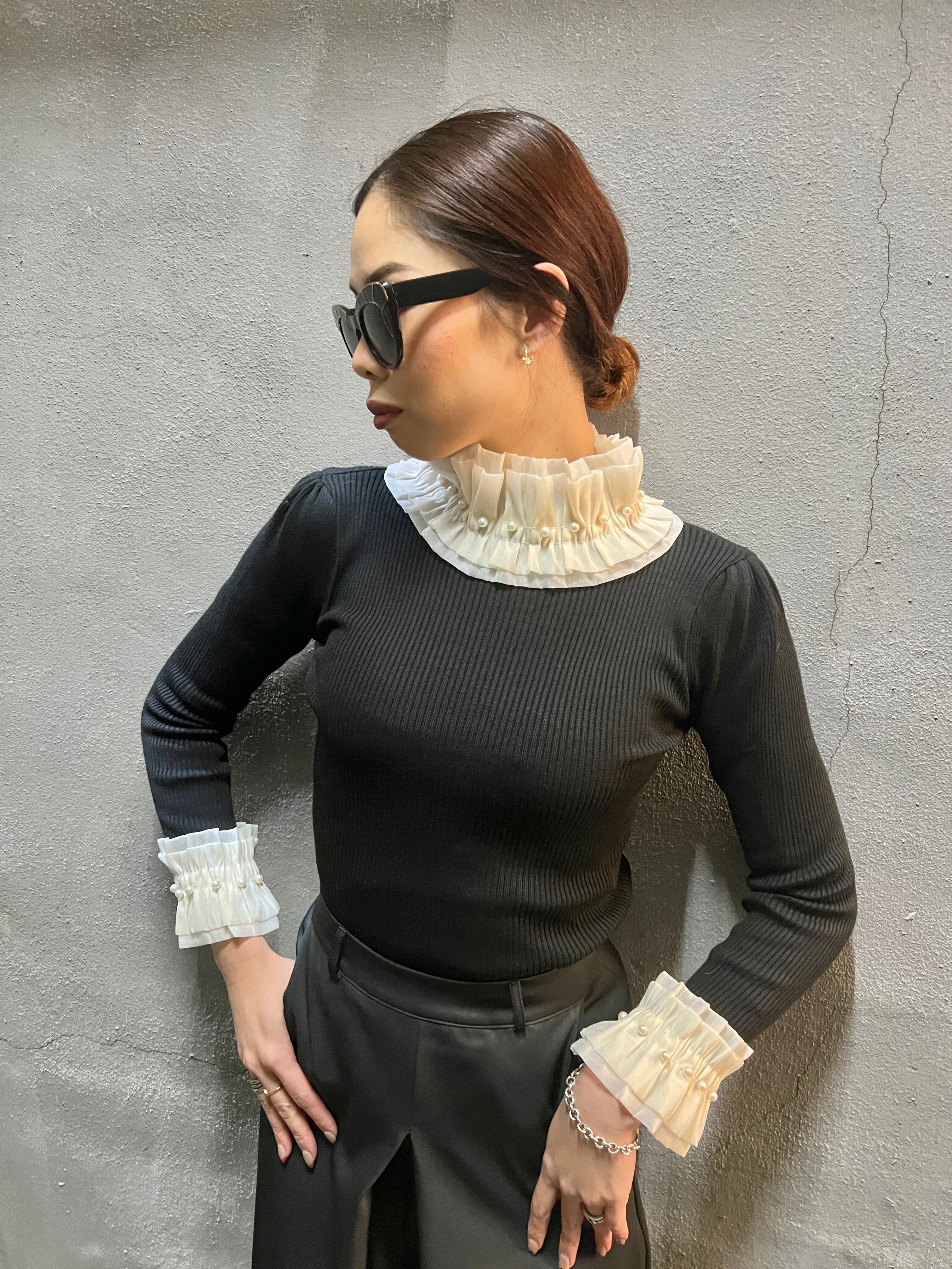 frill × pearl neck & cuffs design knit tops トップス ニット フリル パール カフス テレコニット