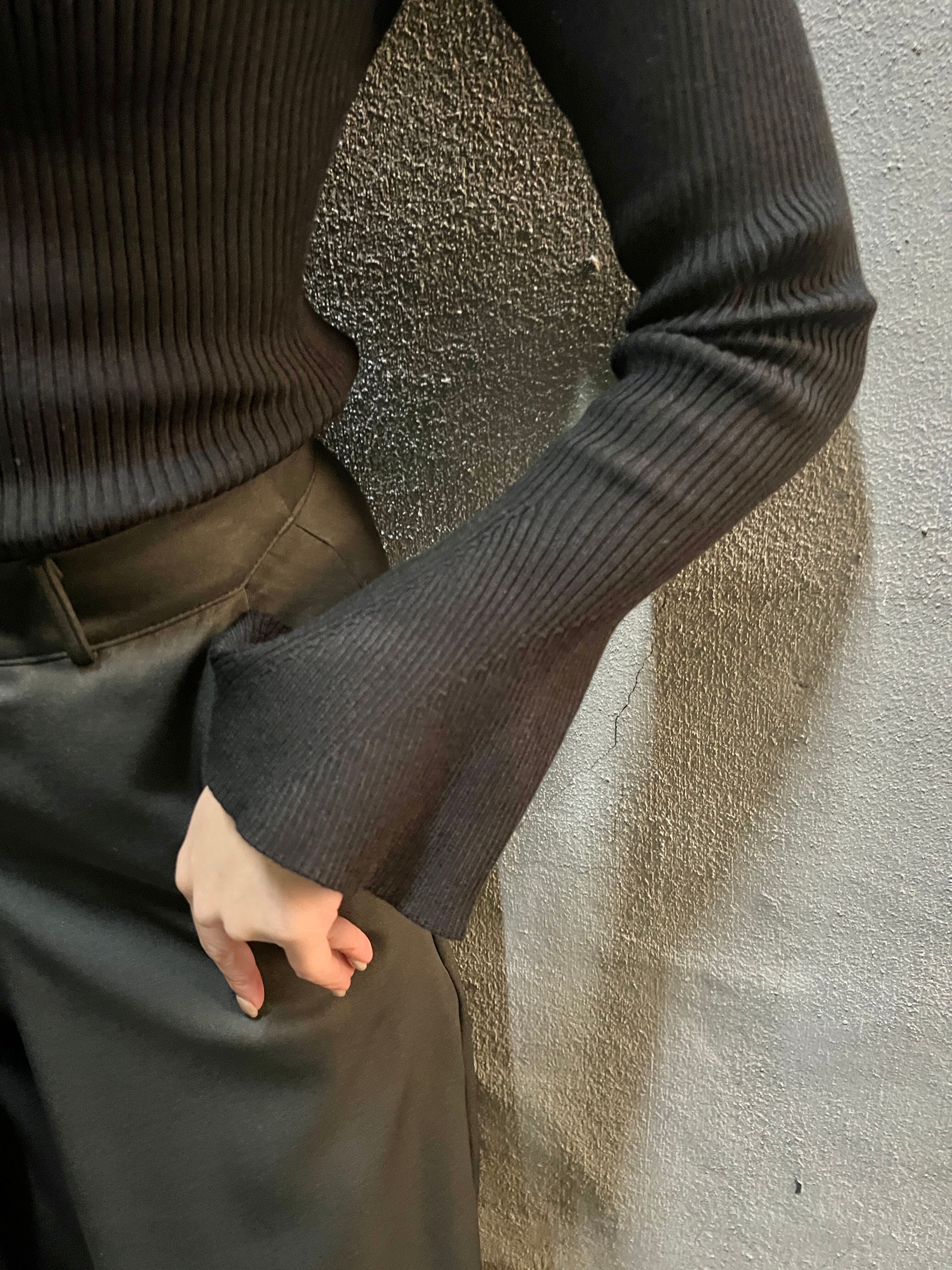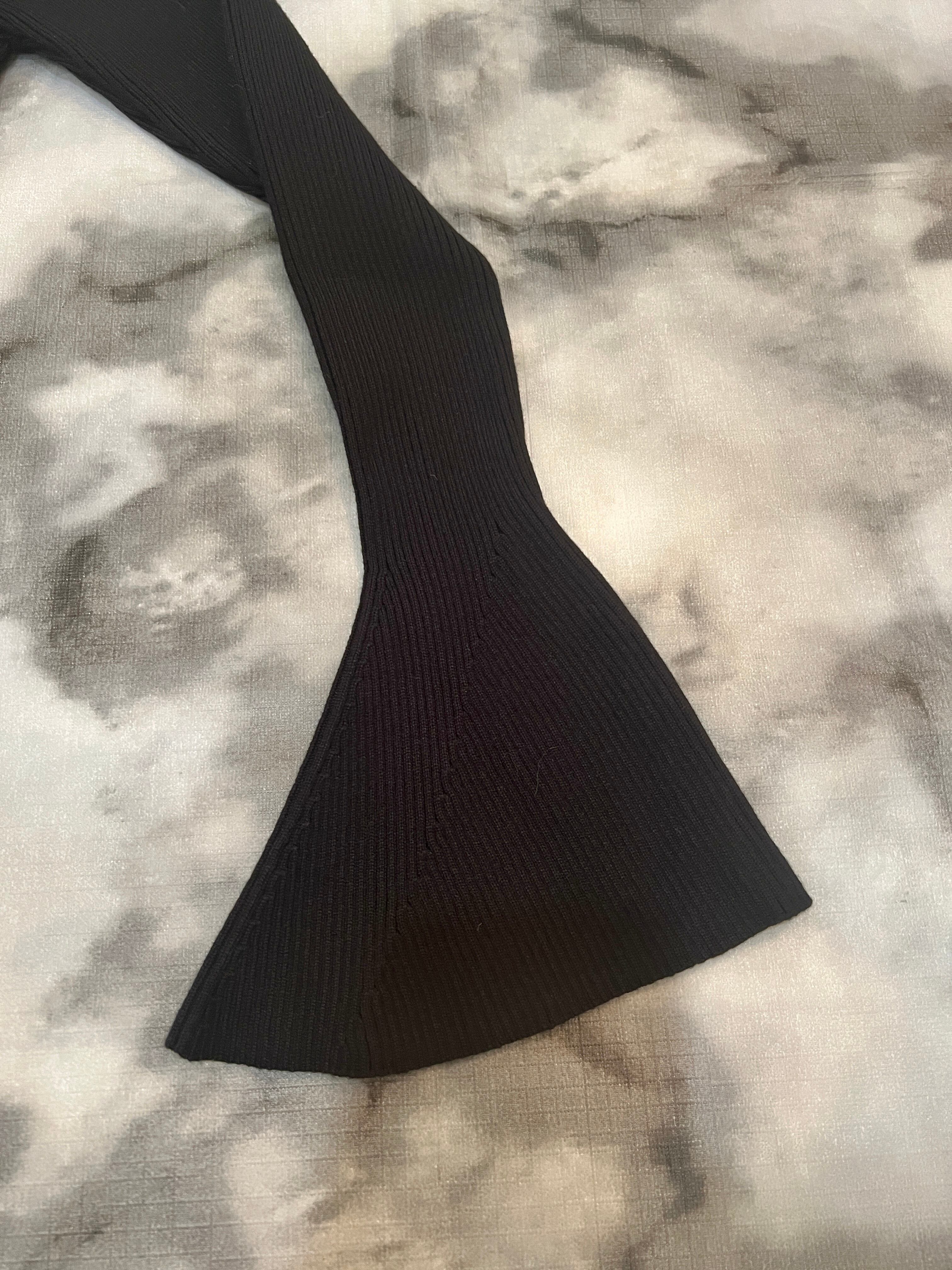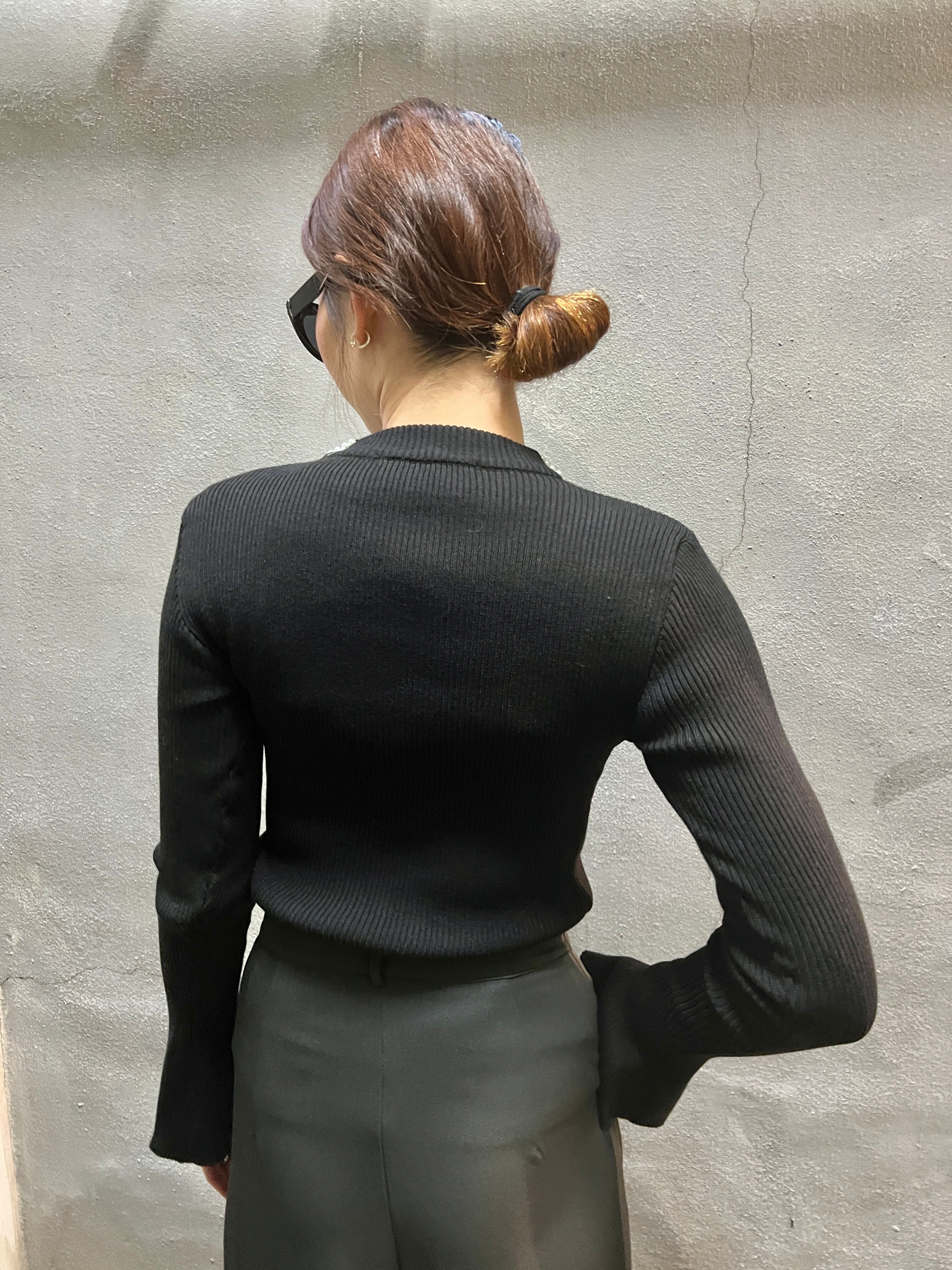 パールビジューネックとベルスリーブのデザインが印象的なブラックのニットトップスです!