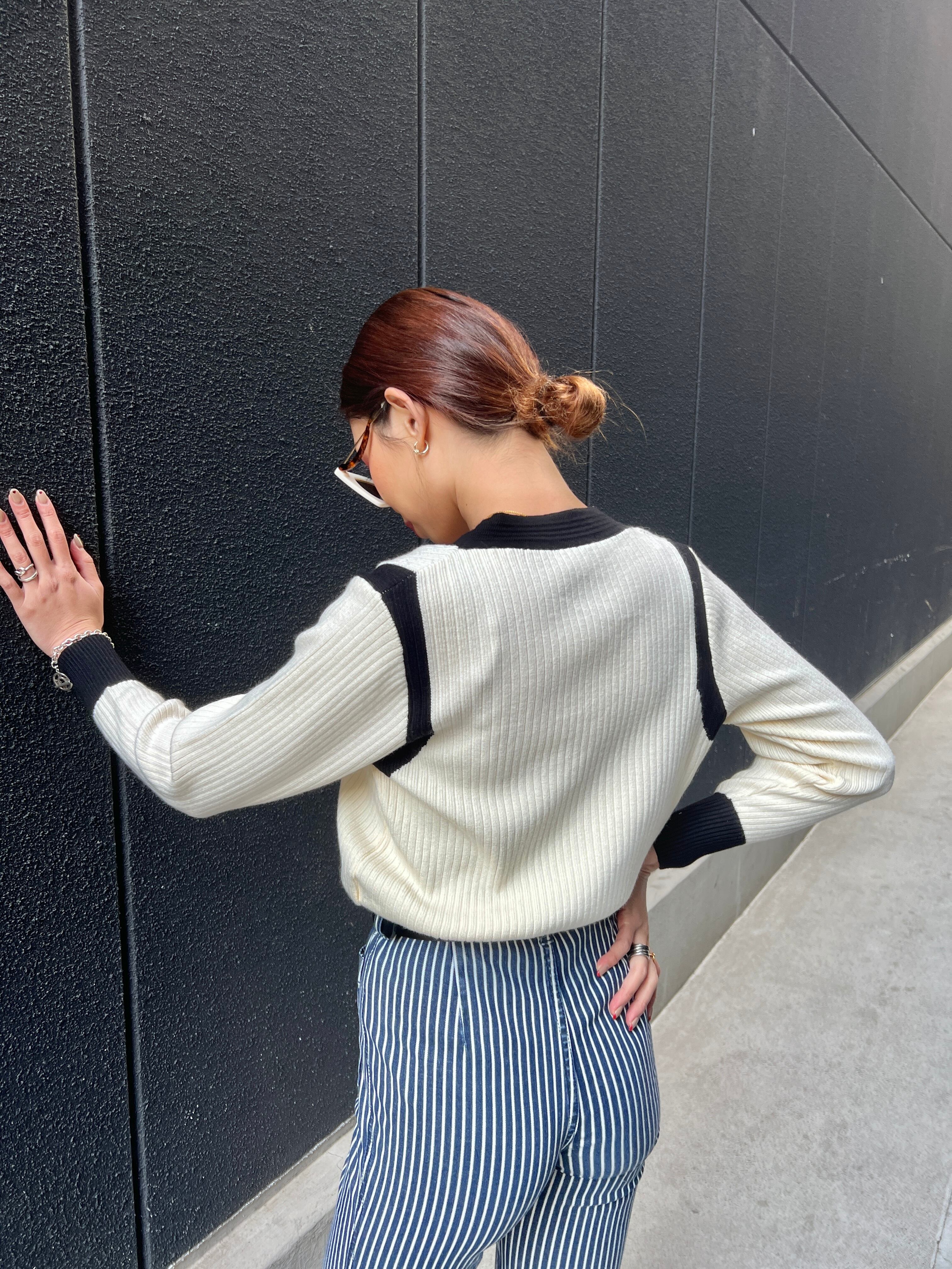 オフホワイト×ブラックのバイカラー配色がスタイリッシュで、Vネックデザインで首まわりもスッキリ見え♡