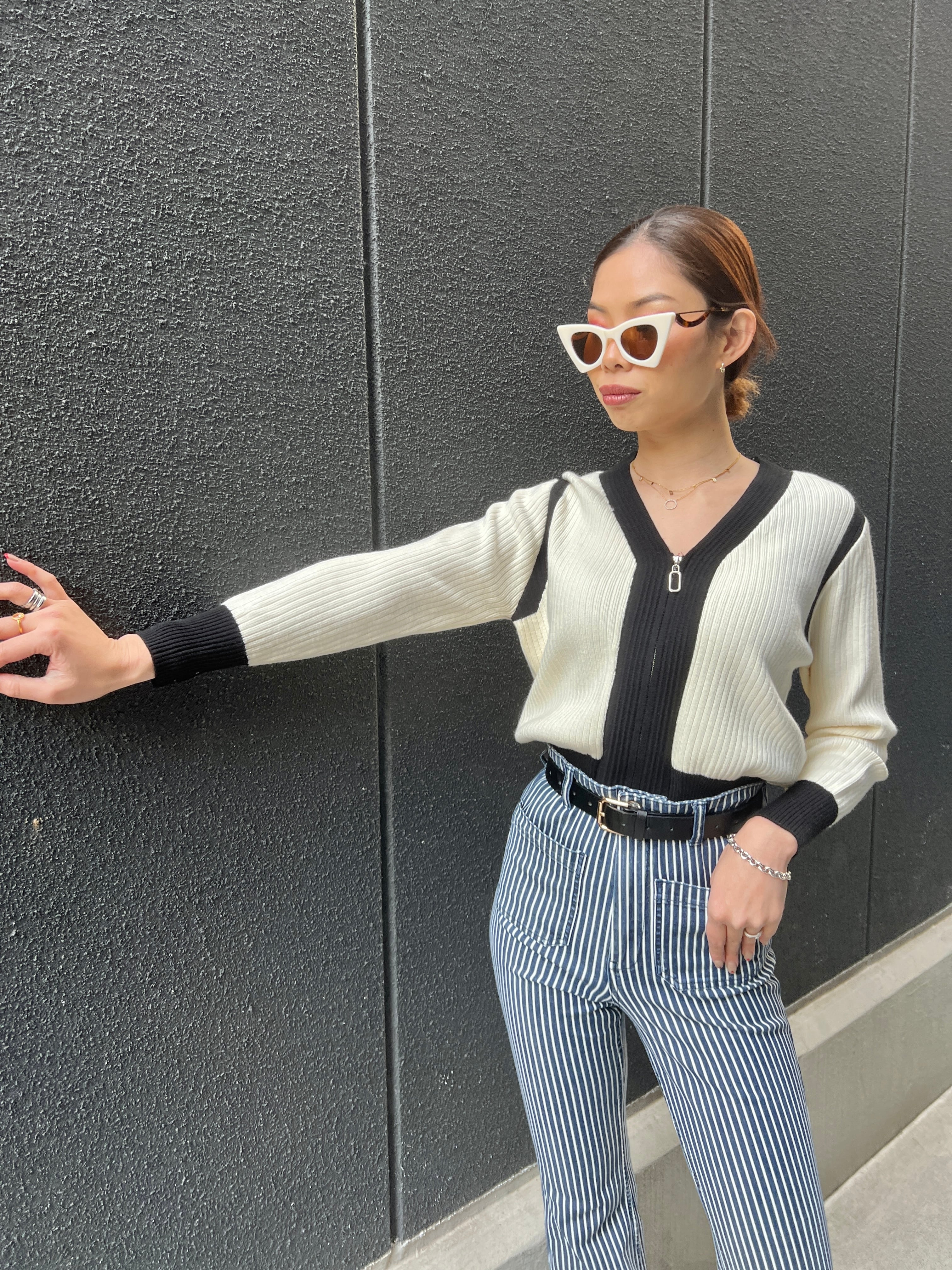 bi-color V-neck zip design rib knit tops トップス ニット リブニット バイカラー Vネック ジップ
