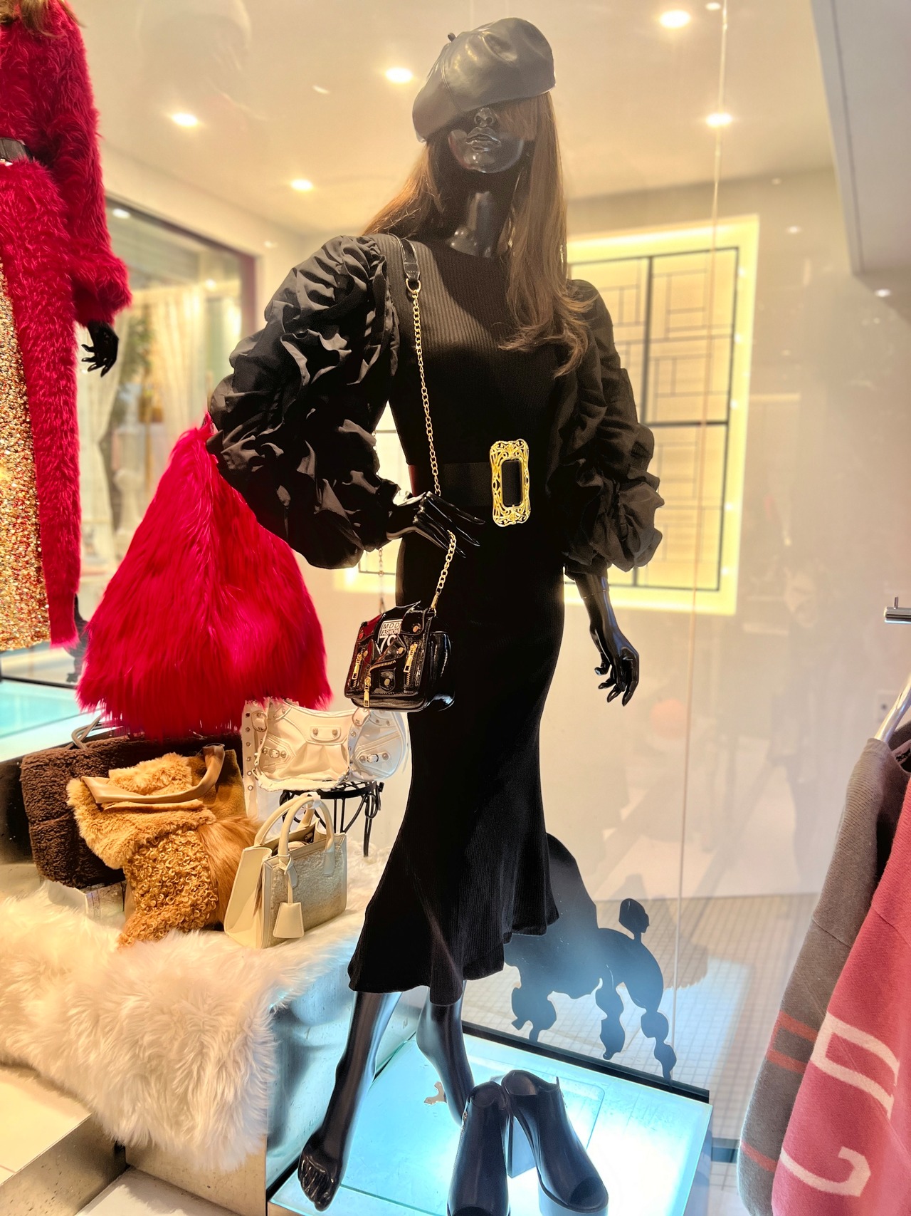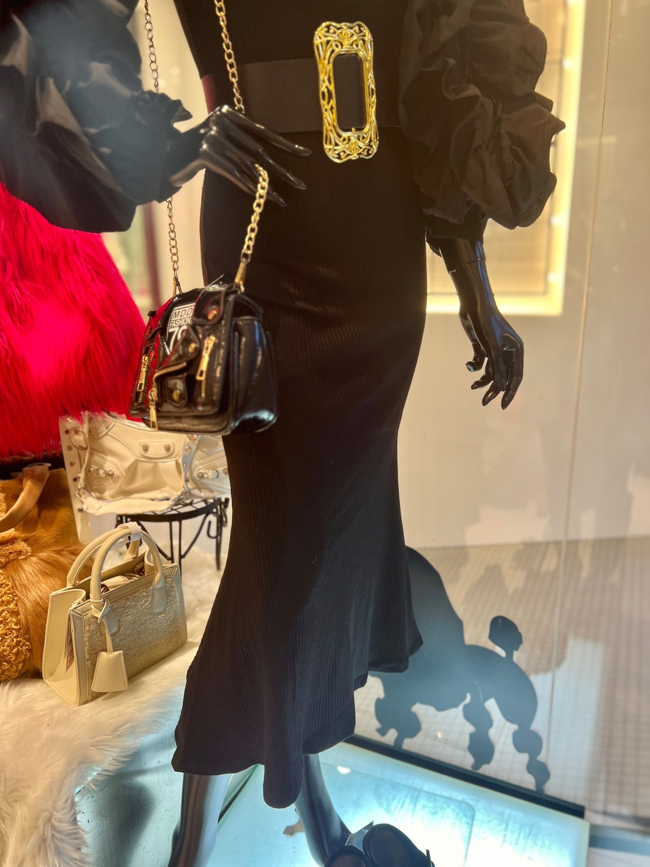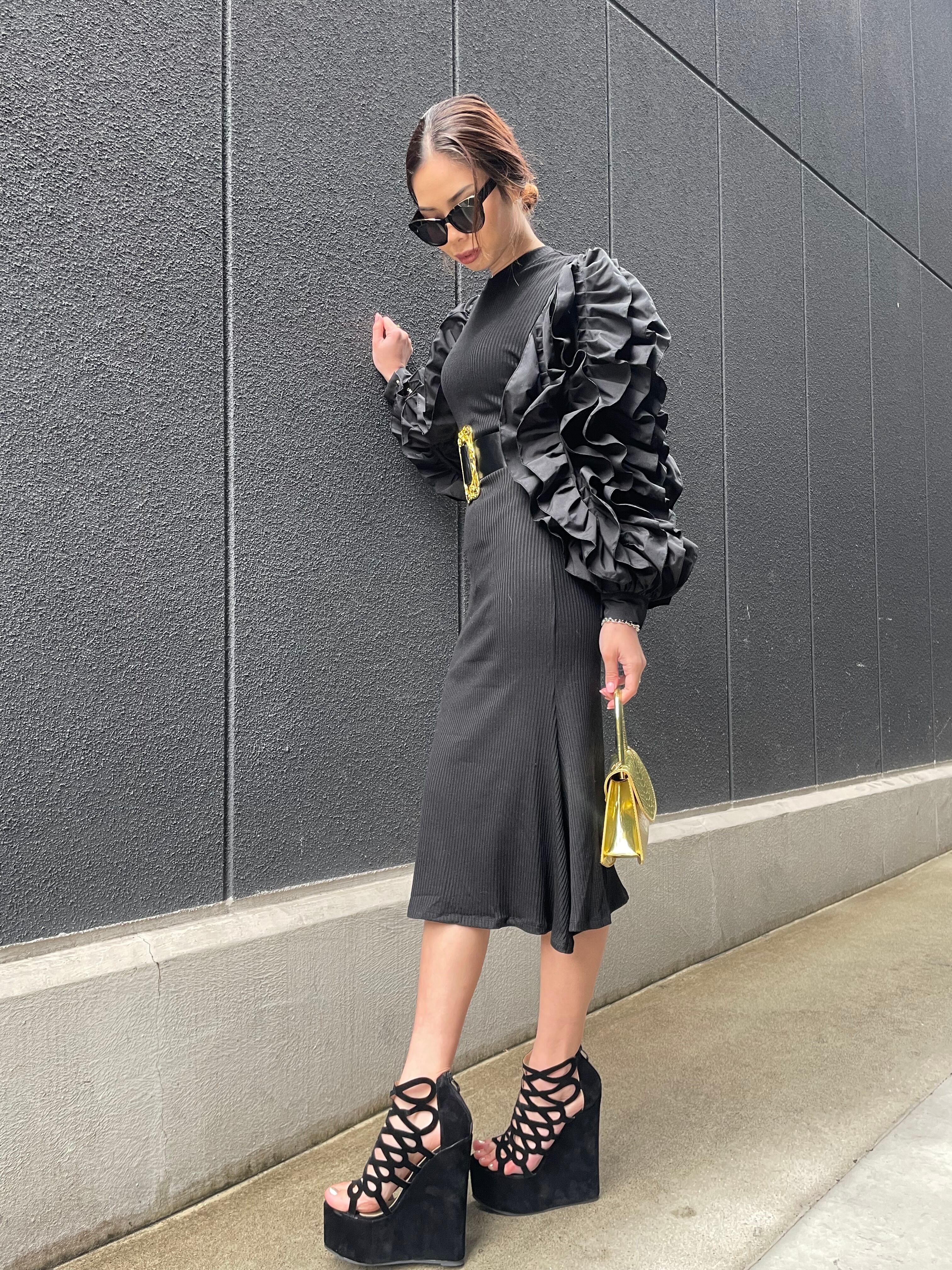 ゴージャスなフリルスリーブとボディラインを美しく引き立てるマーメイドラインが特徴のブラックワンピースです。