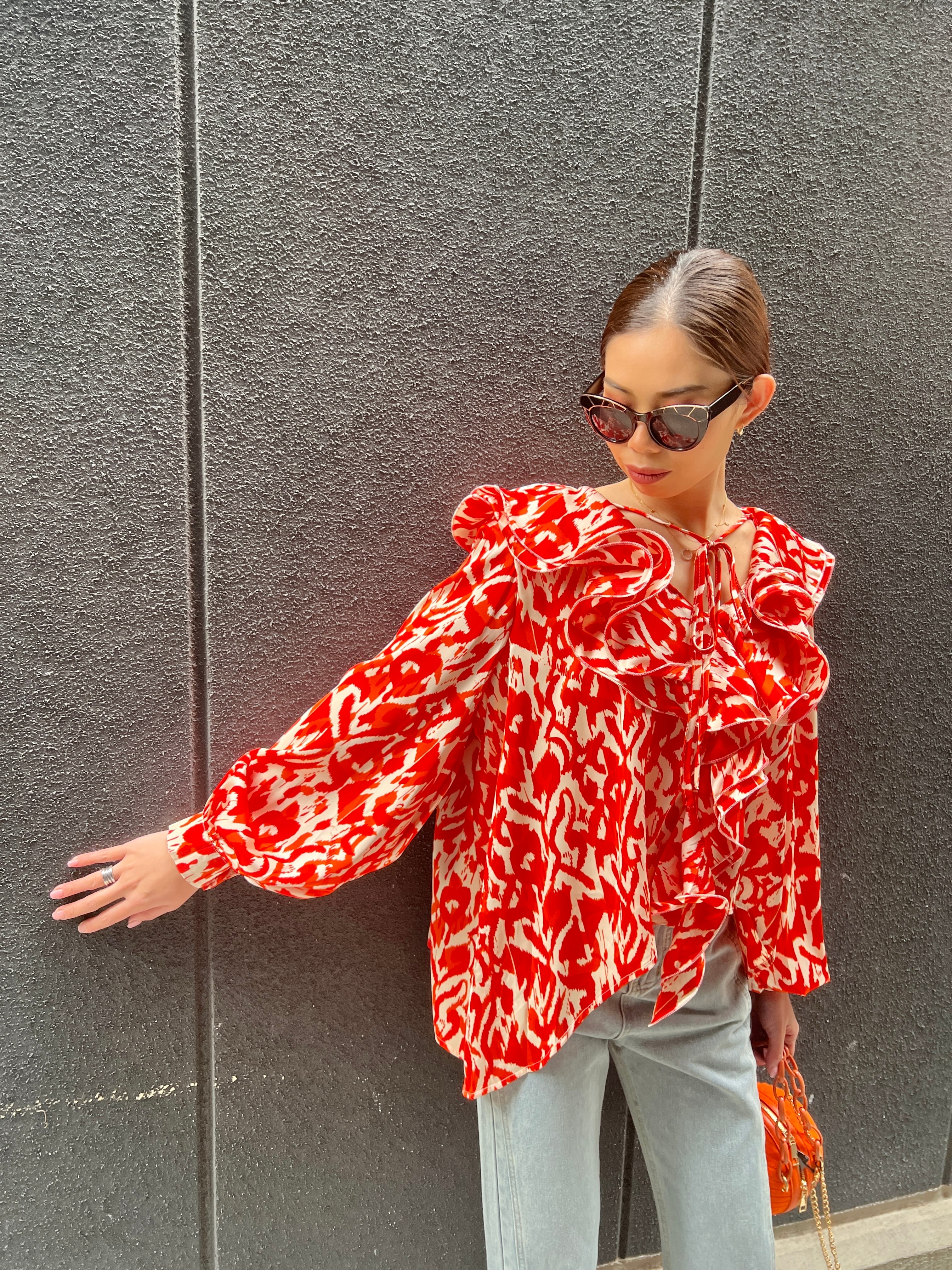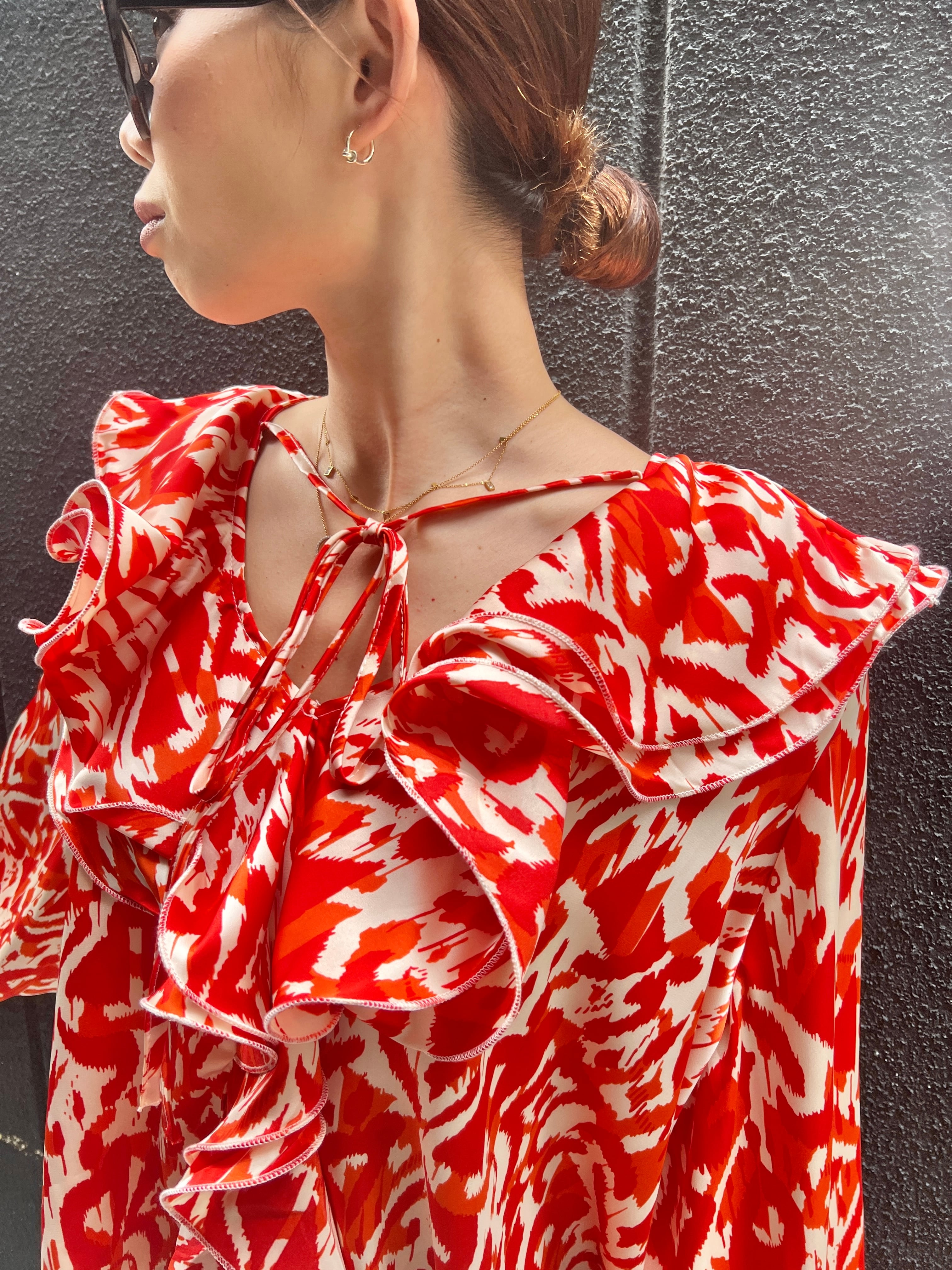 print satin frill collar design shirt tops トップス シャツ デザイントップス 柄トップス フリル リボン