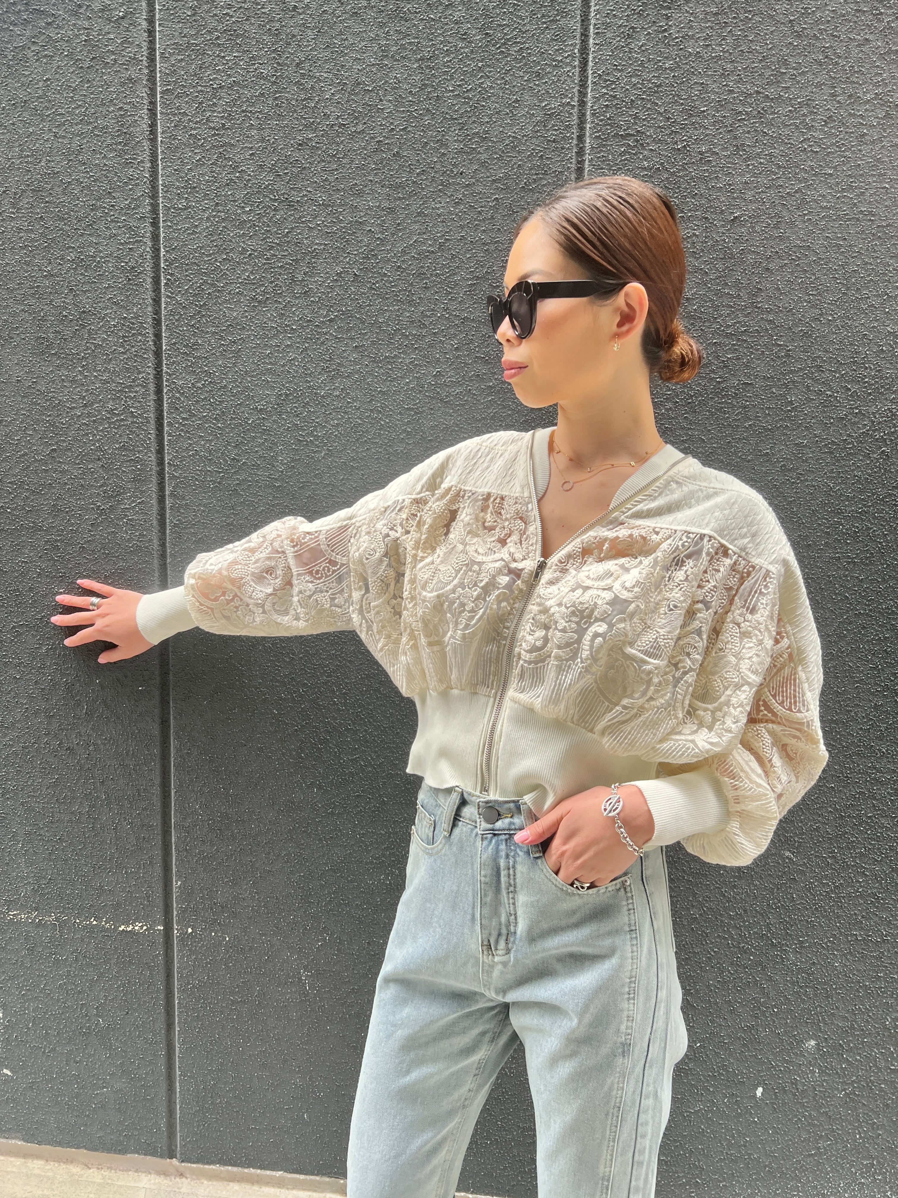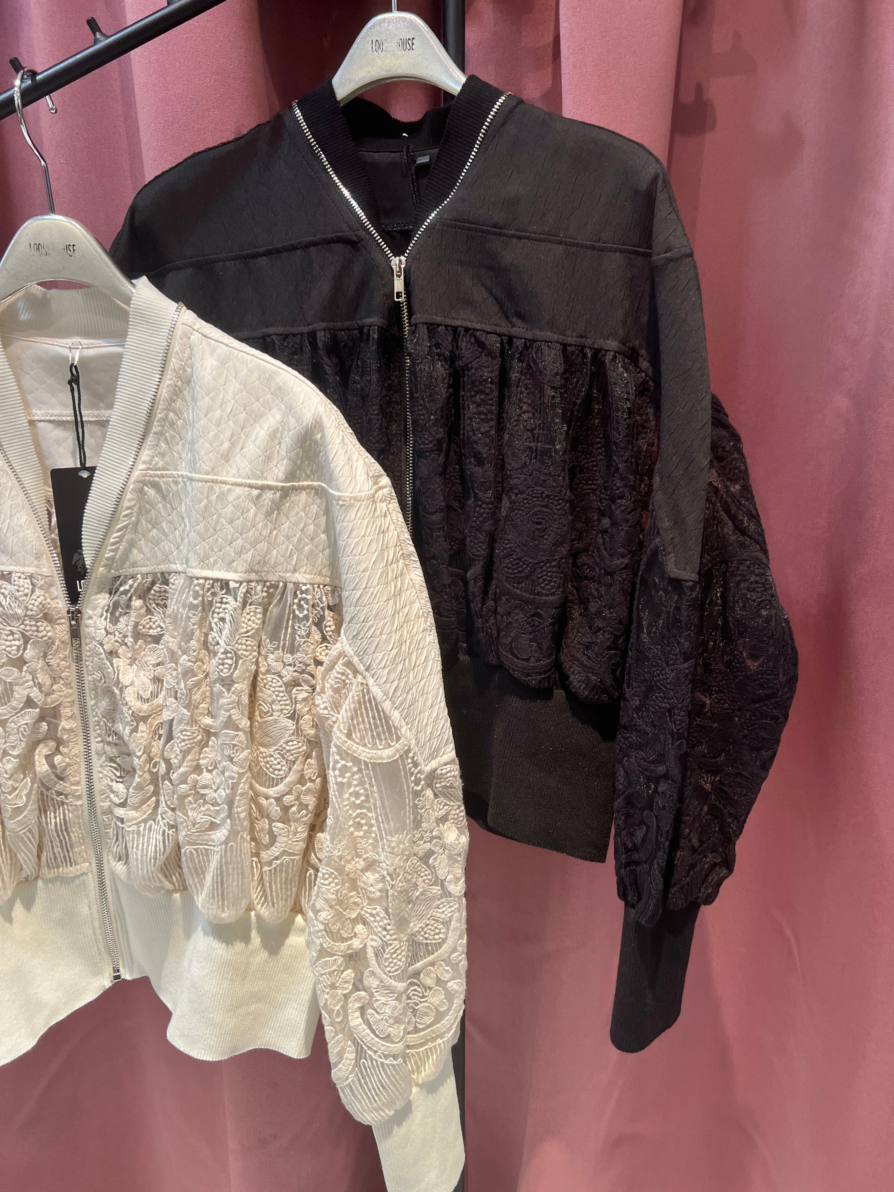 オーガンジーレース素材と、シックな切り替えデザインが印象的なブルゾンが登場しました♡春先取りのおしゃれを演出する一枚です。