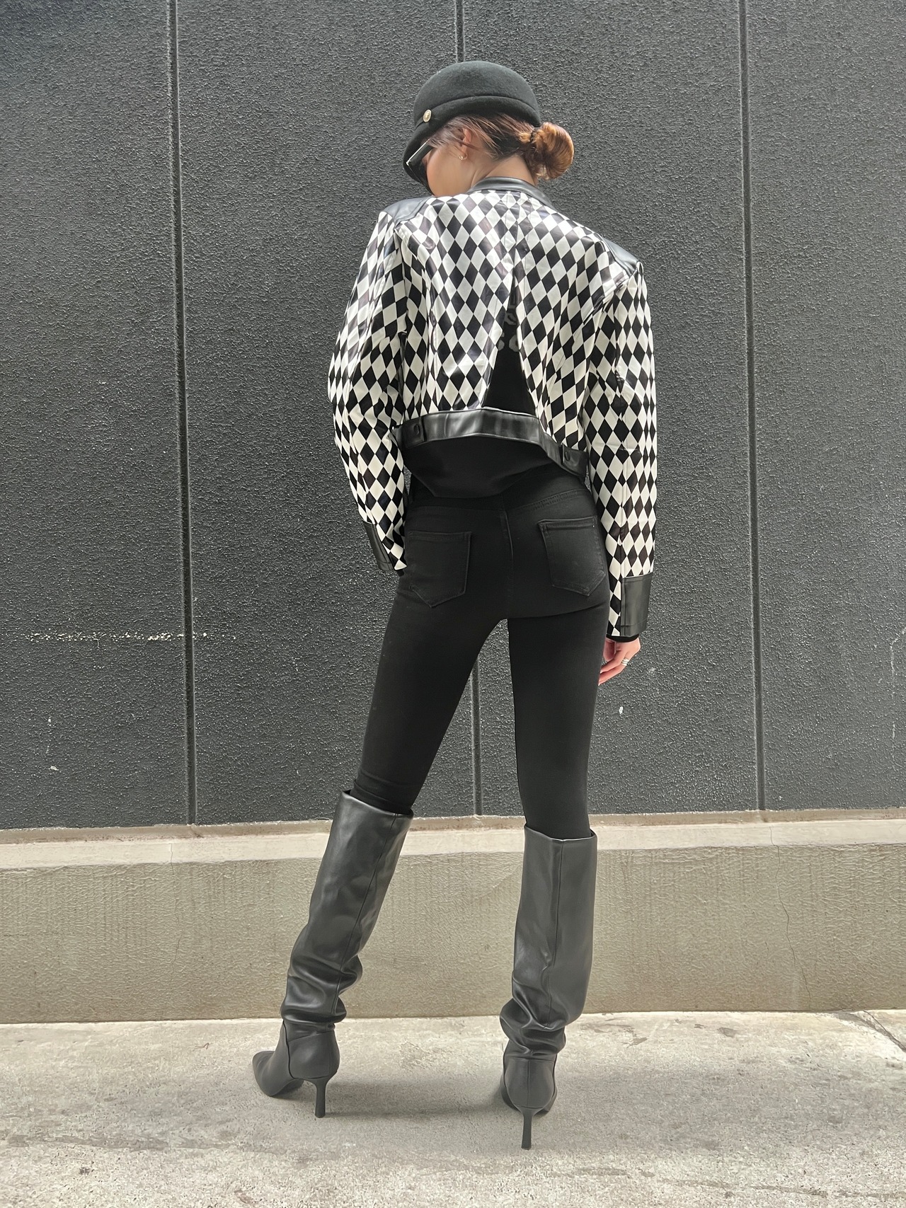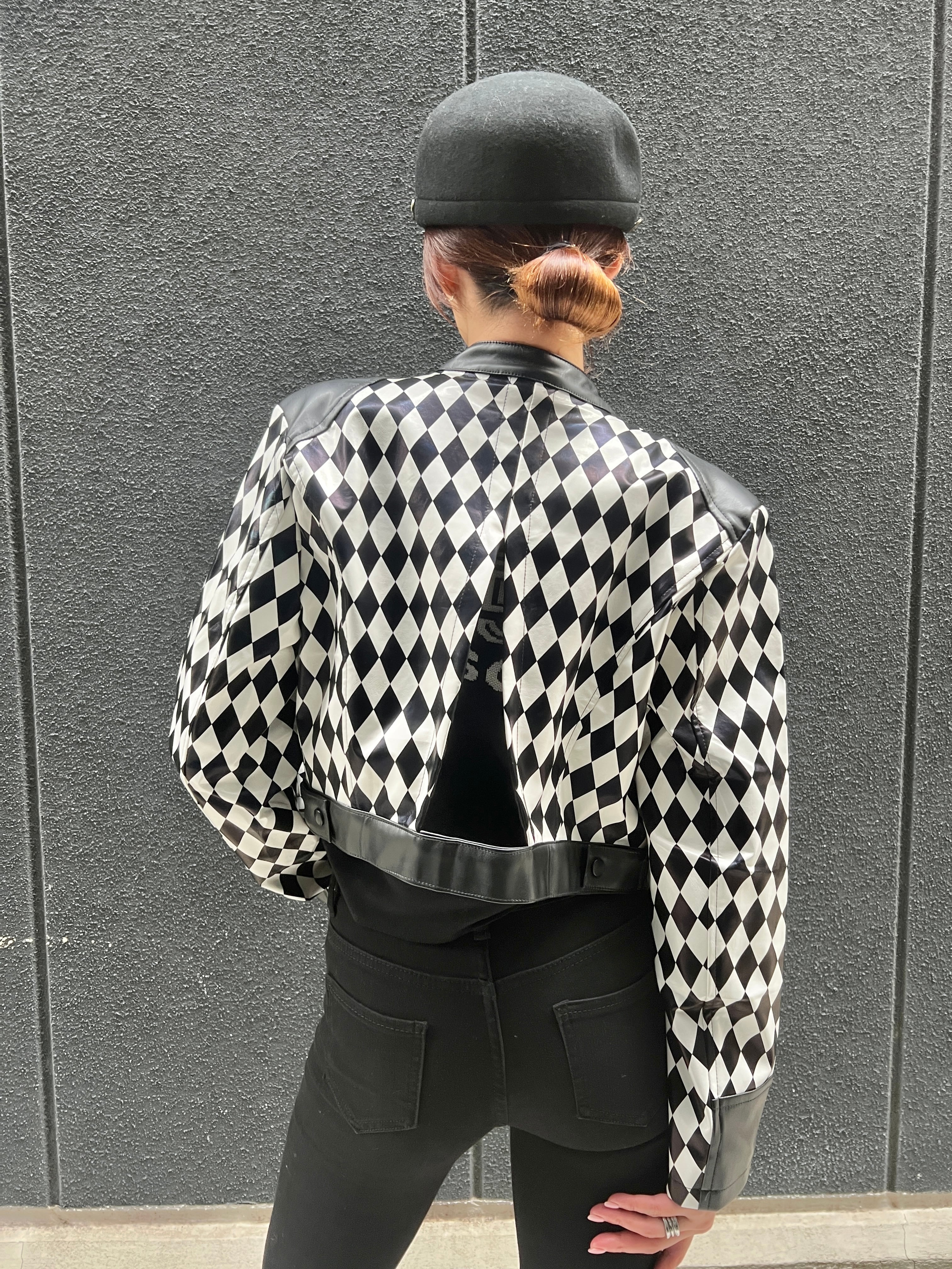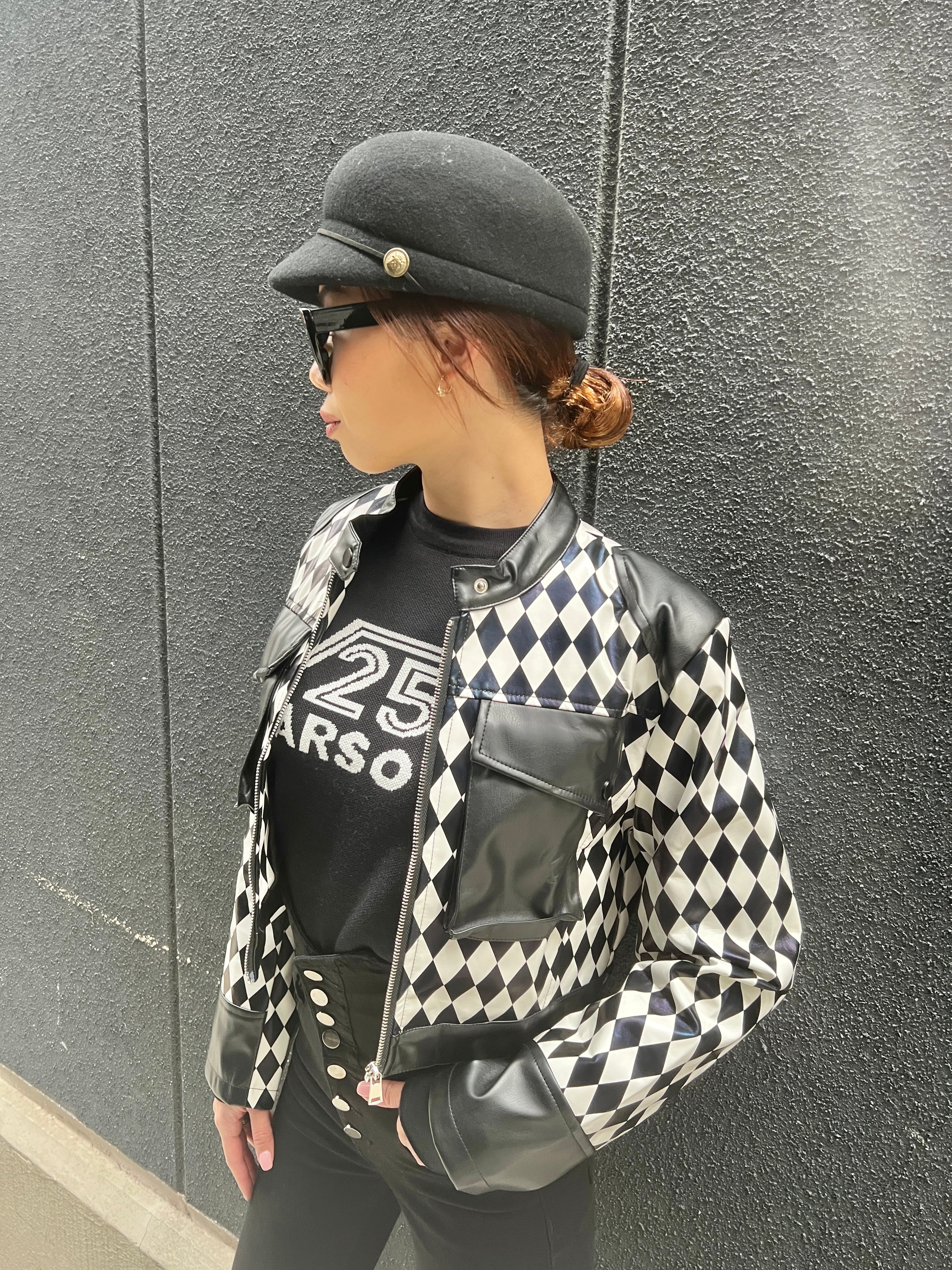 eco leather dia check design jacket ジャケット エコレザー 合皮 バイカラー 白黒 ダイヤ柄 デザインジャケット