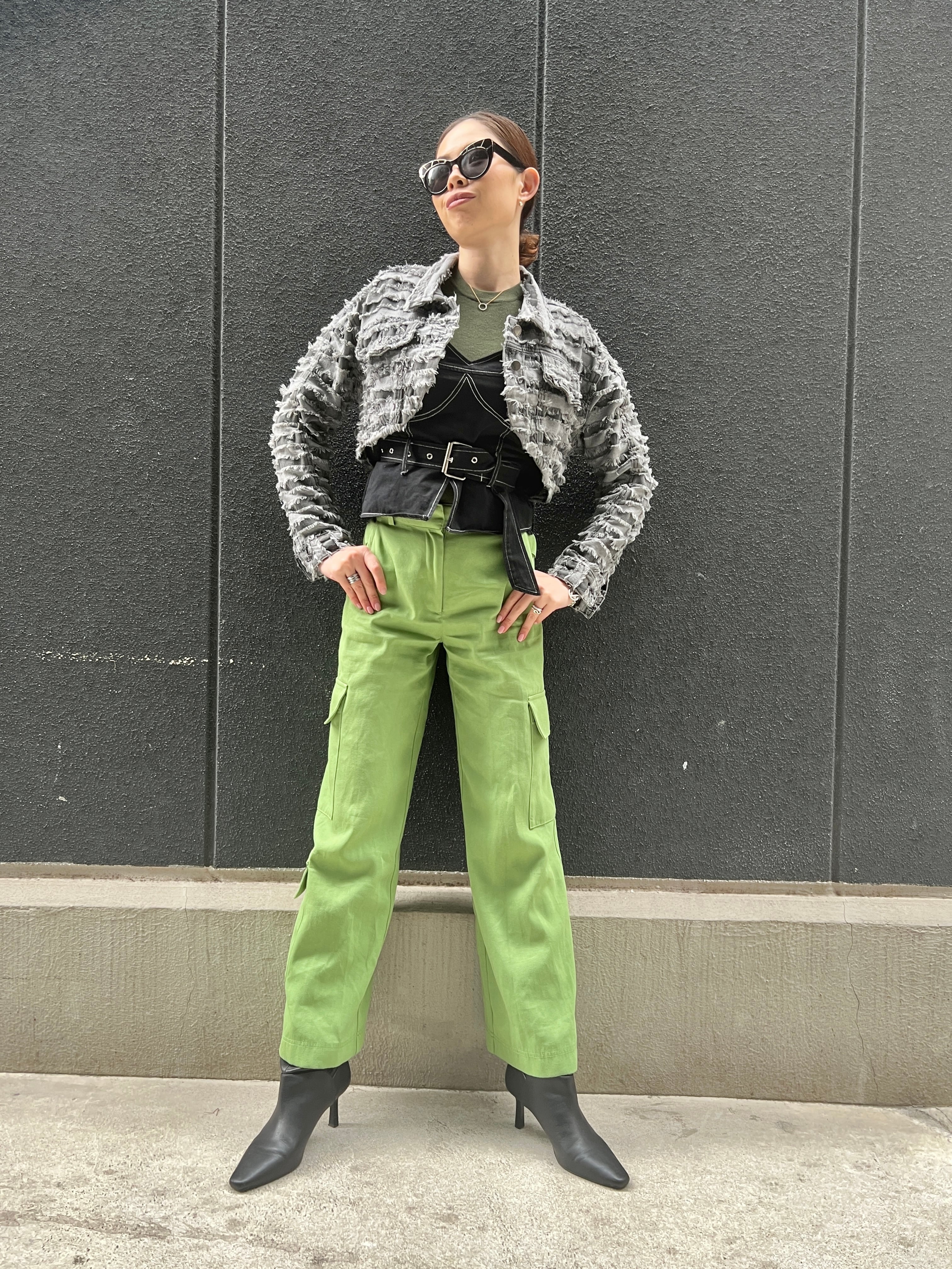 デニム素材なので、着こなしにカジュアルさを加えつつも、ボーダーデザインとフリンジのアクセントでオシャレ感もプラス♪
