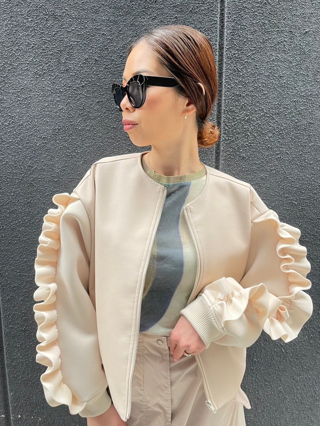 eco leather × urethane change design blouson ジャケット ブルゾン エコレザー 合皮 フリル 異素材切替