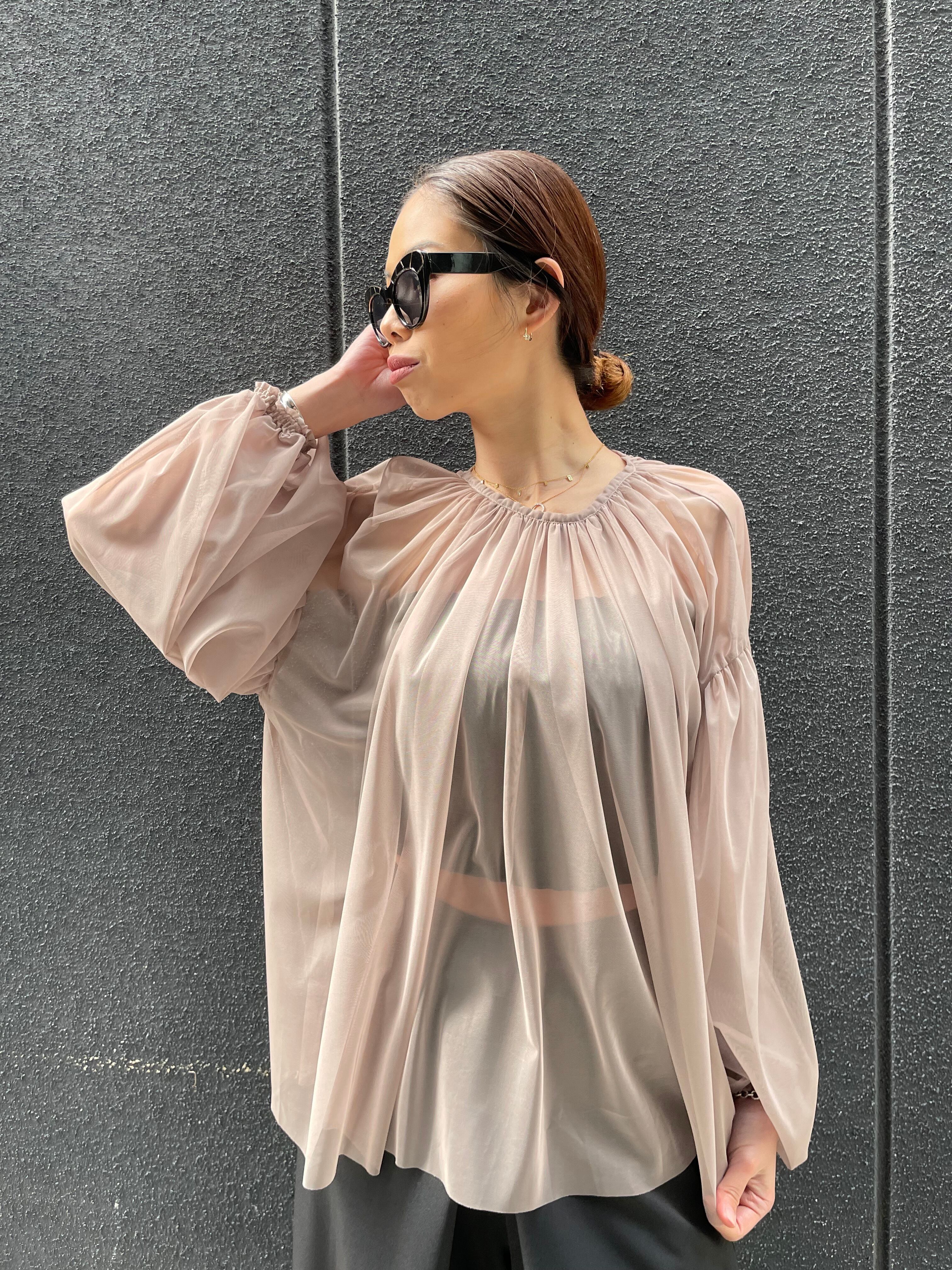 stretch net gather neck design tops トップス ストレッチ ネット ギャザー リボン シアー シースルー 重ね着