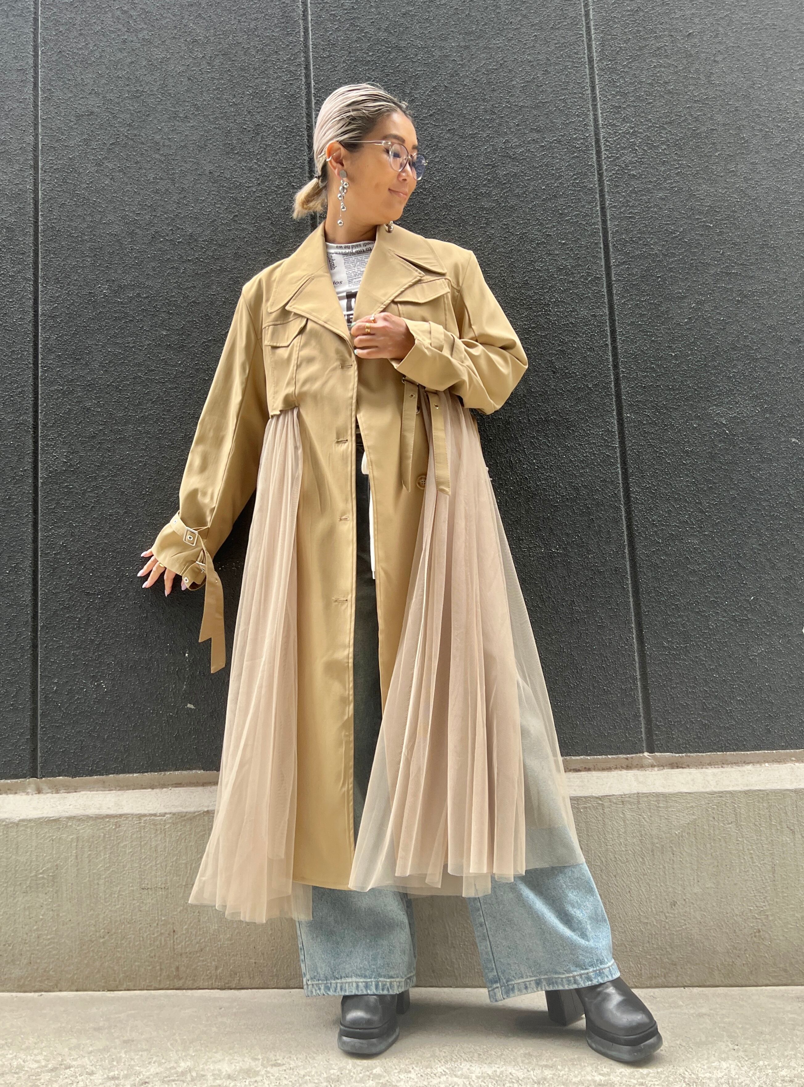 素材にこだわるなら、チュール素材の切り替えがポイントのトレンチコート♡