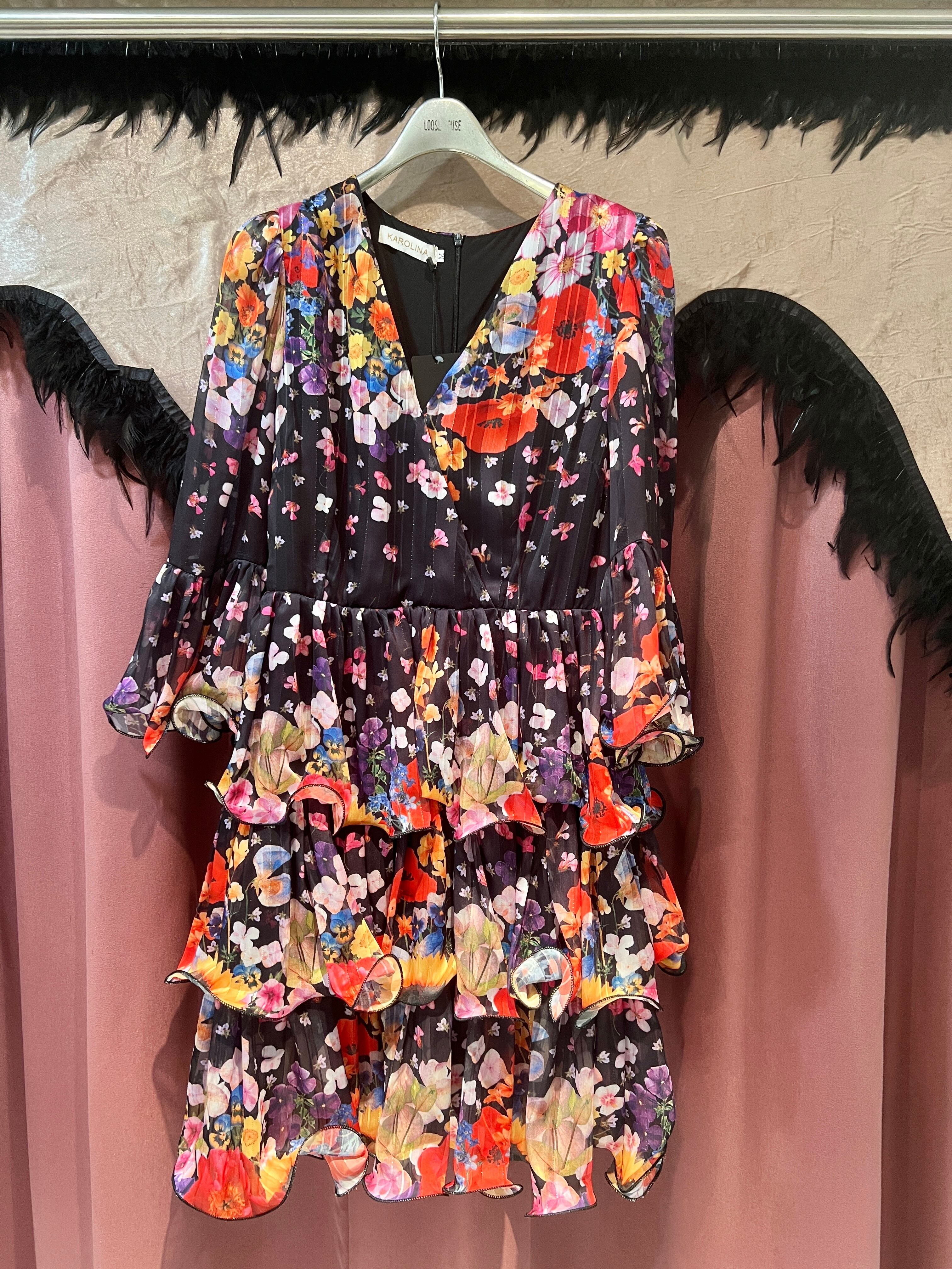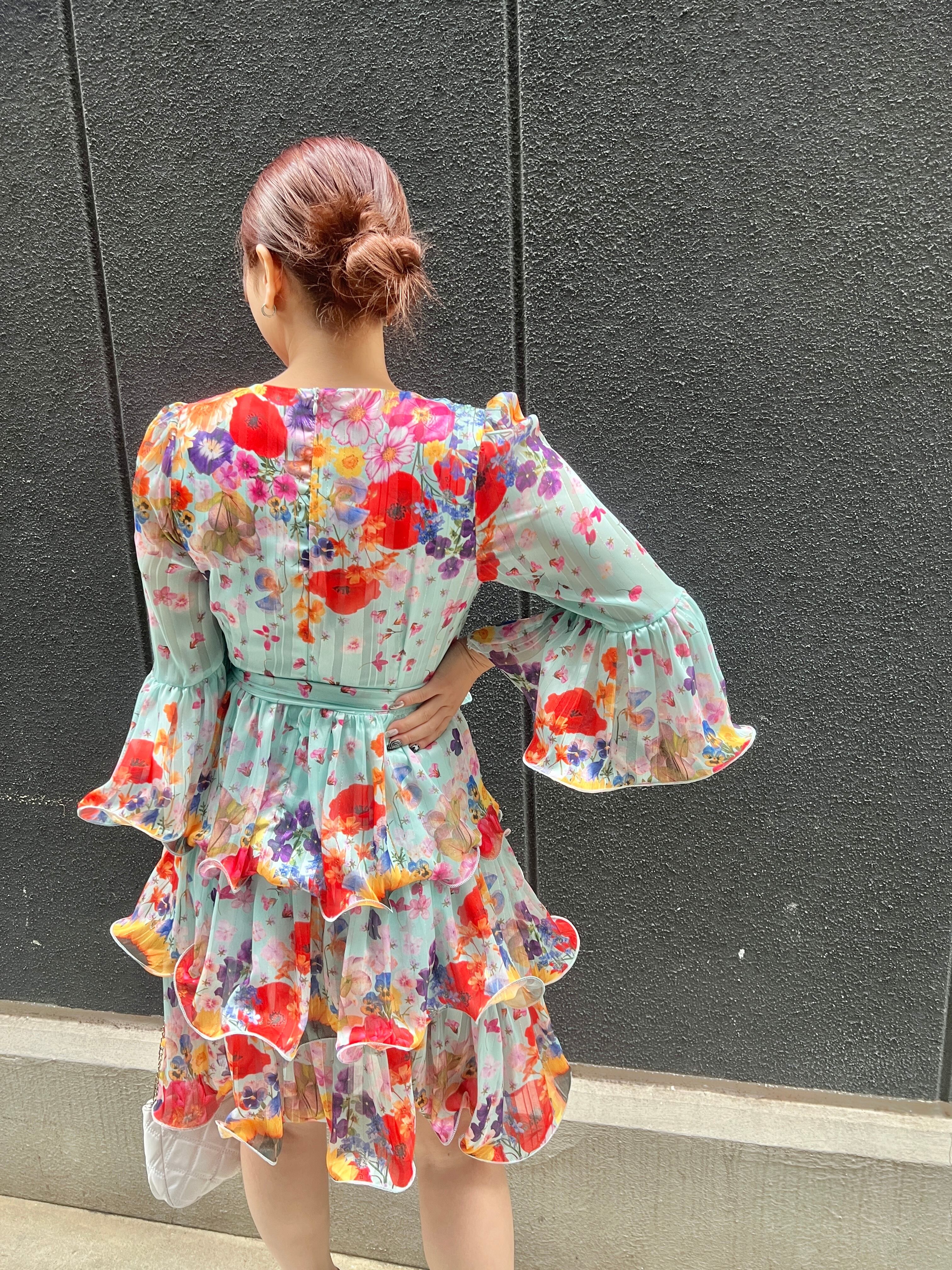 カラフルなフラワープリントが可愛い、ティアードフリルワンピースの登場です!
