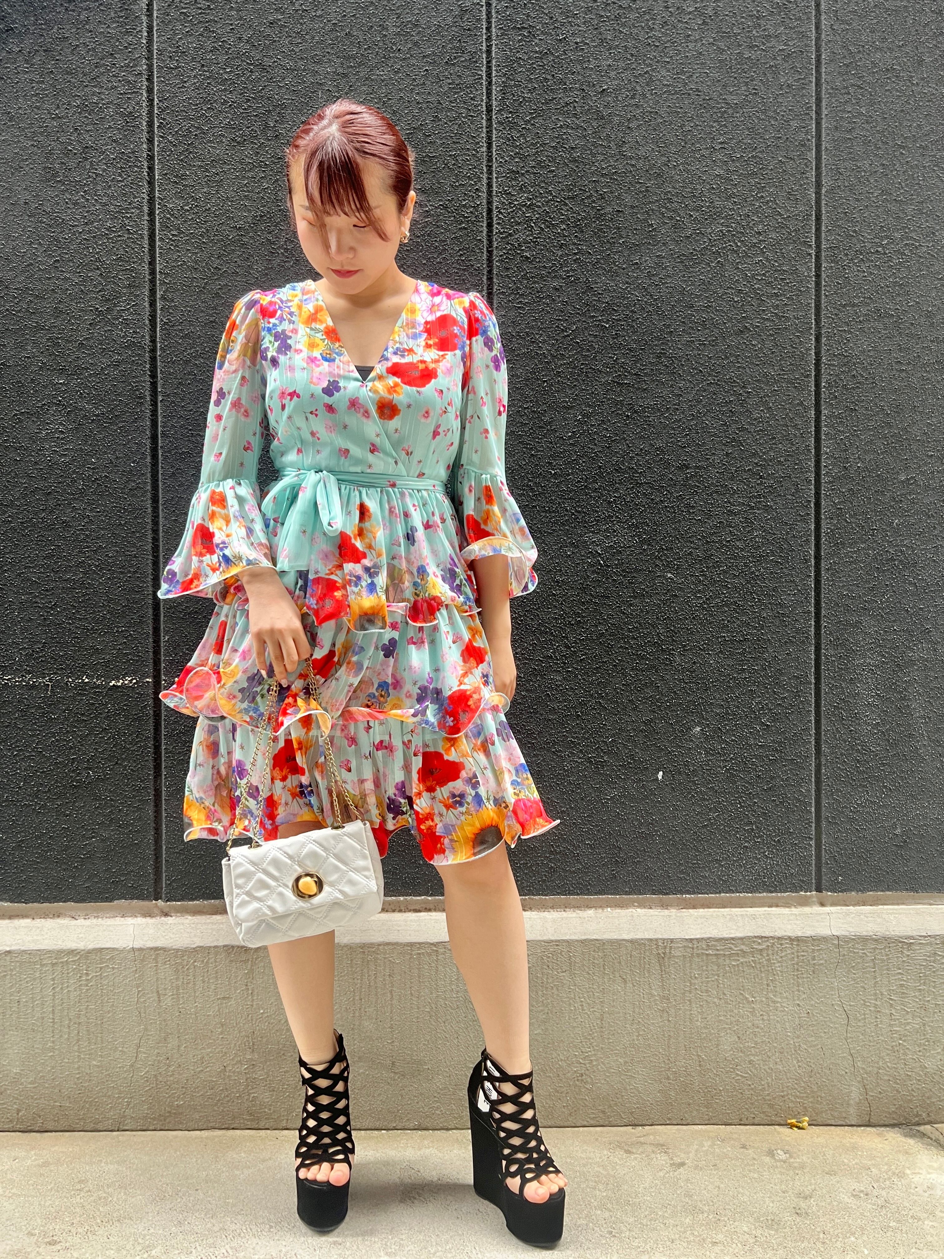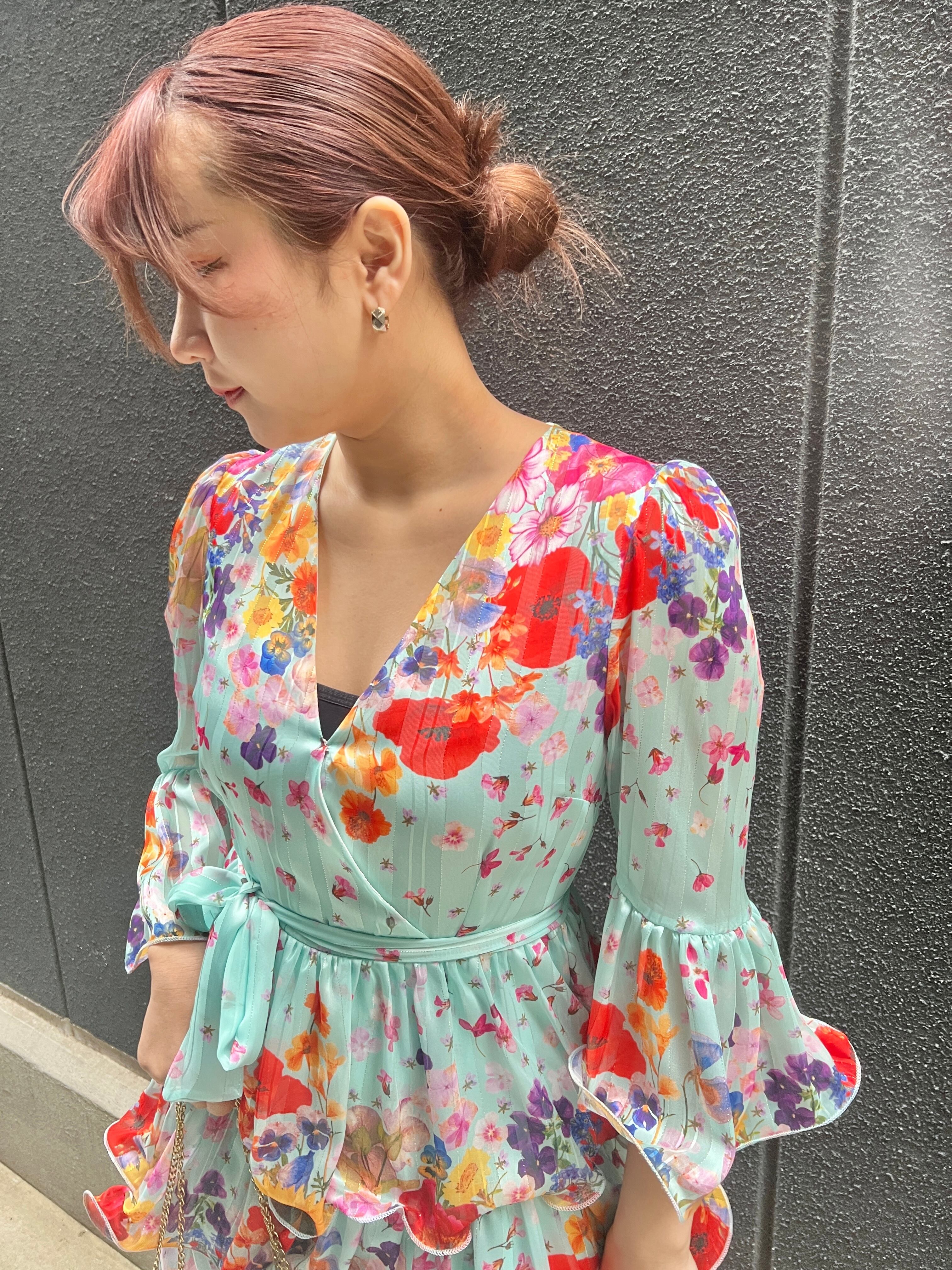 flower print cache-Vneck tiered frill design one-piece ワンピース ワンピ 花柄 フリル シフォン リボンベルト