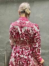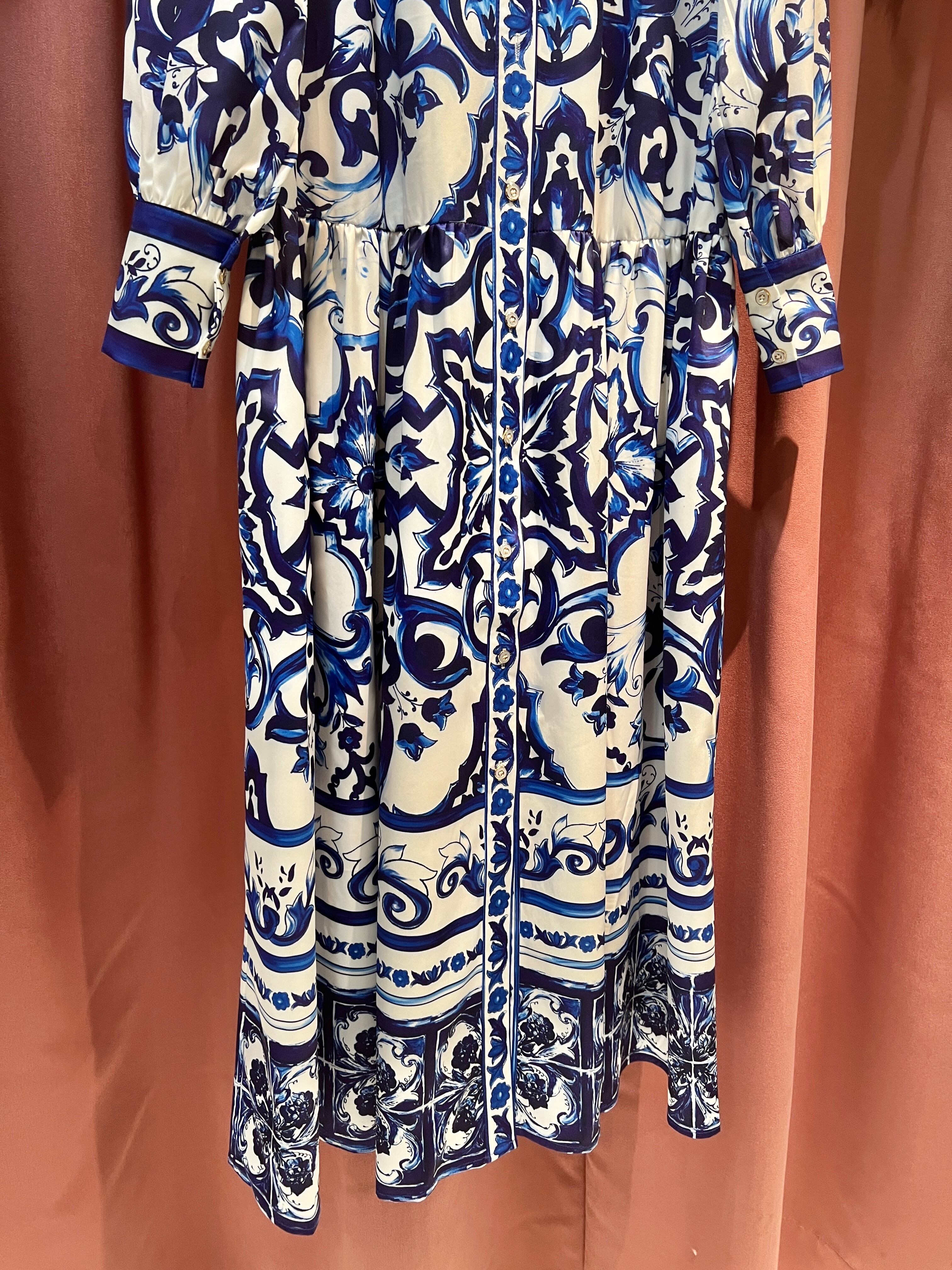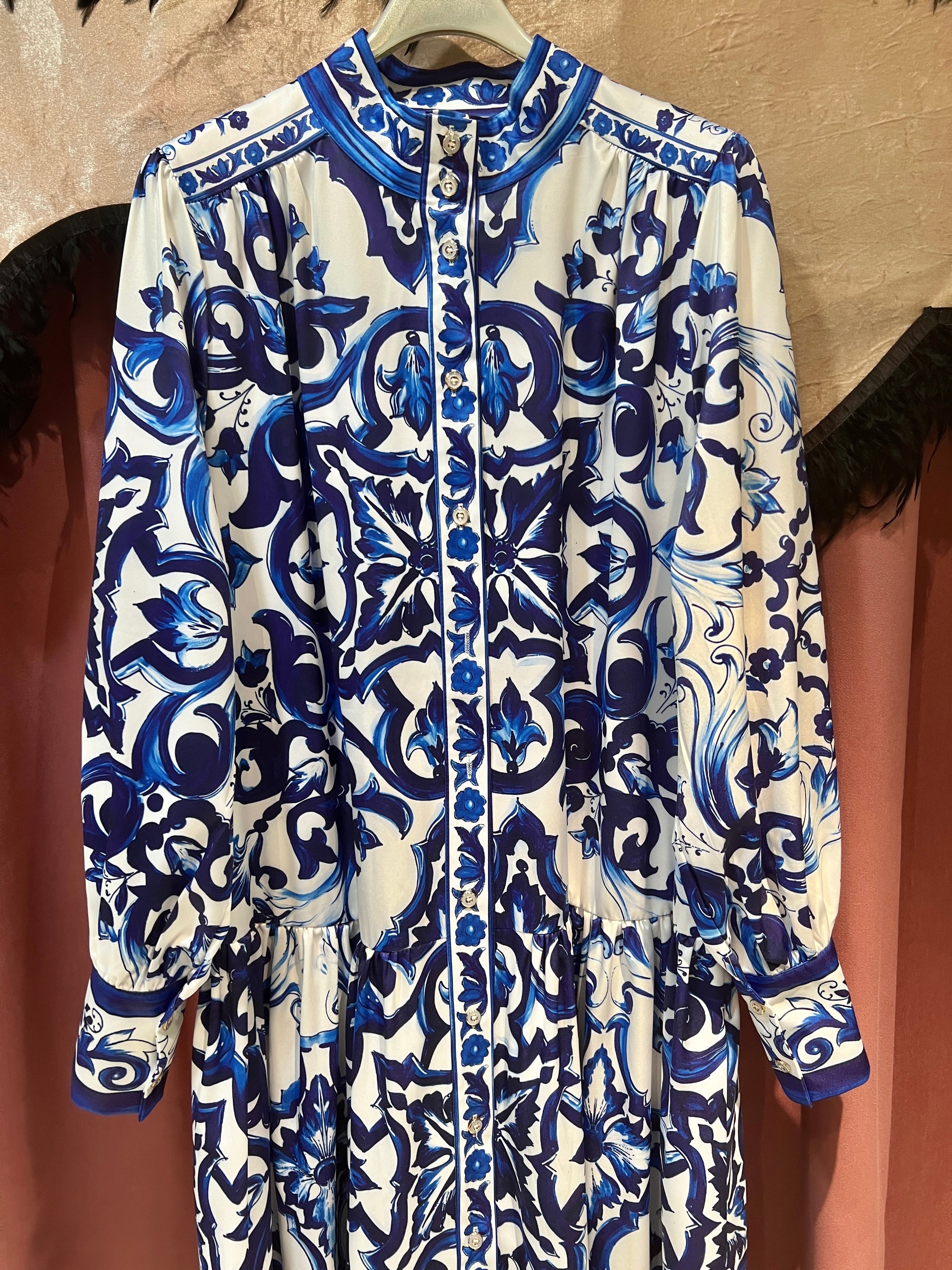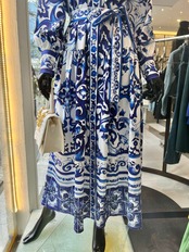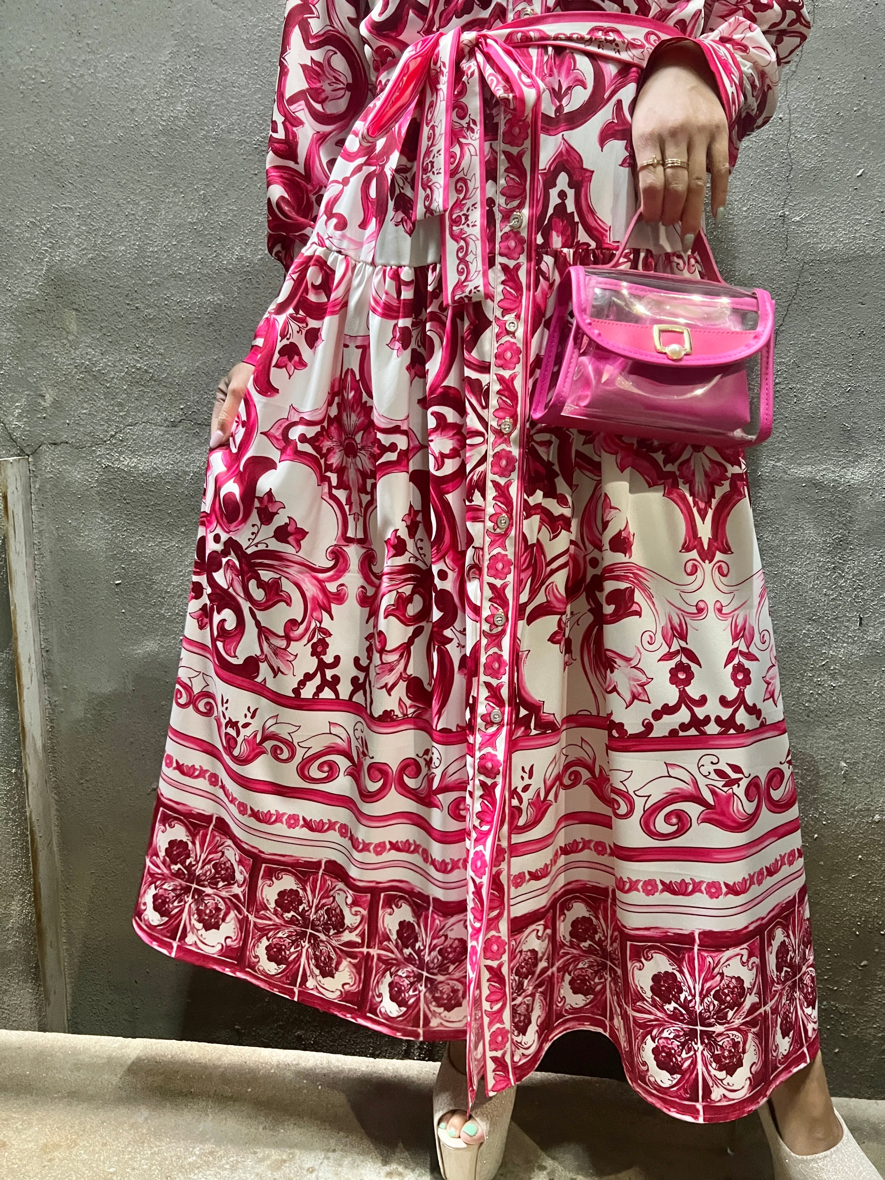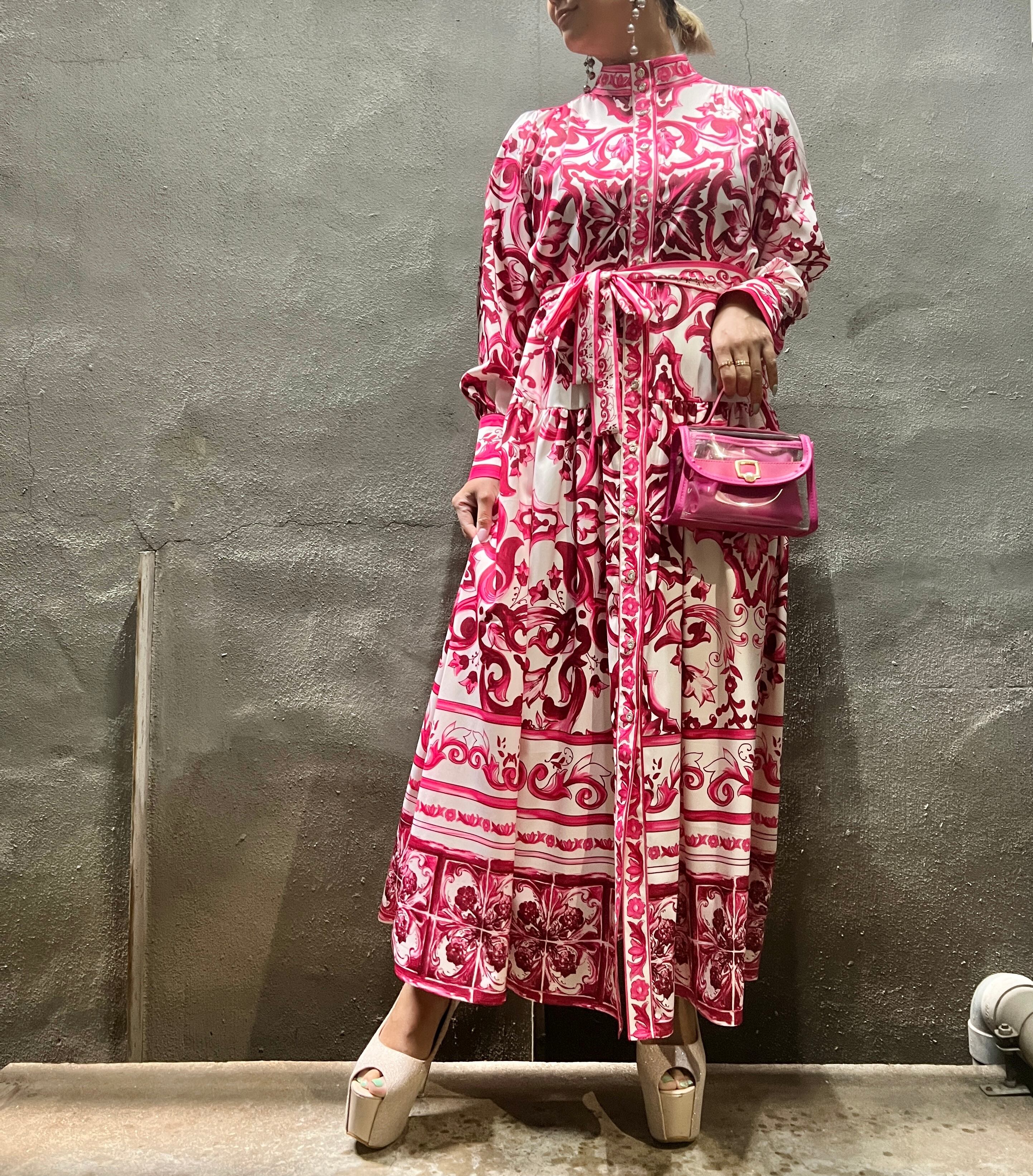 bi-color print stand neck ribbon belt design one-piece ワンピース ワンピ ロングワンピ スタンドネック 花柄