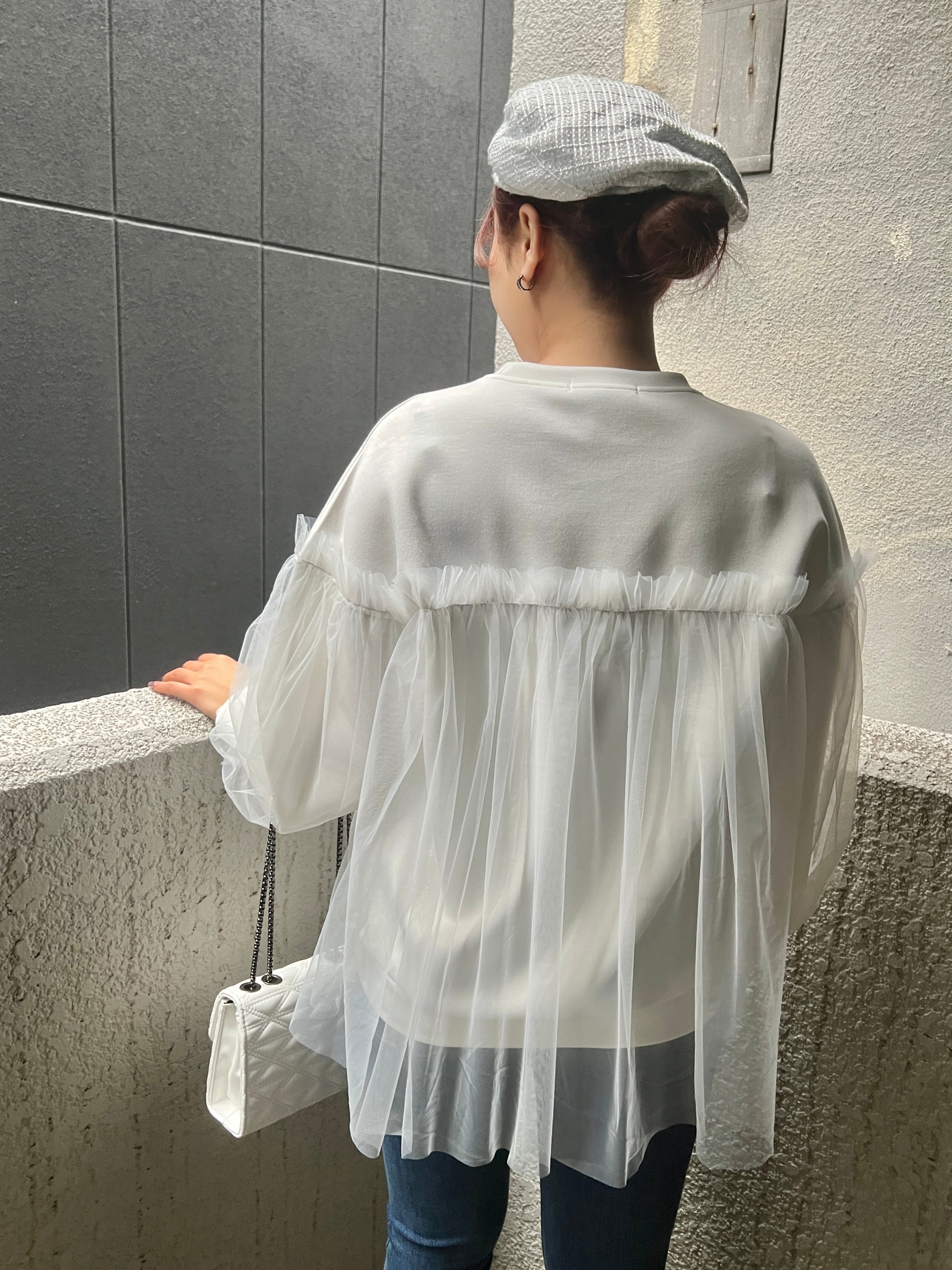 チュールが重なったデザインが、カジュアルなトレーナーにちょっぴりエレガンスと女性らしさをプラスしてくれます♪