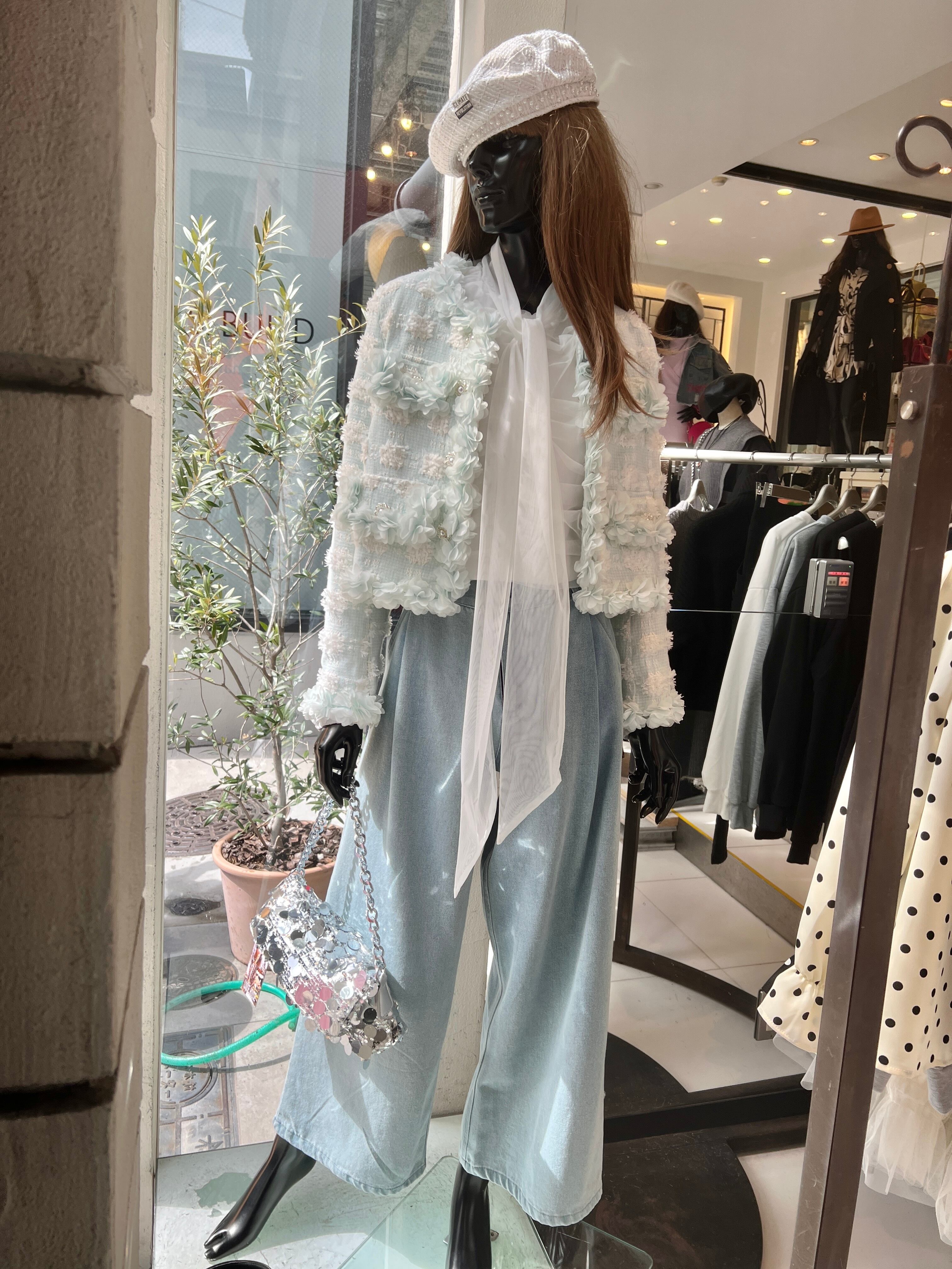 3D flower C-neck design jacketは、立体的なフラワーモチーフが目を惹く、春らしいデザインジャケットです♪