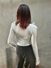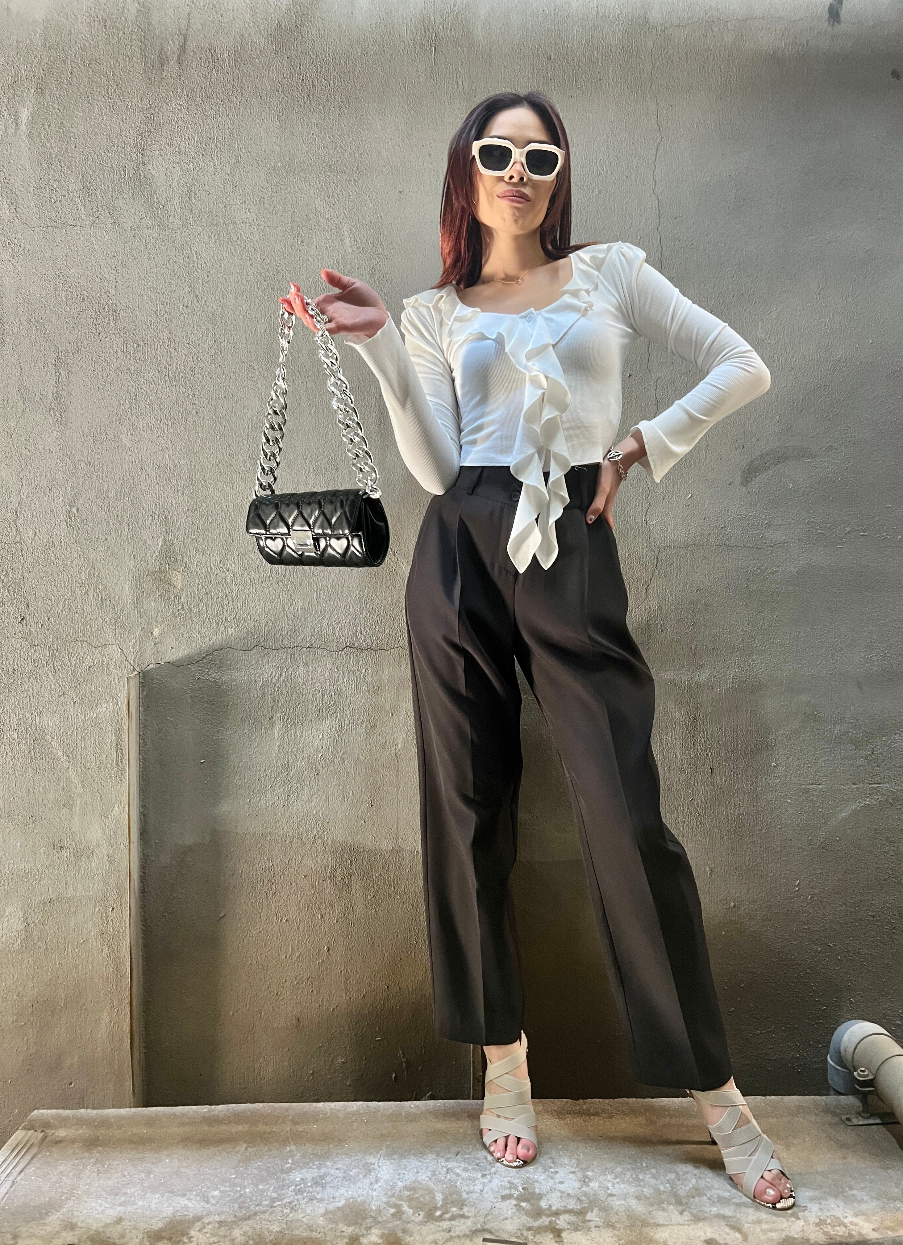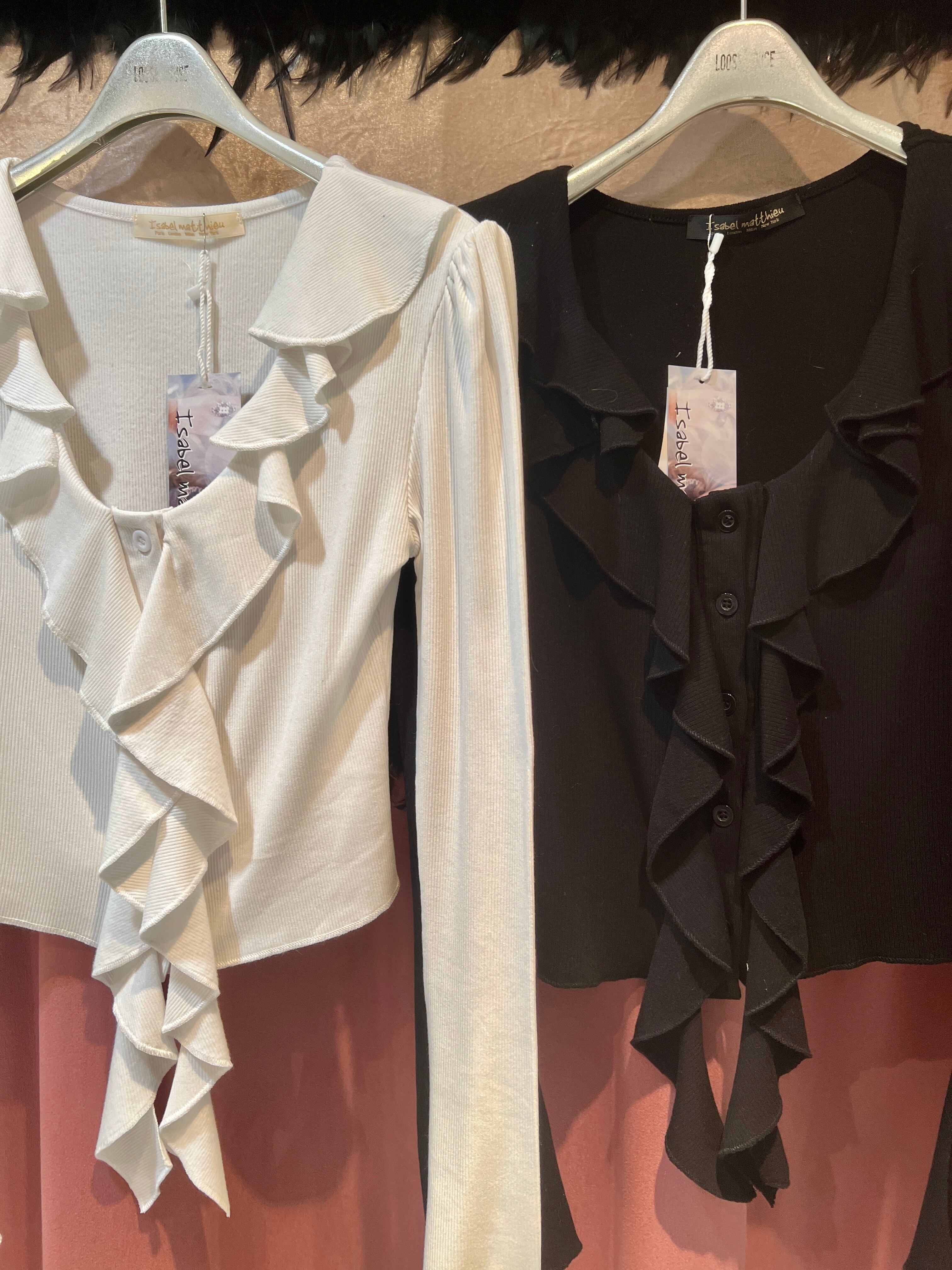 深めのVネックと前開きデザインが、スッキリとした印象を与え、華やかなフリルが程よいアクセントに♡