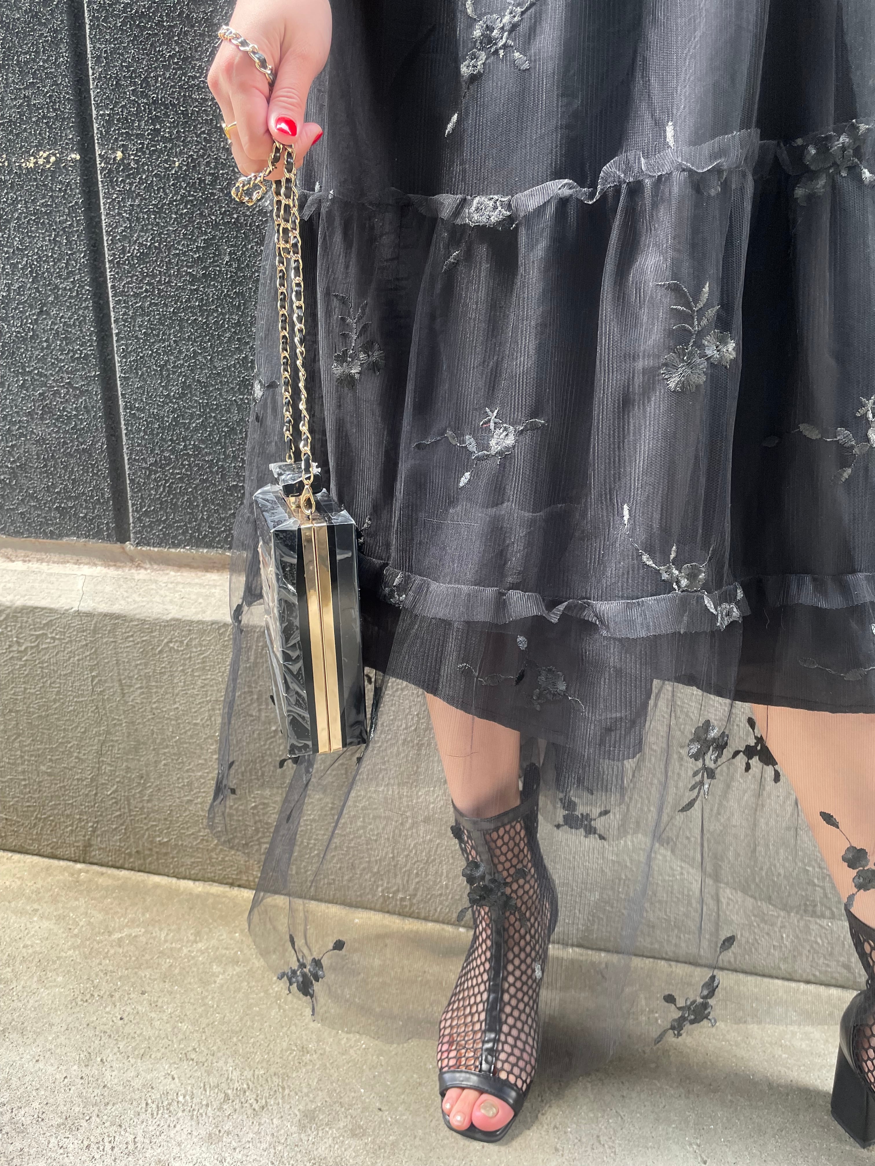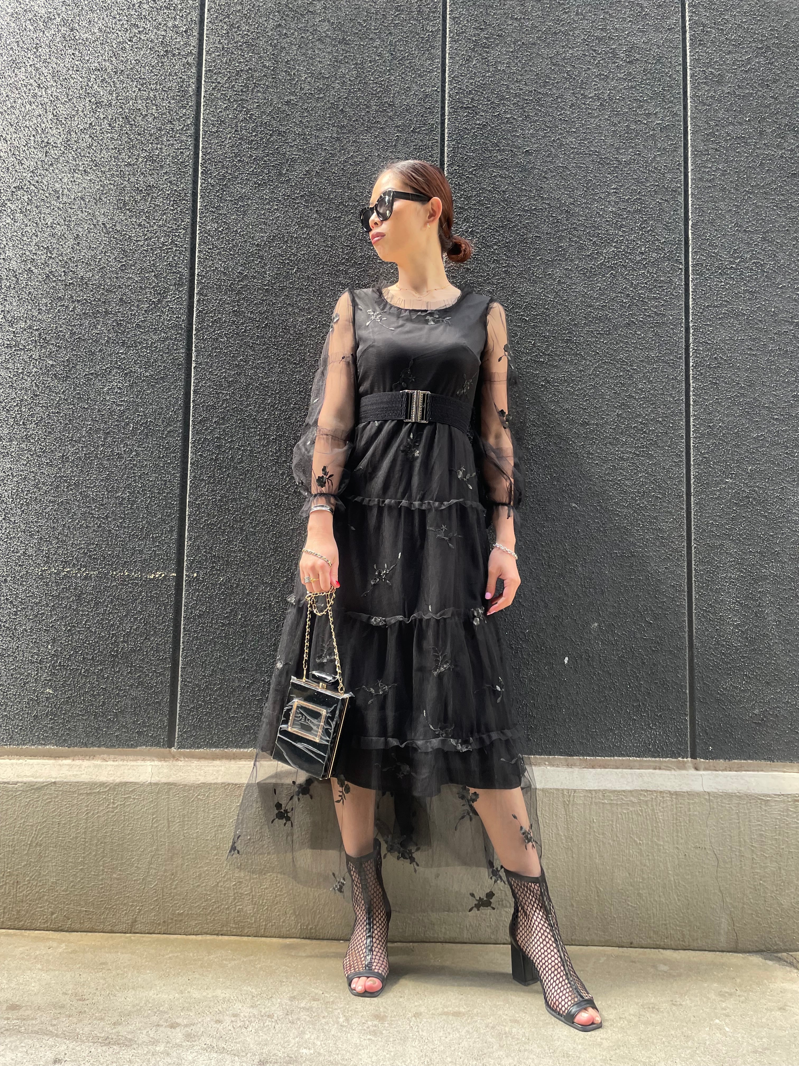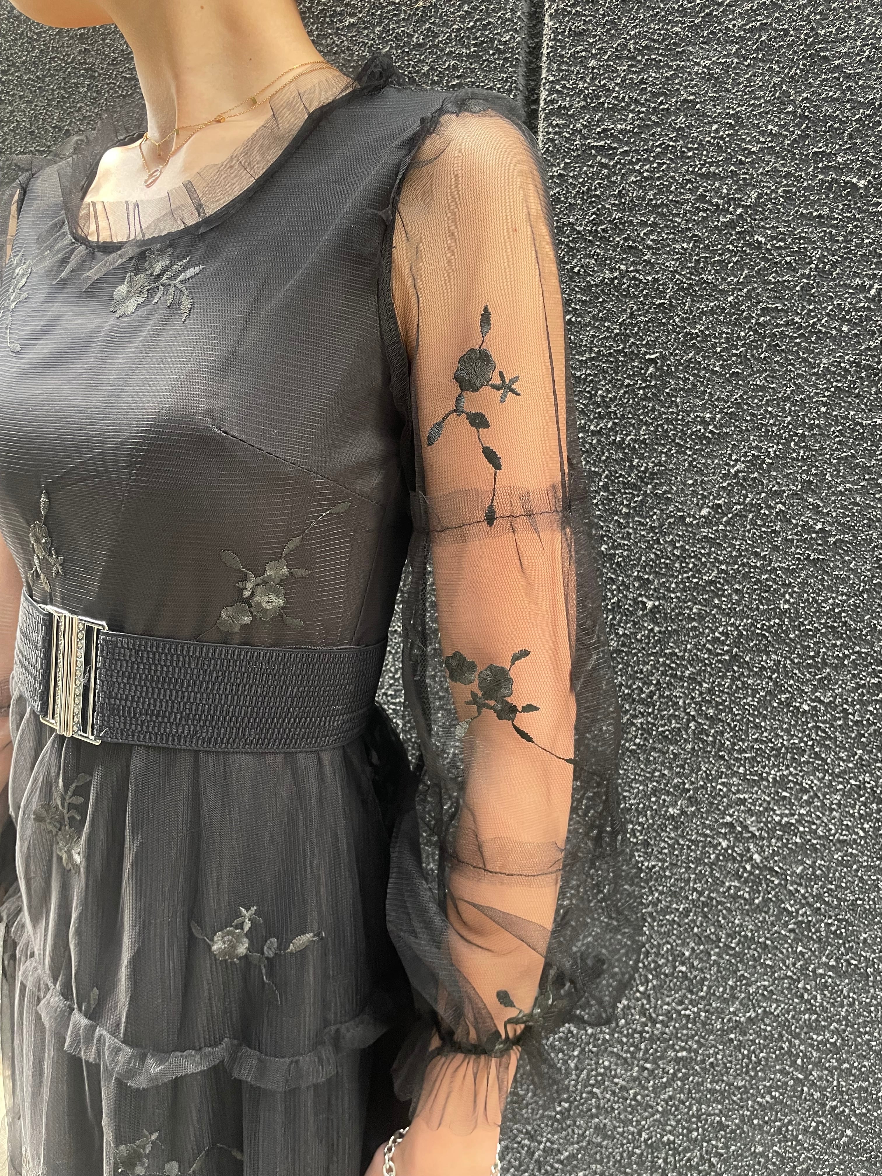 tulle lace tiered gather long one-piece ワンピース ロングワンピ チュール レース ギャザー ベルト付き ブラック 黒 結婚式 二次会 パーティー