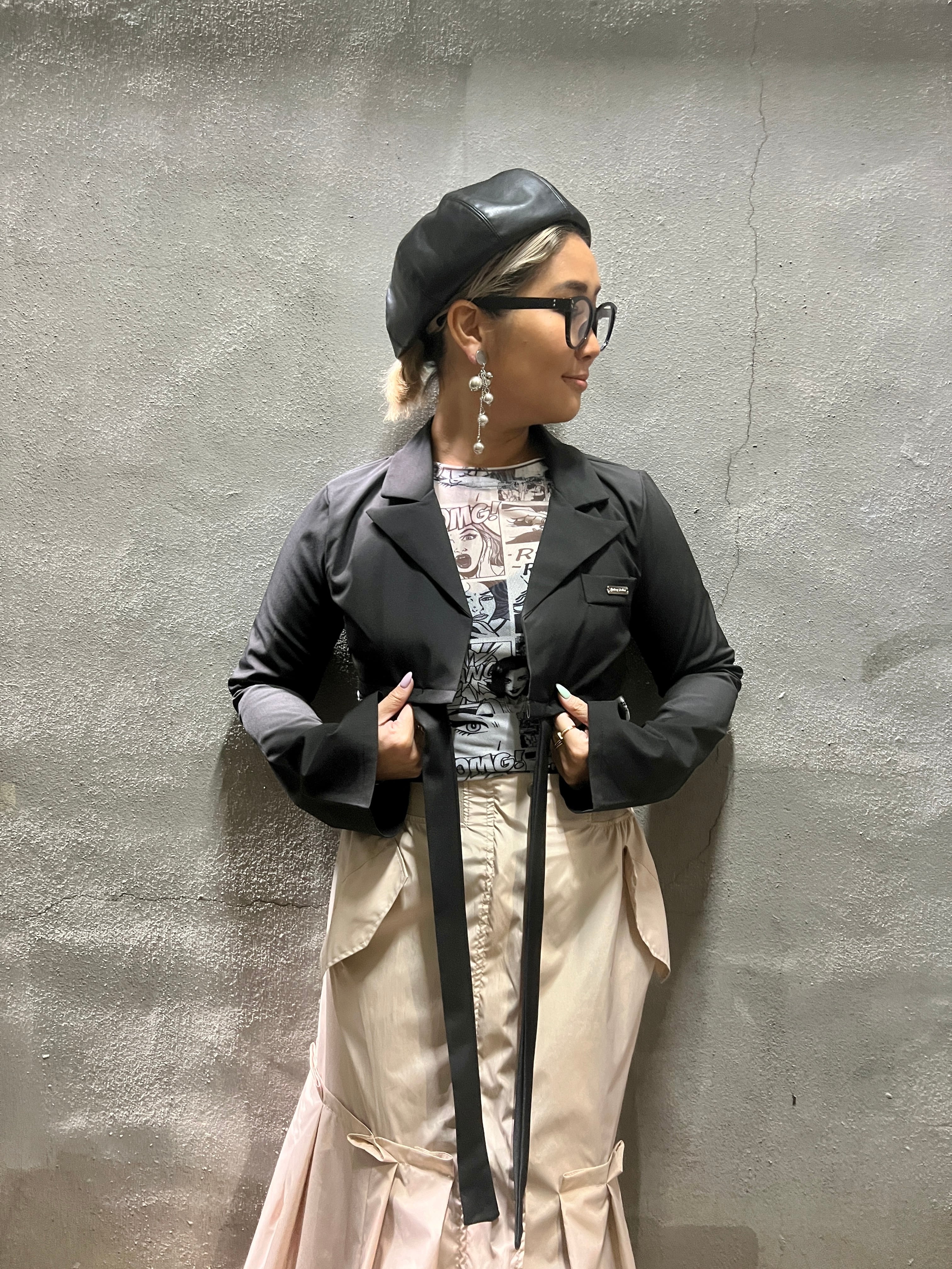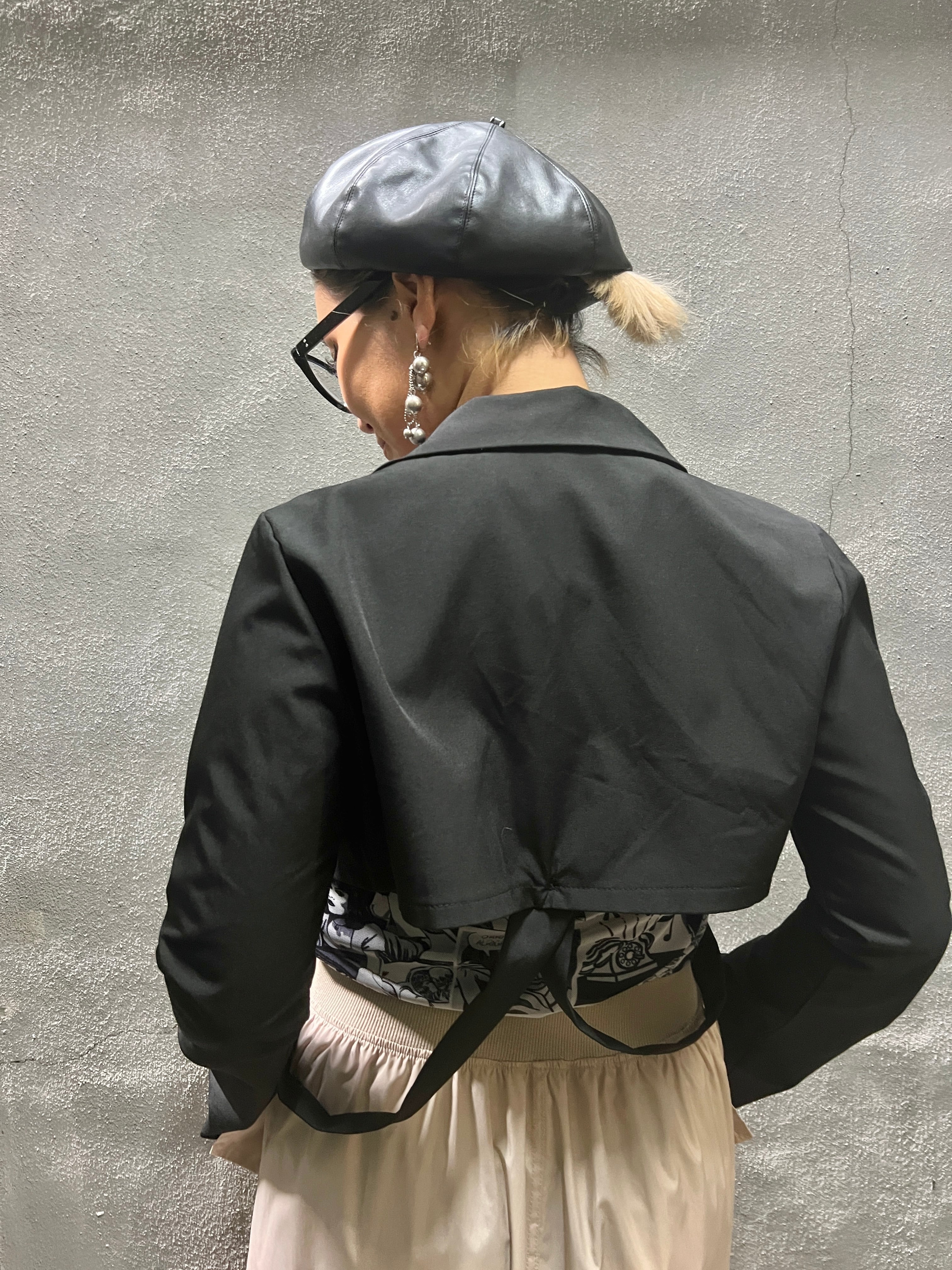cross belt design short jacket ジャケット ショート丈 テーラード リボンベルト 取り外し ブラック 黒