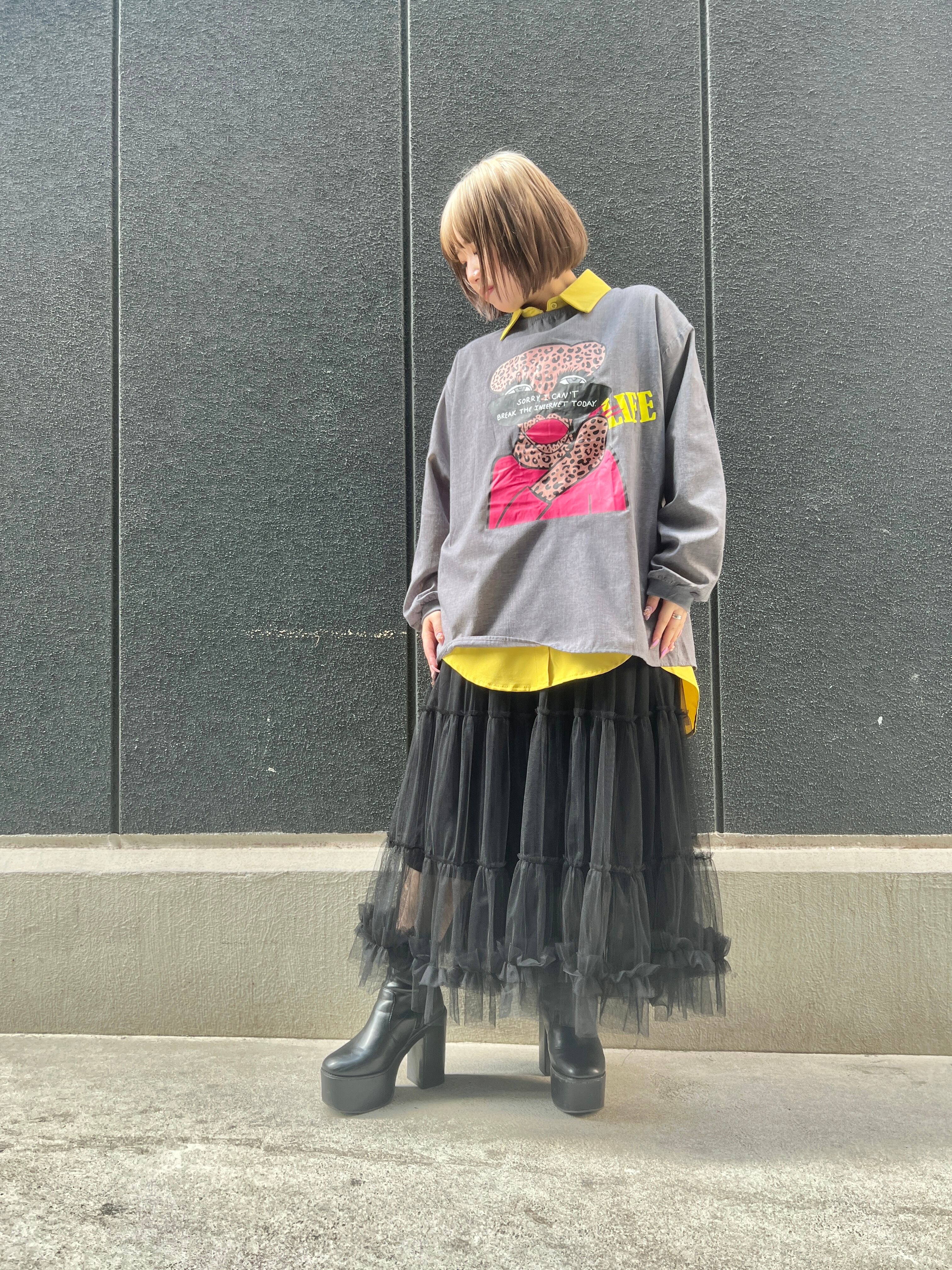襟付きシャツやメッシュトップスをINして着るのもアリ〇