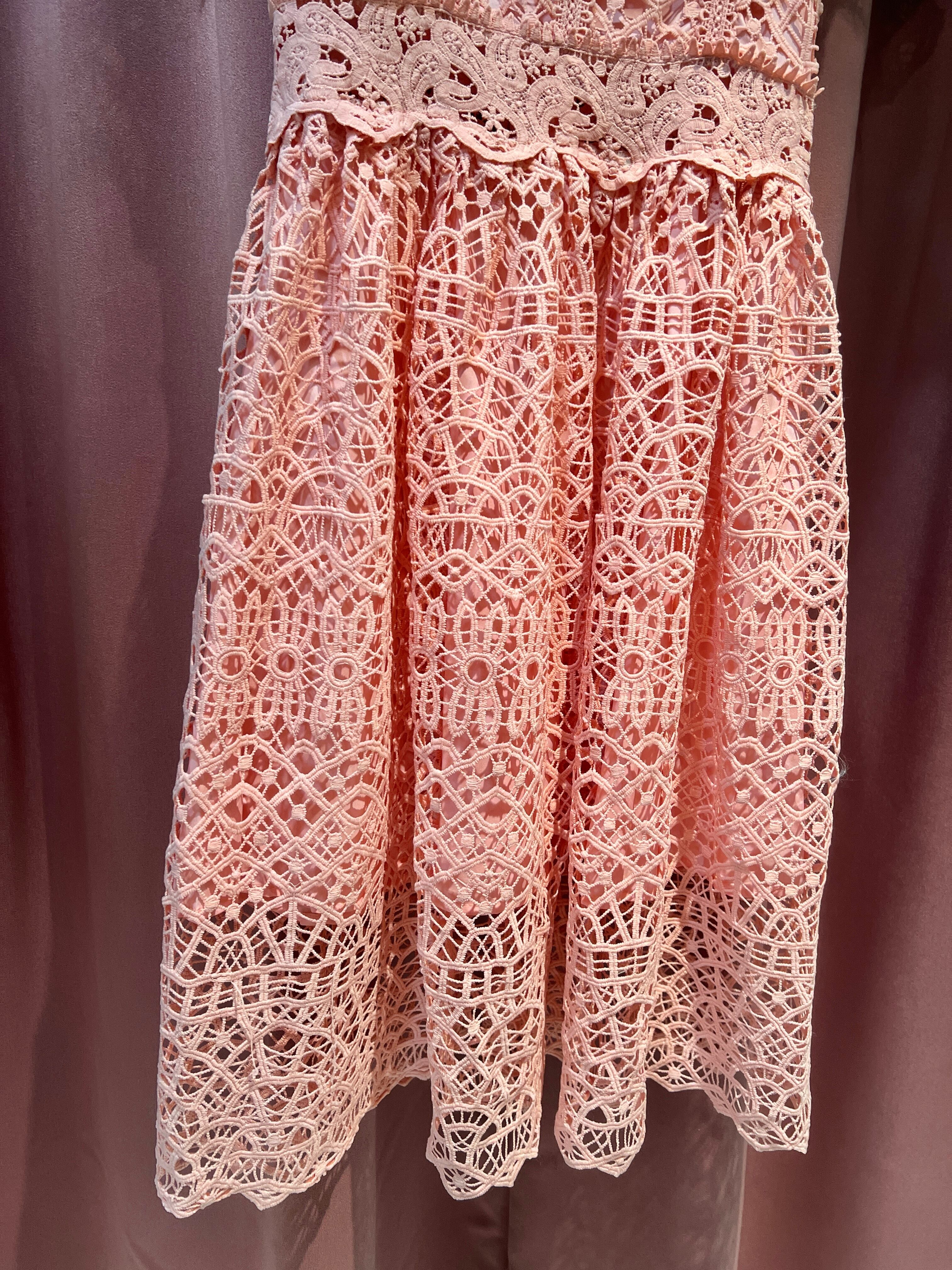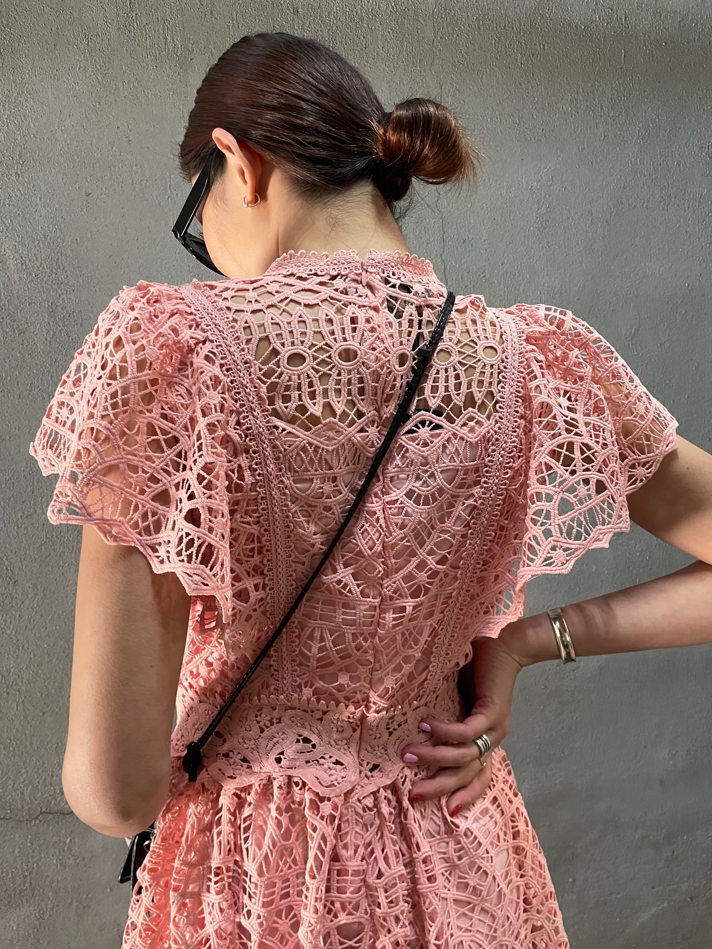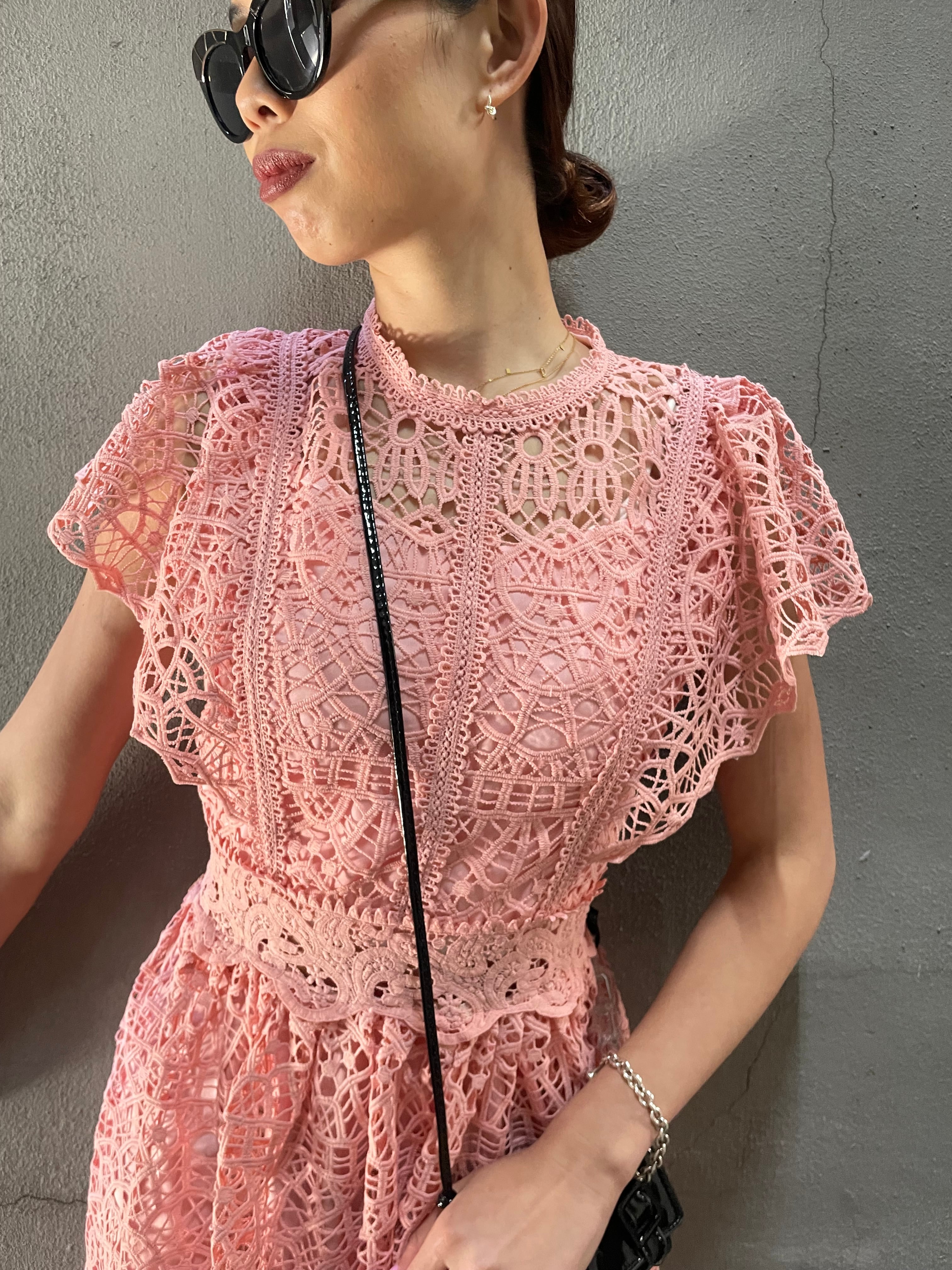 フリフリの襟のような袖が目を引く、ピンクの総レースワンピース。