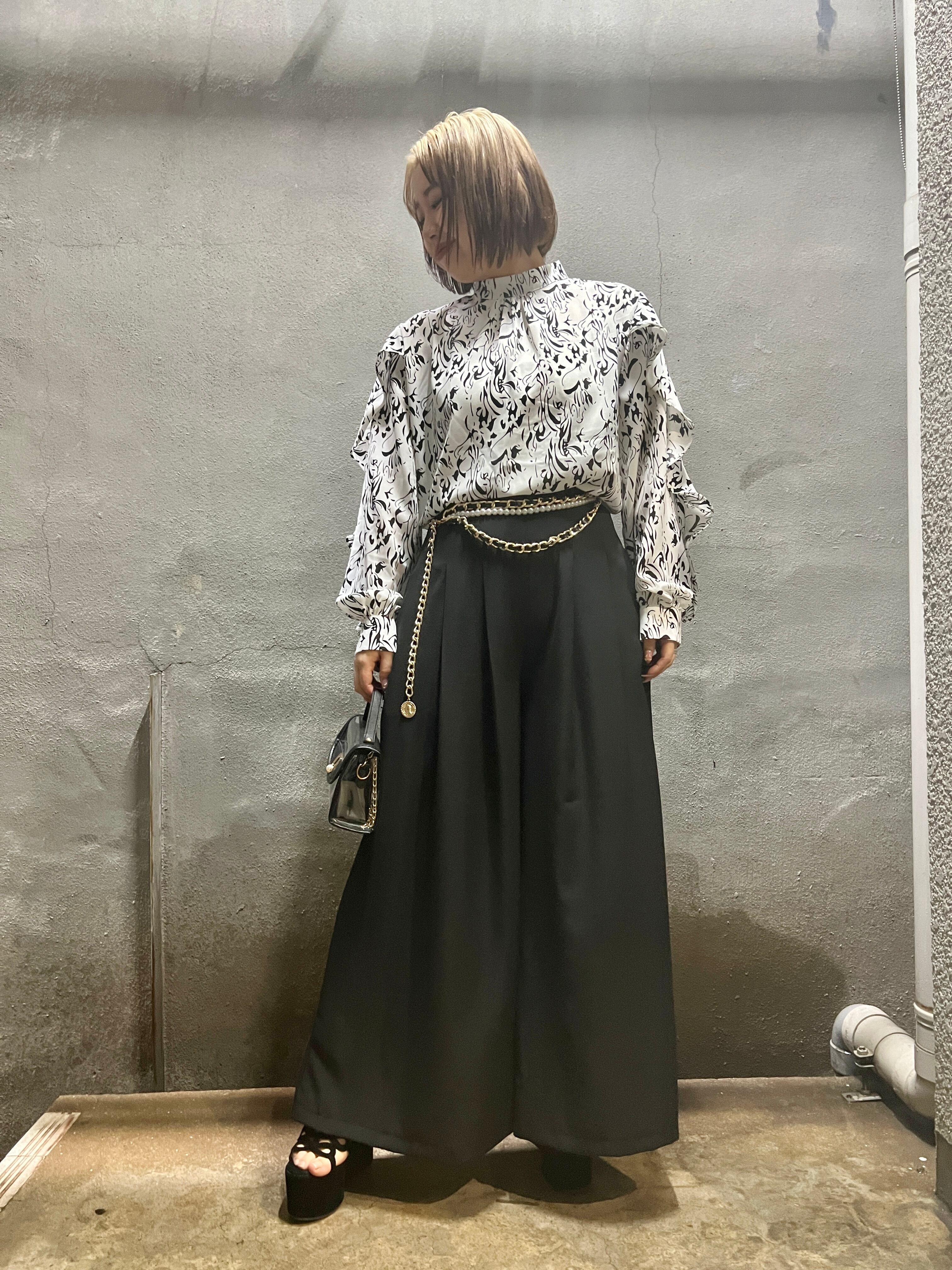 frill sleeve stand neck print tops トップス フリル デザインスリーブ バイカラー 白黒