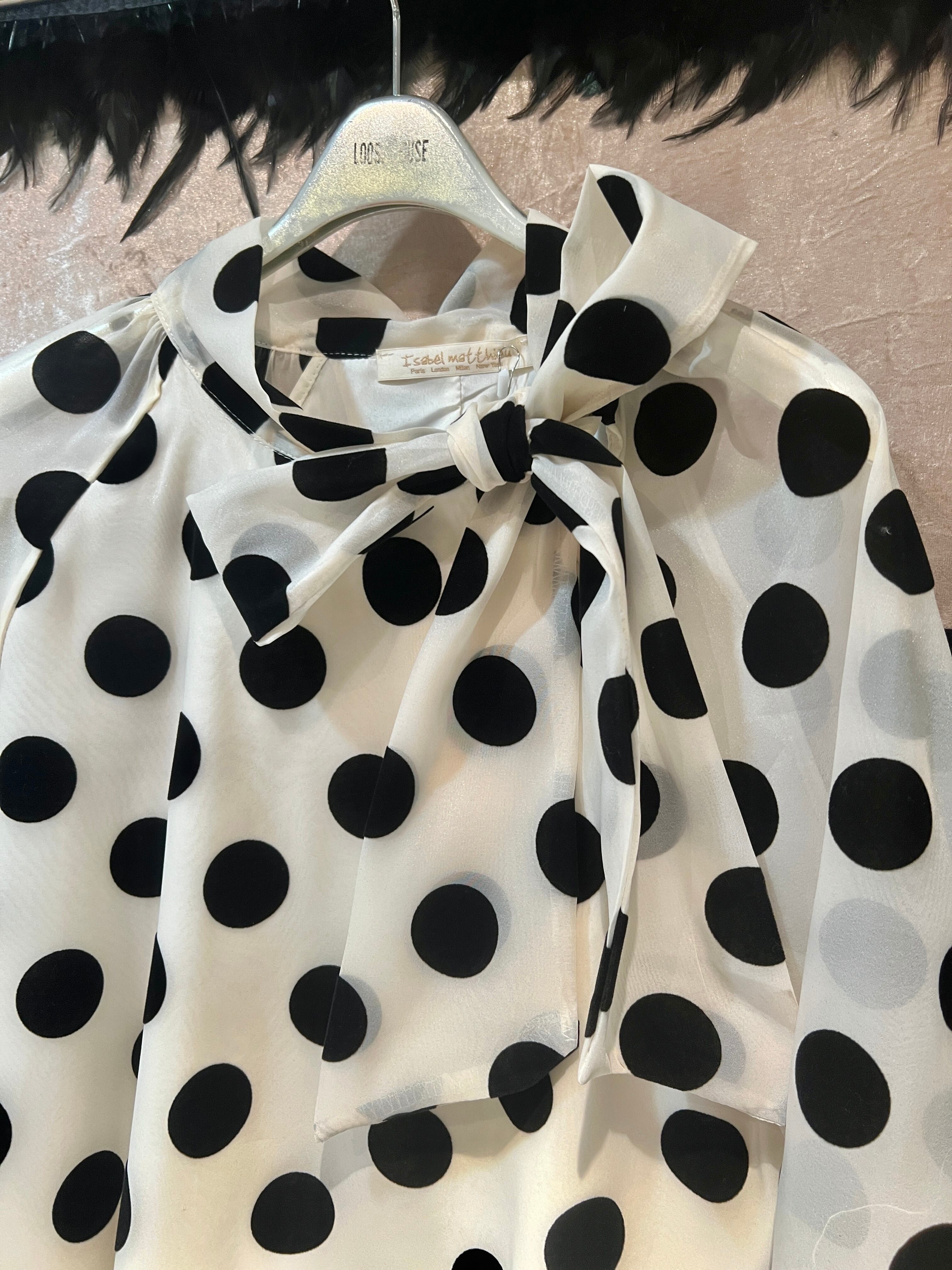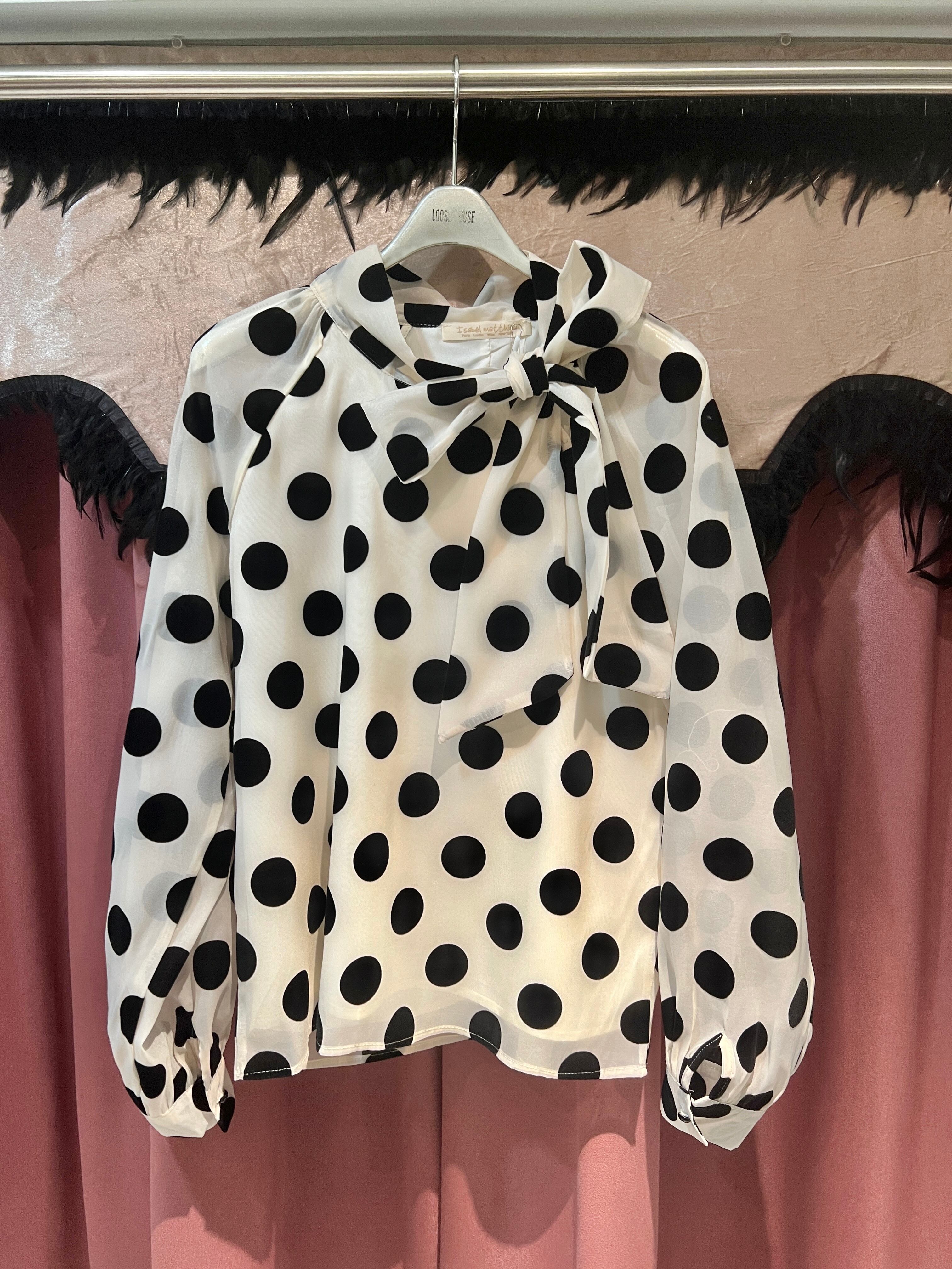 大胆なドット柄が目を引く、リボンタイ付きトップスブラウス。