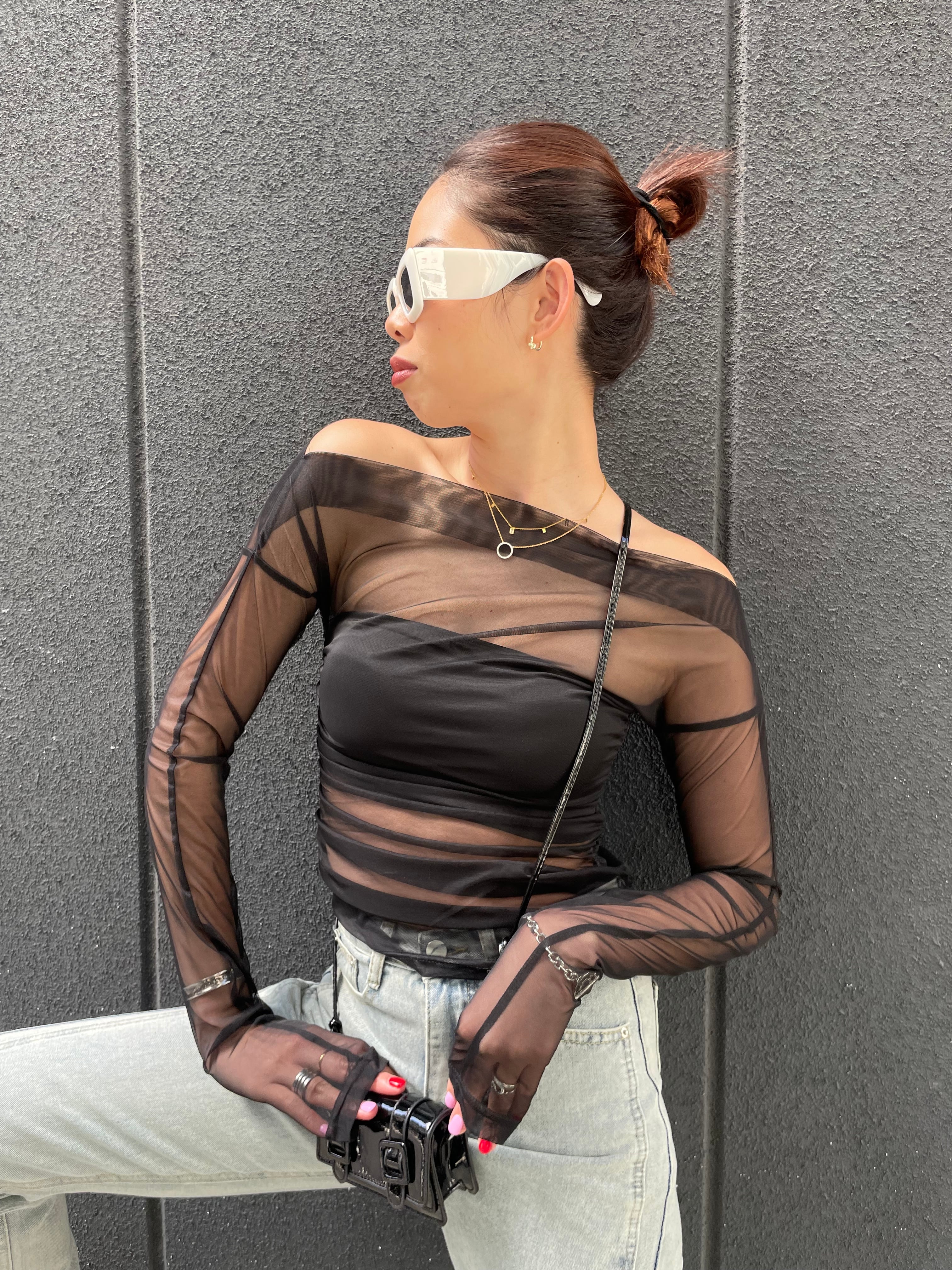肌を美しく見せるシースルーデザインと、オフショルダーで女性らしい魅力を引き立てるアイテム☆