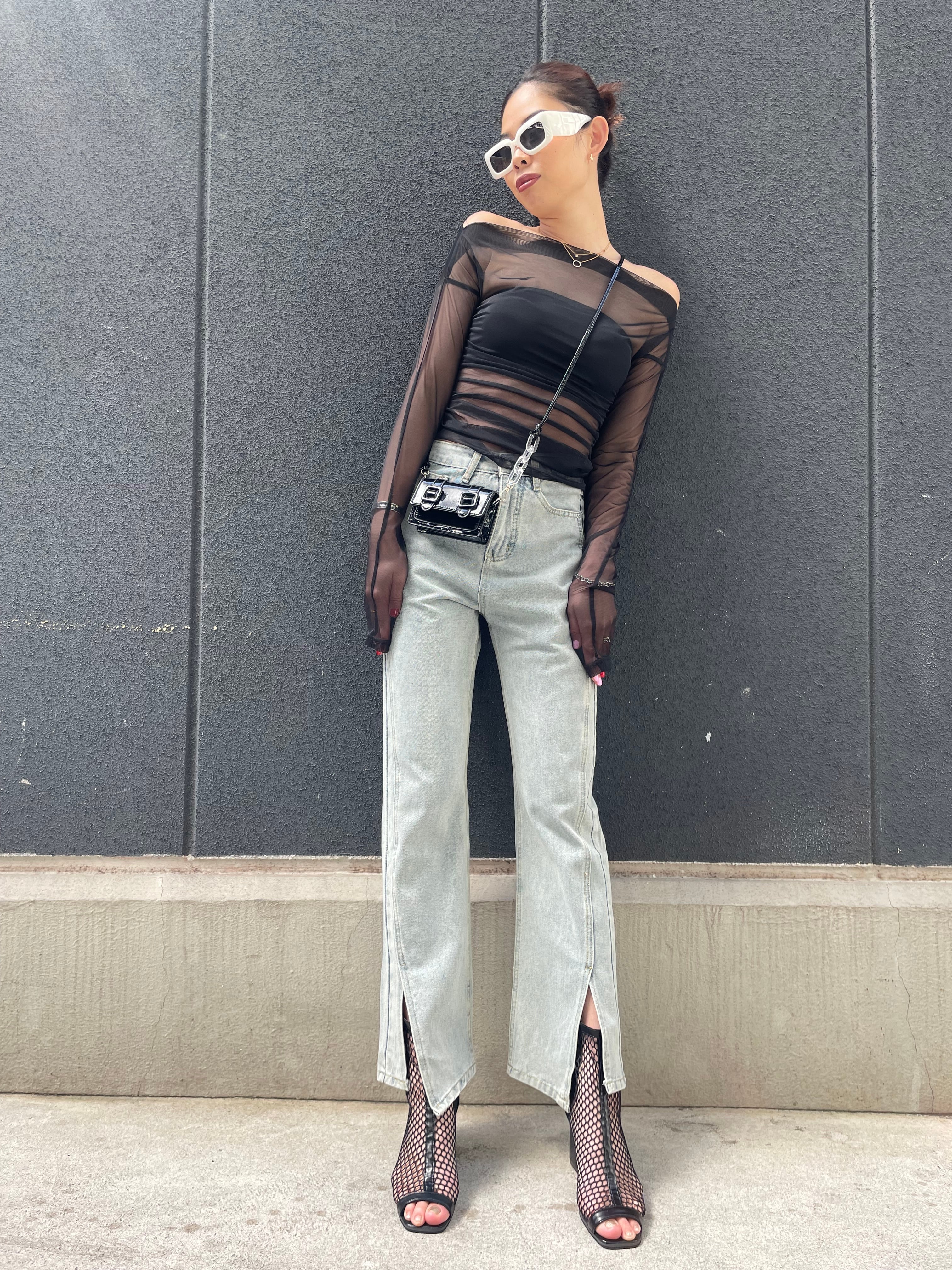 stretch mesh off-shoulder tops トップス メッシュ ストレッチ オフショルダー ベアトップ 2点セット シースルー 重ね着 ブラック 黒