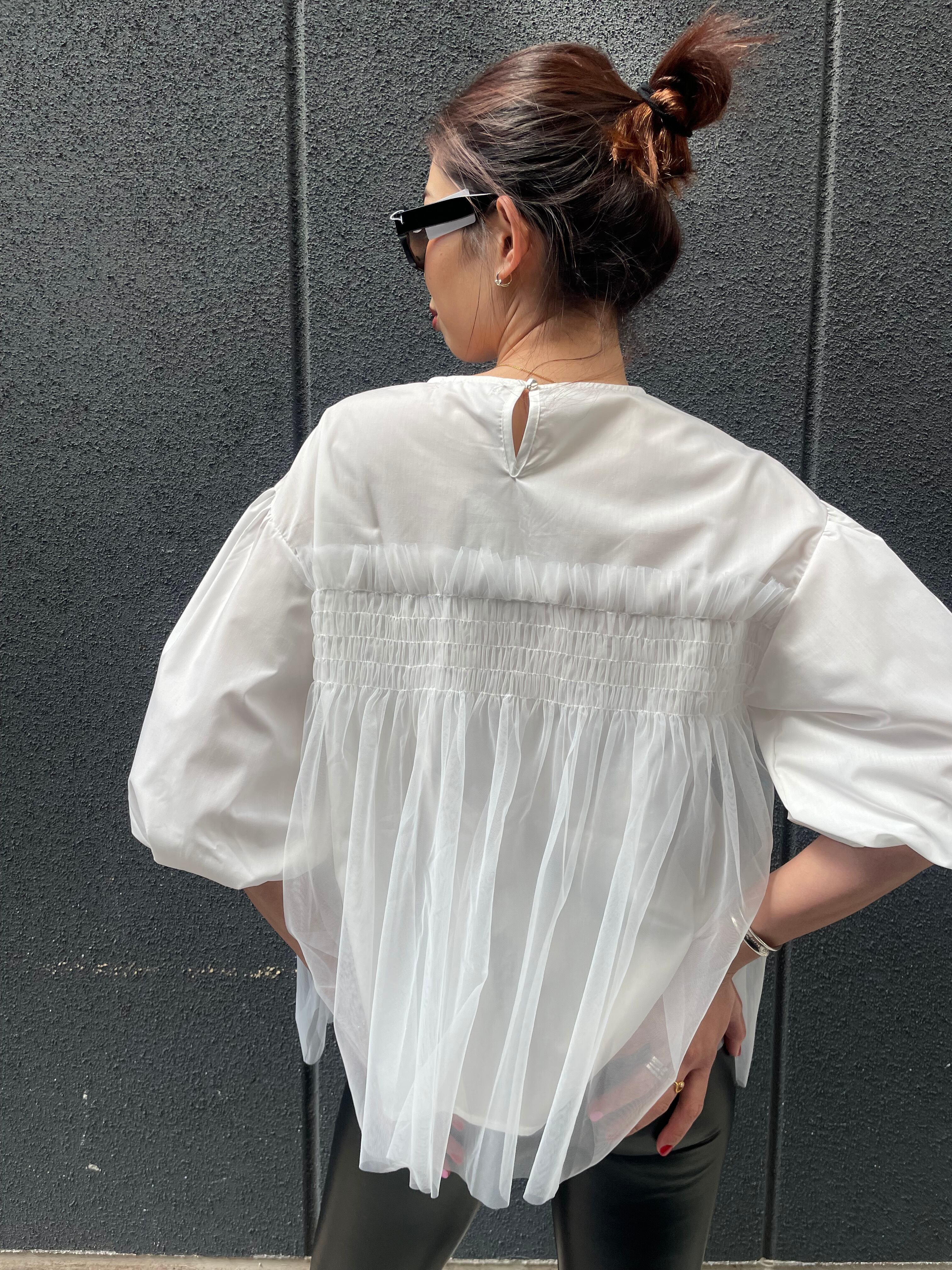tulle gather × balloon sleeve design tops トップス デザイントップス 布帛 チュール ギャザー バルーン