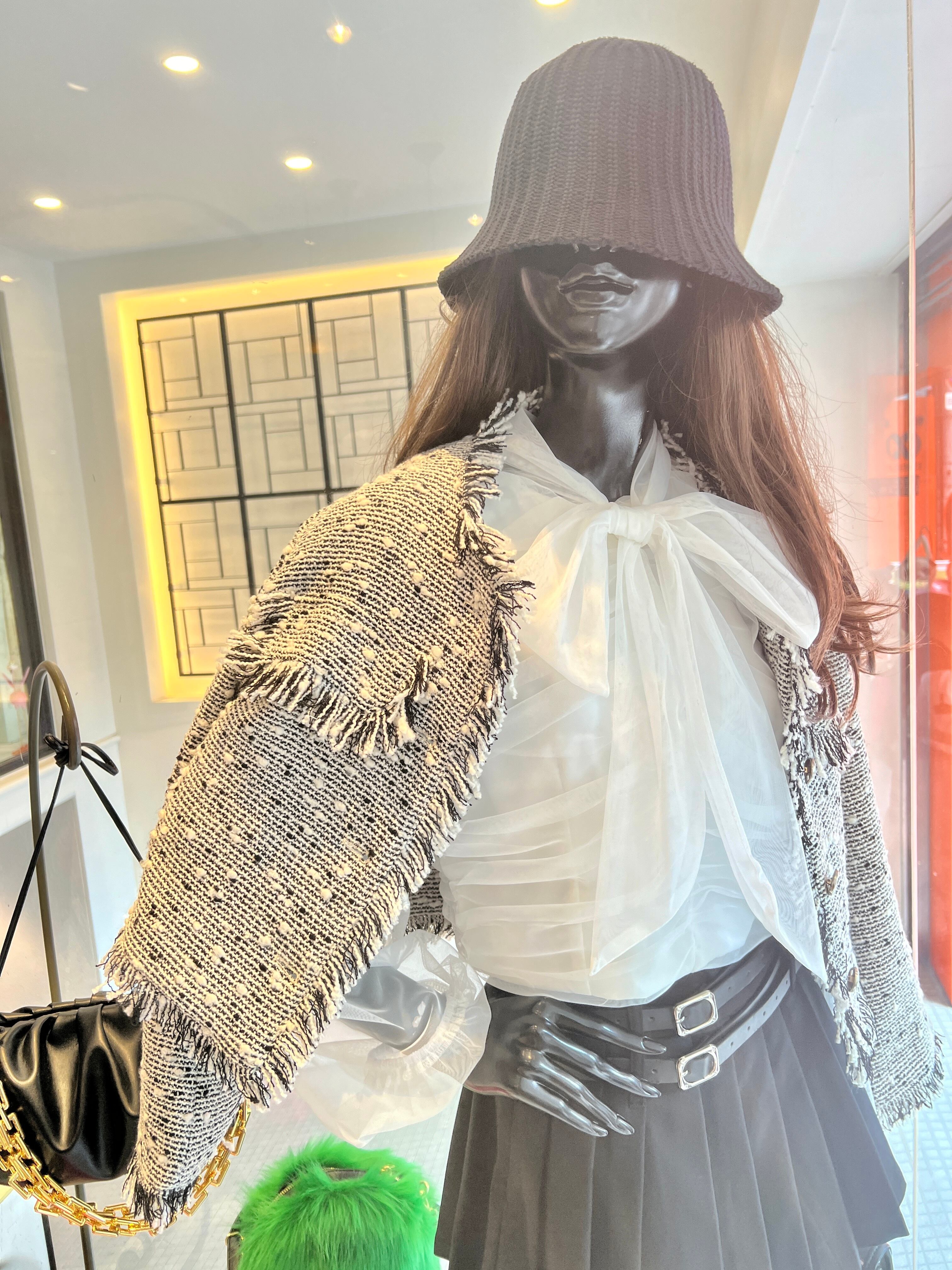 細かいツィードの編み目が上品で、フリンジが施された裾がさりげないアクセントになっています。どんなスタイルにも合わせやすく、オン・オフの着回しに大活躍間違いなし!