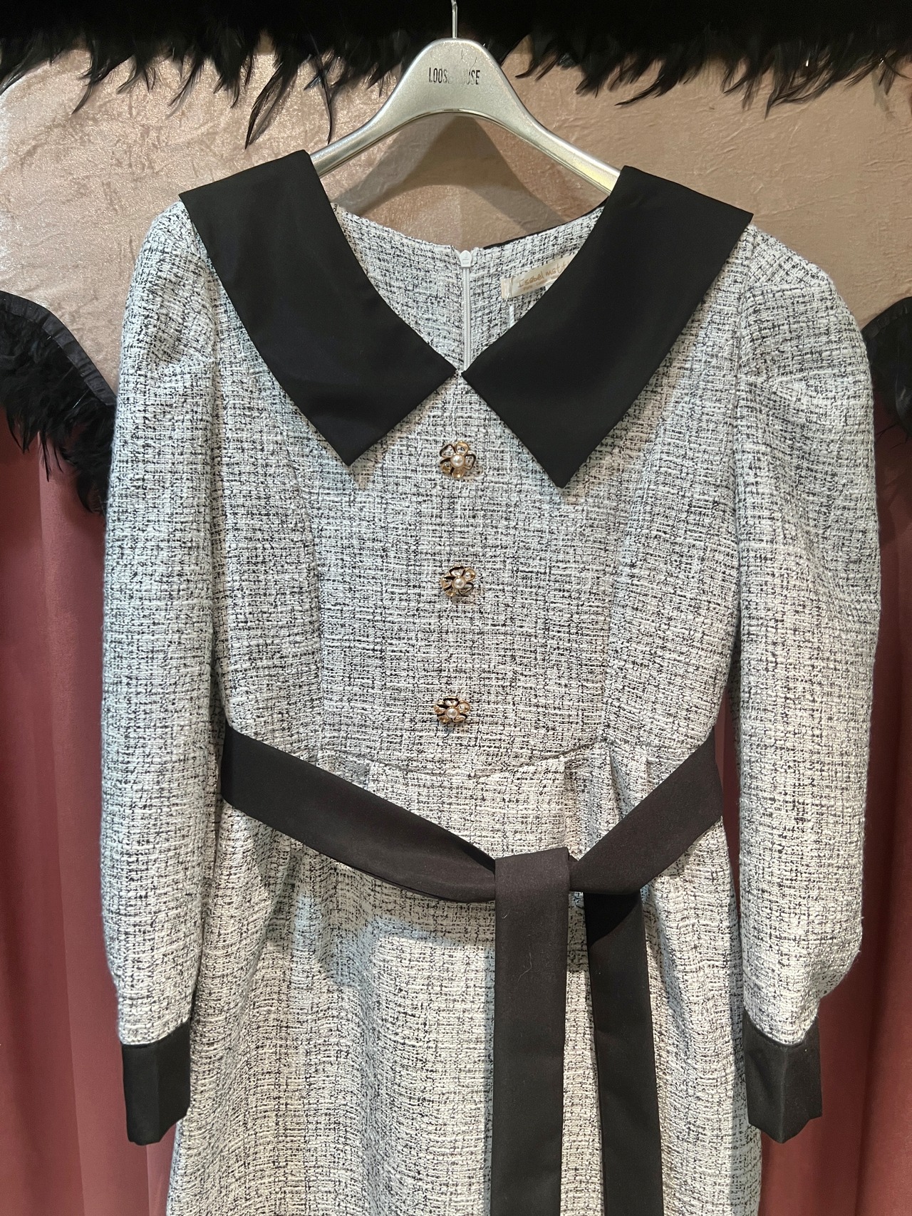 tweed ribbon waist design one-piece ワンピース ワンピ ツィード 切替デザイン リボン