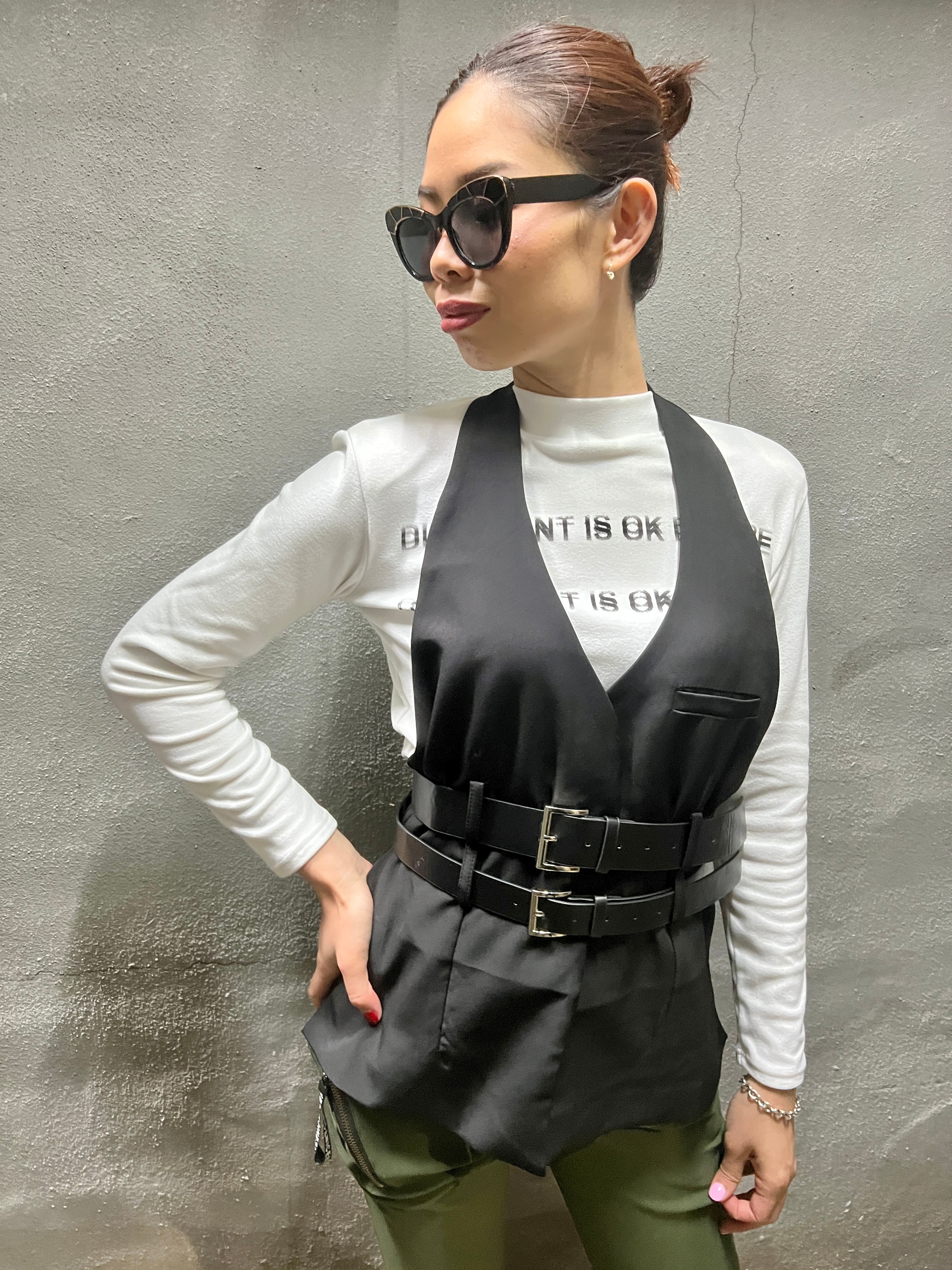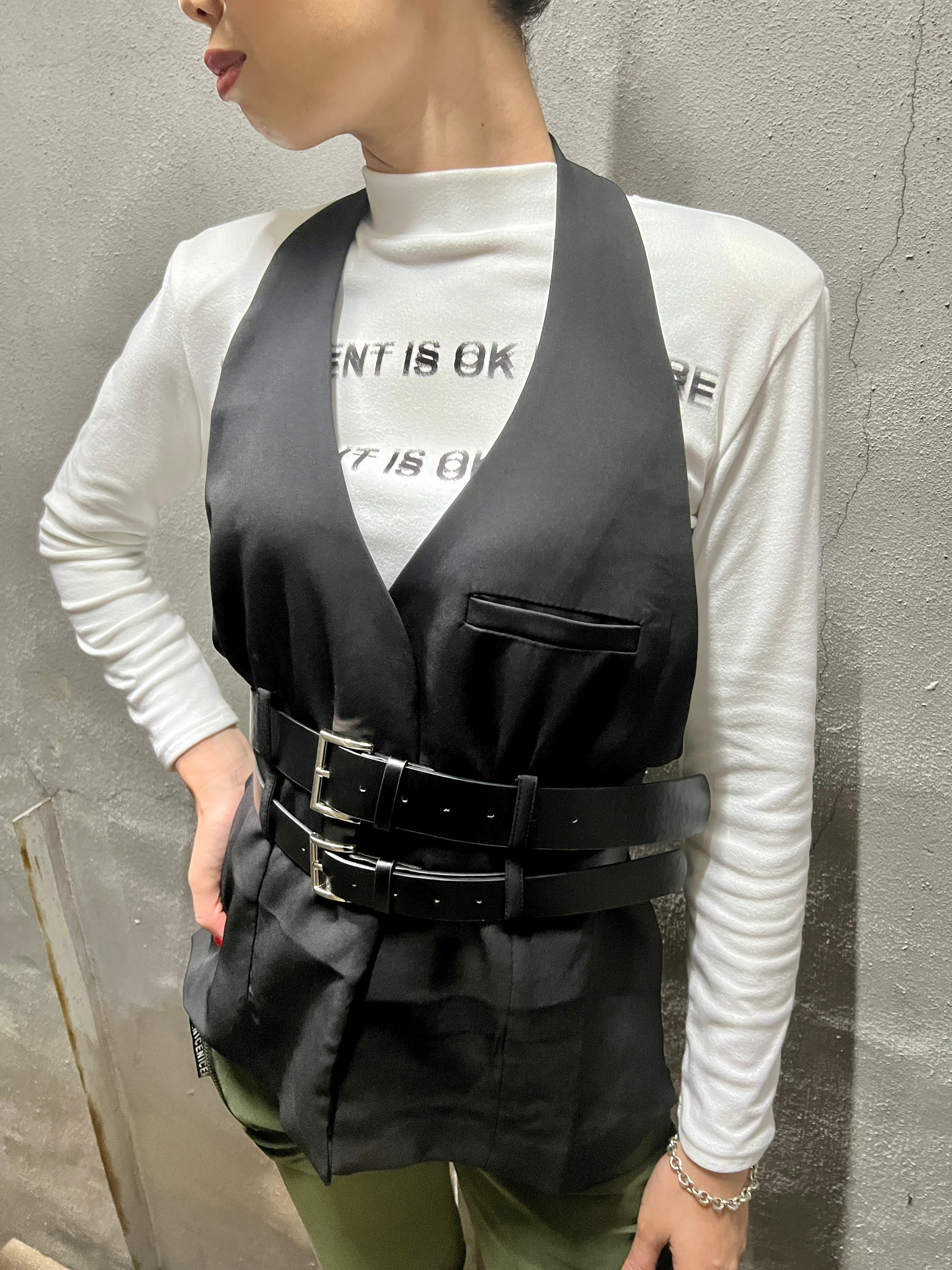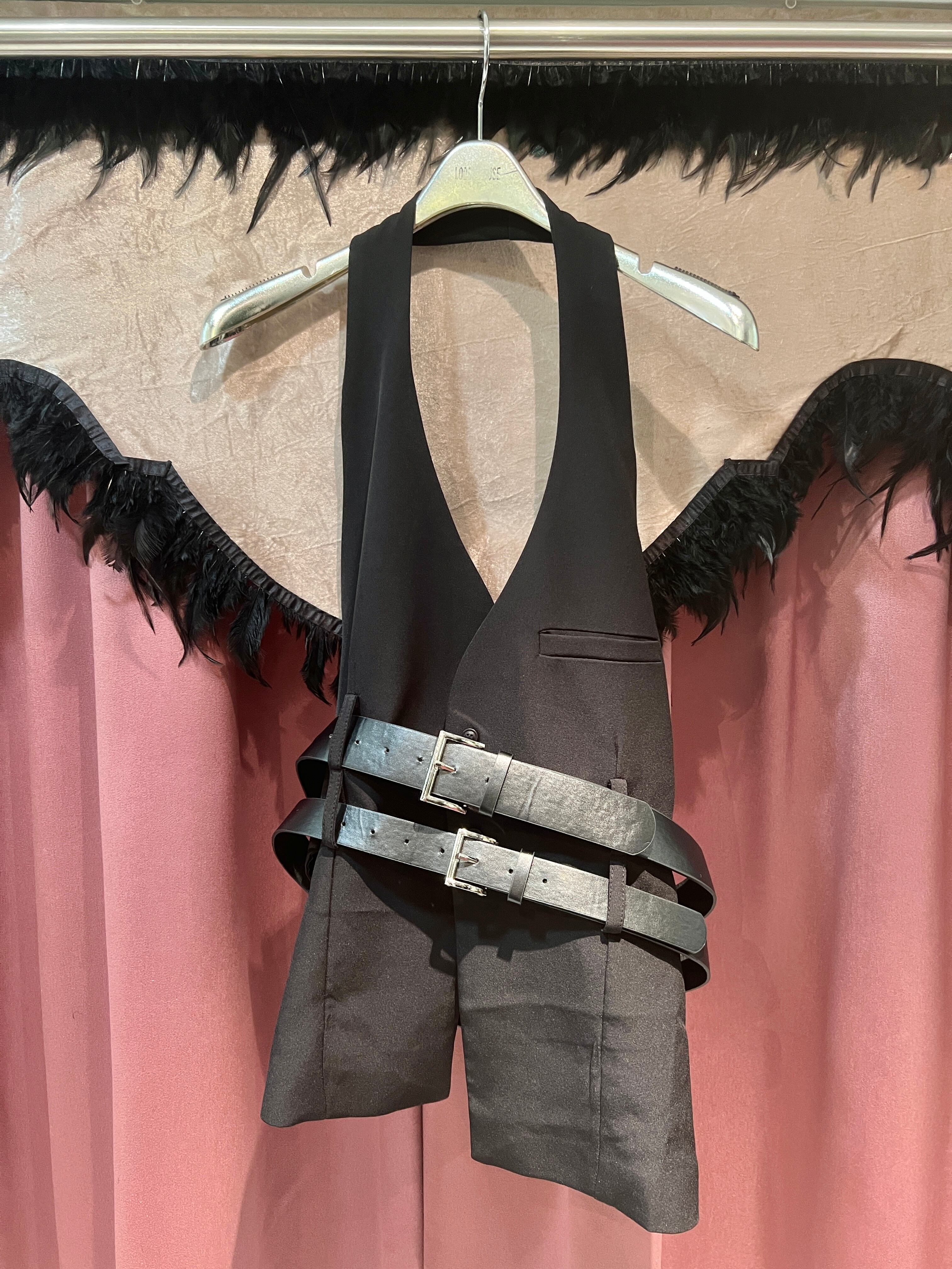 【再入荷】2belt holder neck design vest ベスト デザインベスト ホルターネック ベルト ブラック 黒