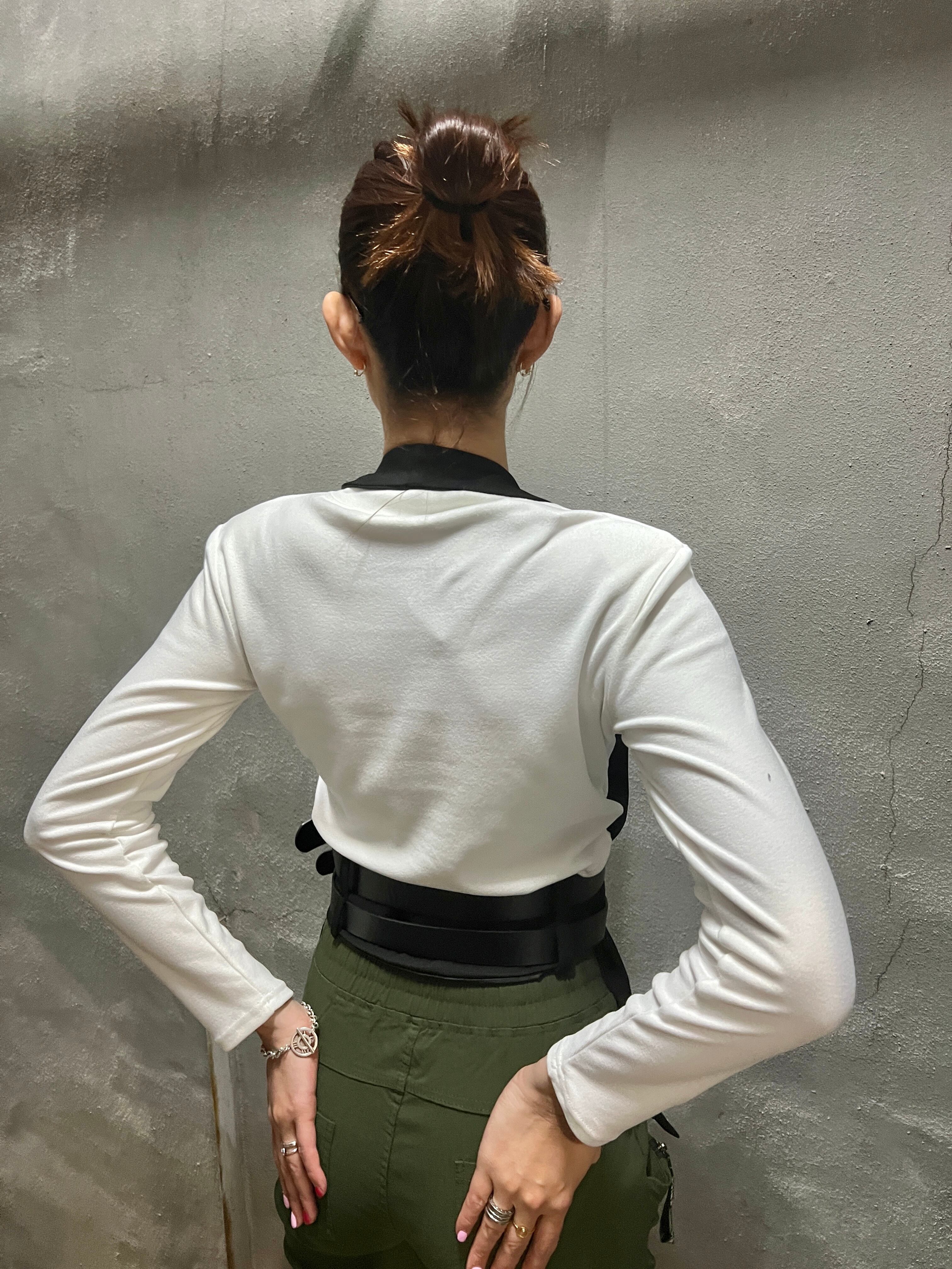ホルターネックのデザインが首元を美しく魅せ、2本のベルトがアクセントとなった個性的なデザインが特徴です。重ね着スタイルにも相性抜群で、コーディネートの幅が広がります。